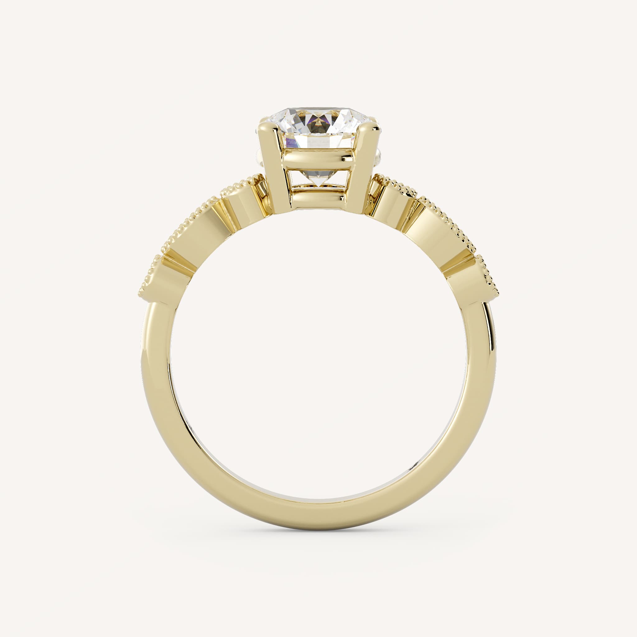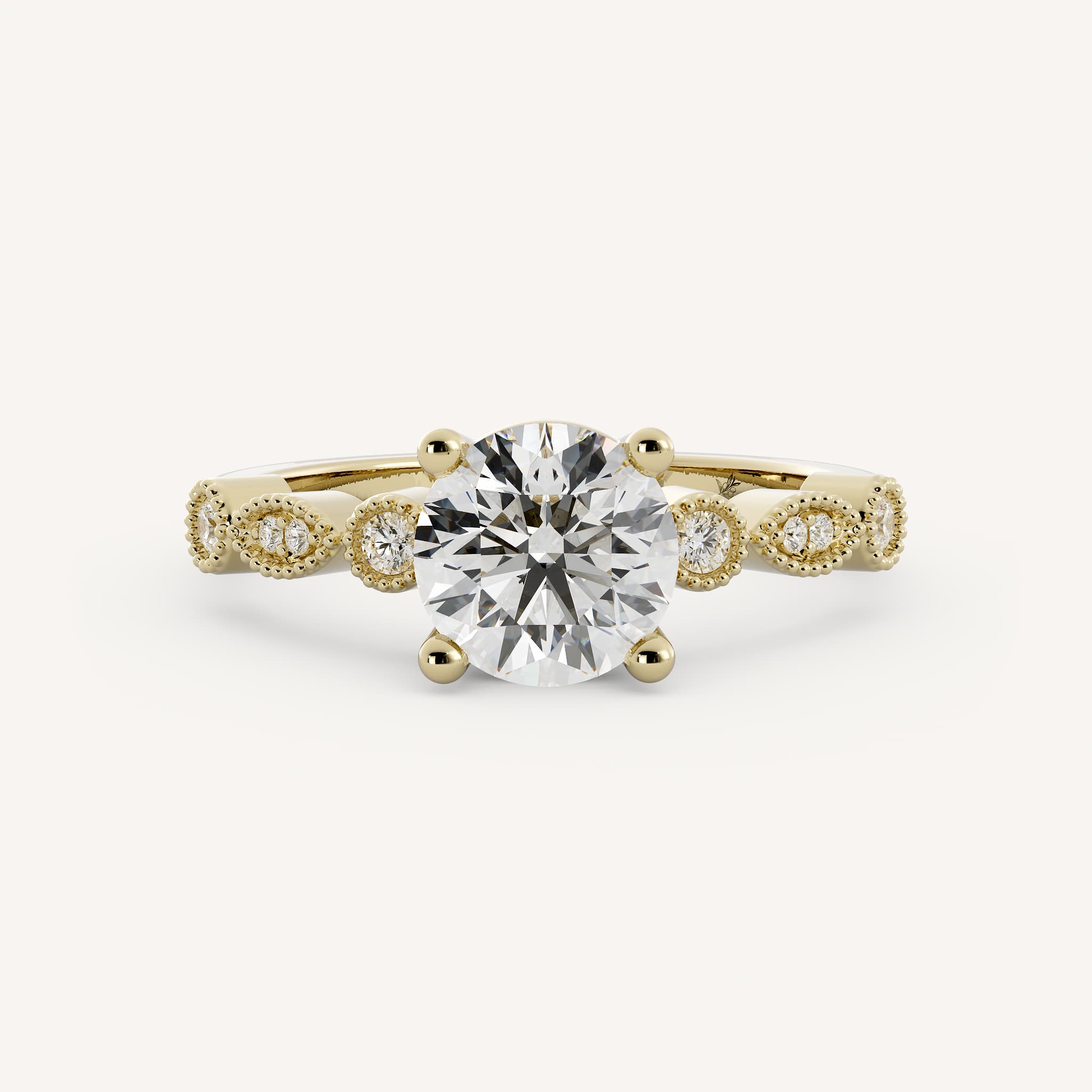 Addison features a round center stone and accent stones set in a vintage inspired bezel shank with milgrain detail.
