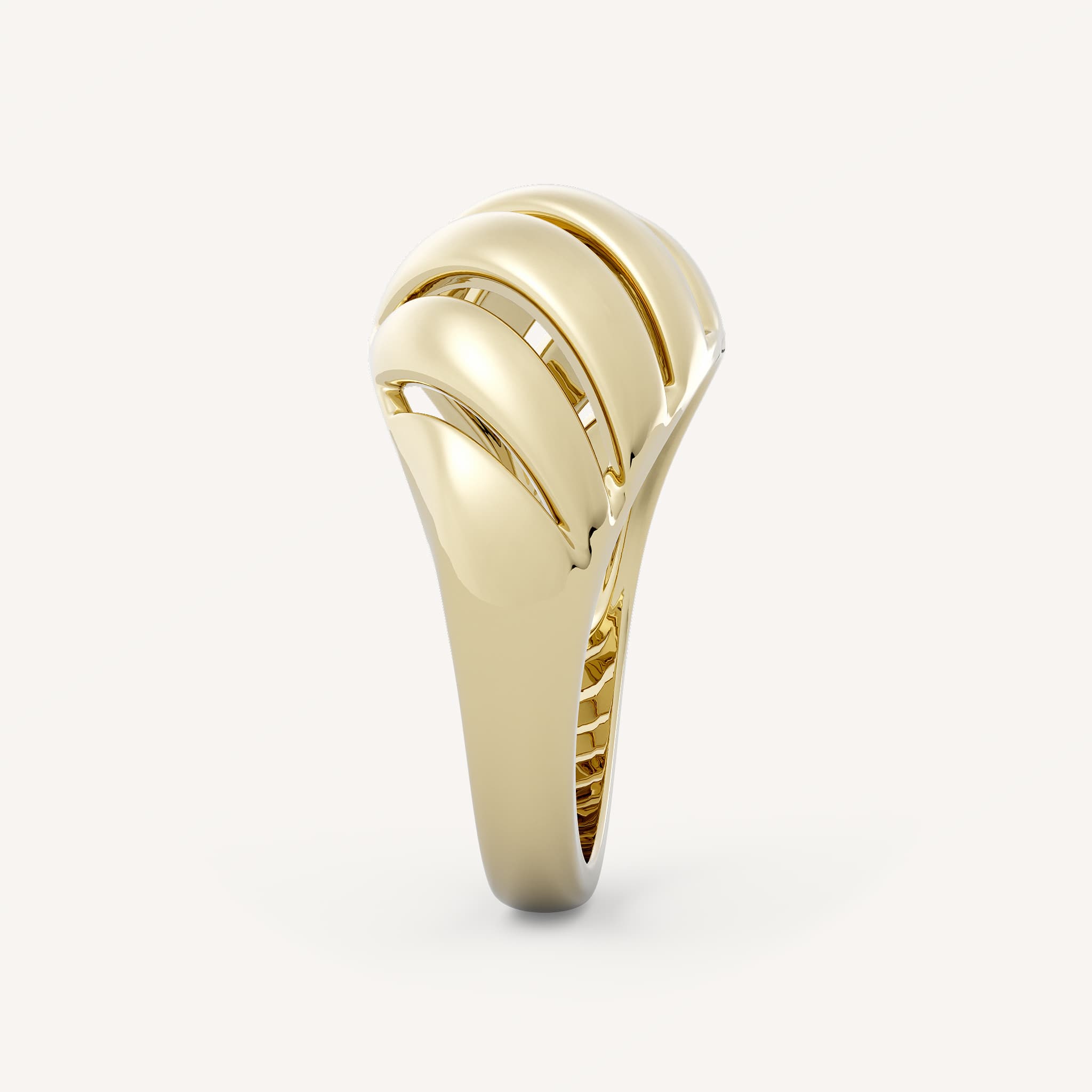 Annie features a tapered dome shaped band with gold detail and negative space.