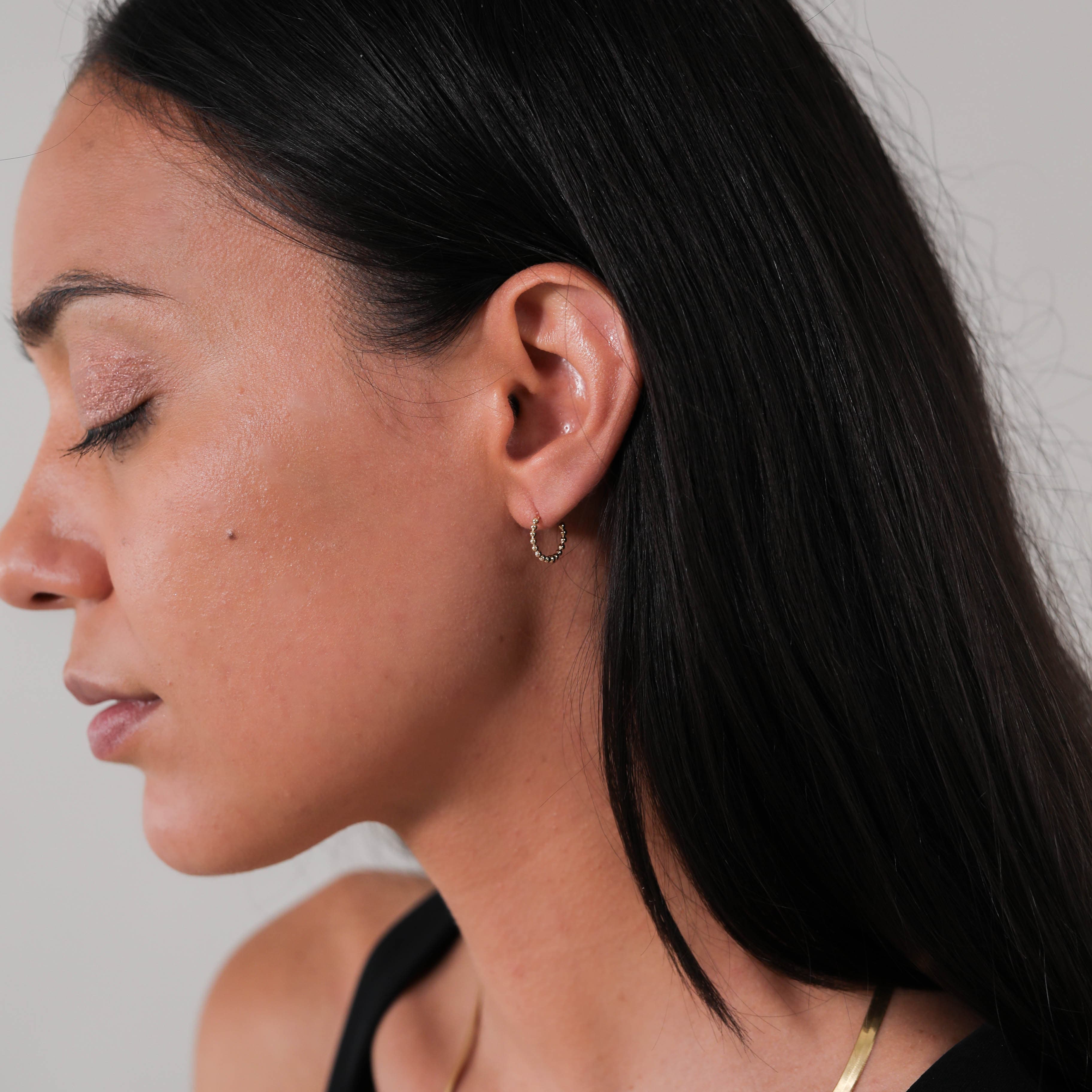 A dainty diversion from a traditional hoop, the Beaded Huggies are 11mm in diameter and showcase 14K gold beads held together by a lasting hinge back.