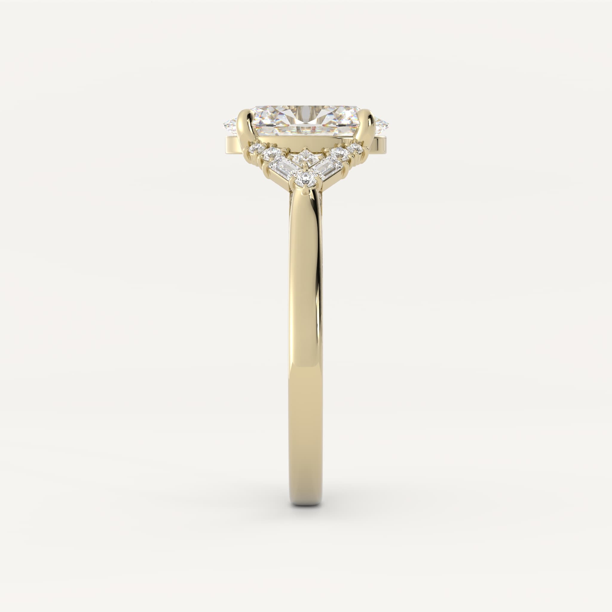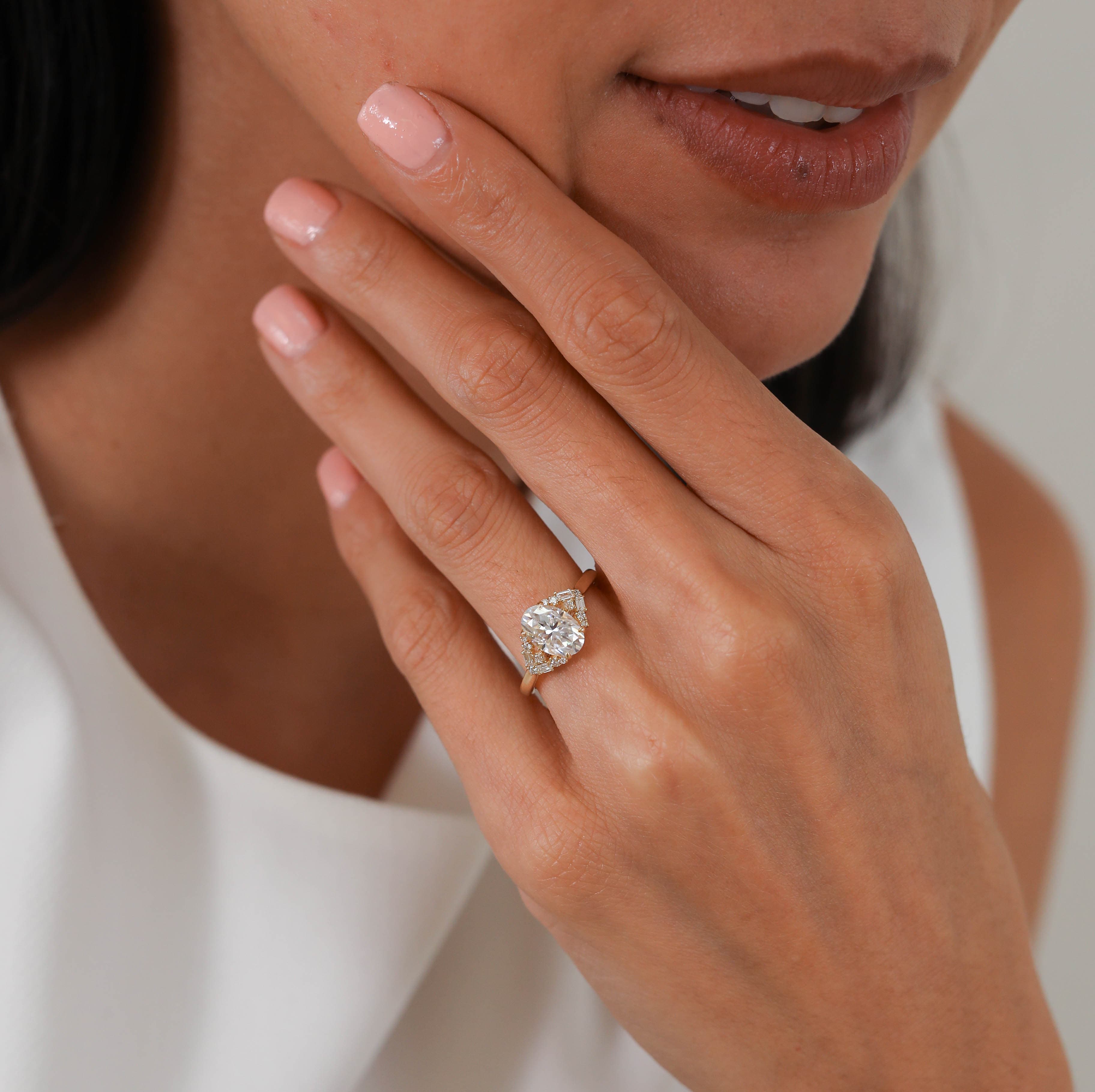 Beckett features an elongated oval center stone with a cluster of round, baguette and princess accent stones a cathedral setting on a half round shank.