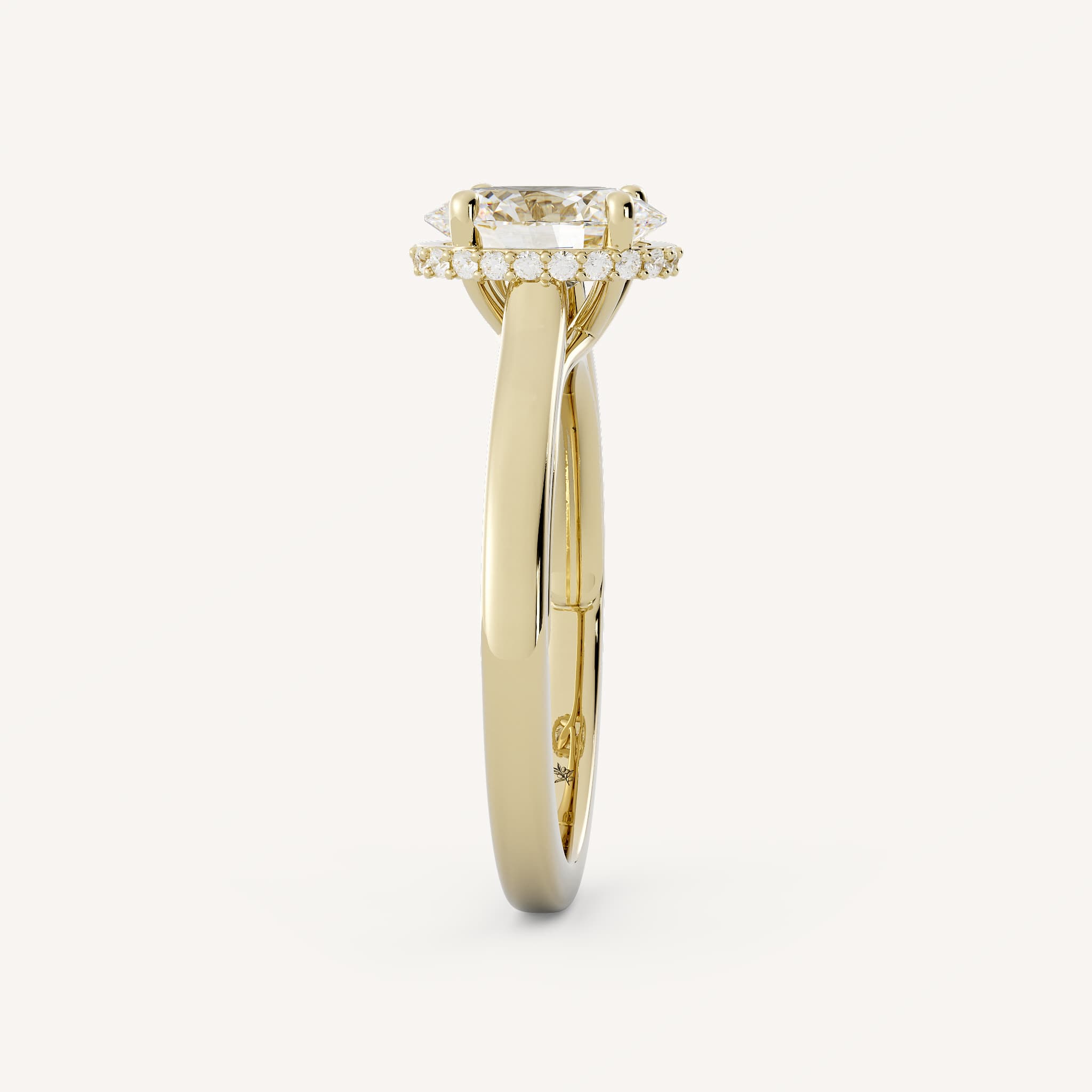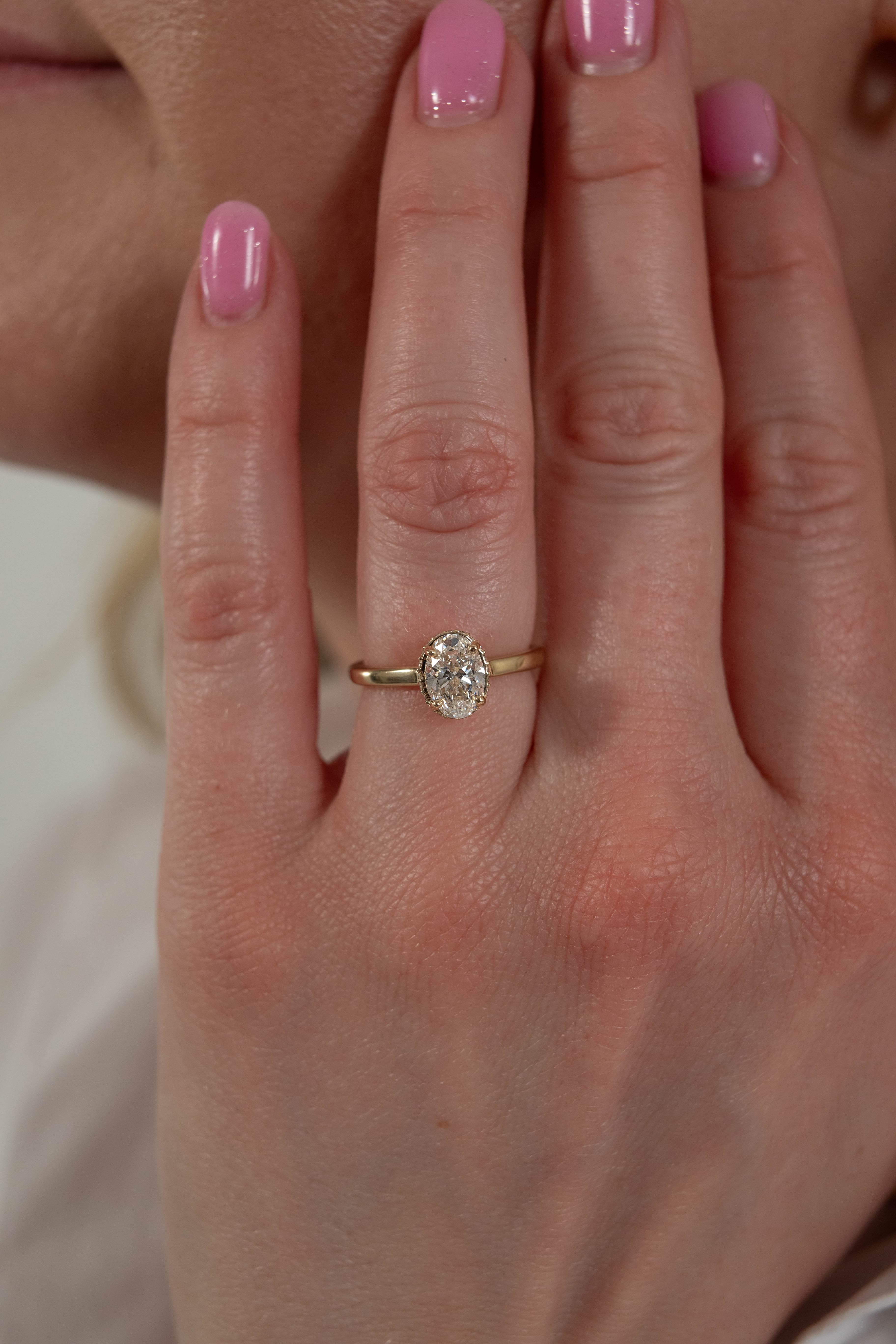 Beth features an oval center stone set in a beautiful cathedral setting with a hidden halo on a half round flat edge shank.