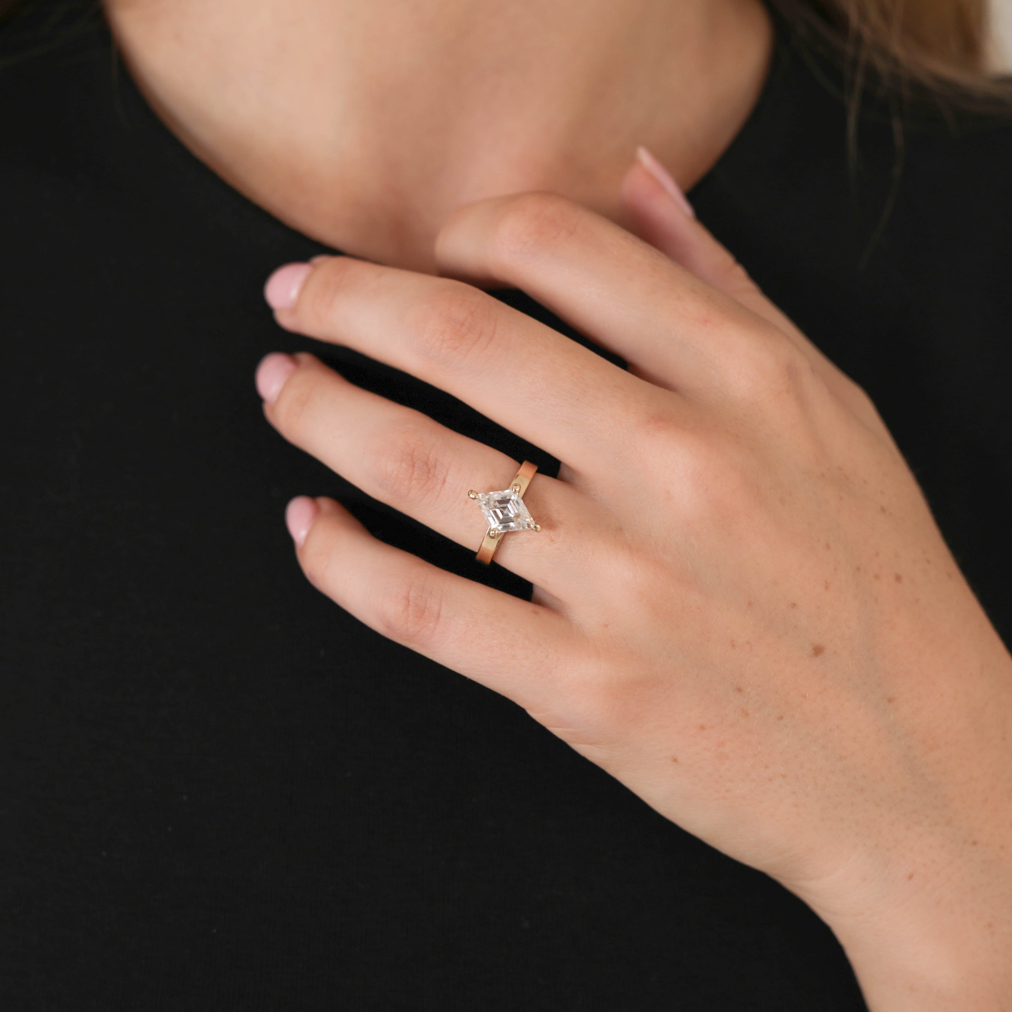 Bex features a lozenge shaped center stone set in a traditional solitaire setting with a thick flat shank.