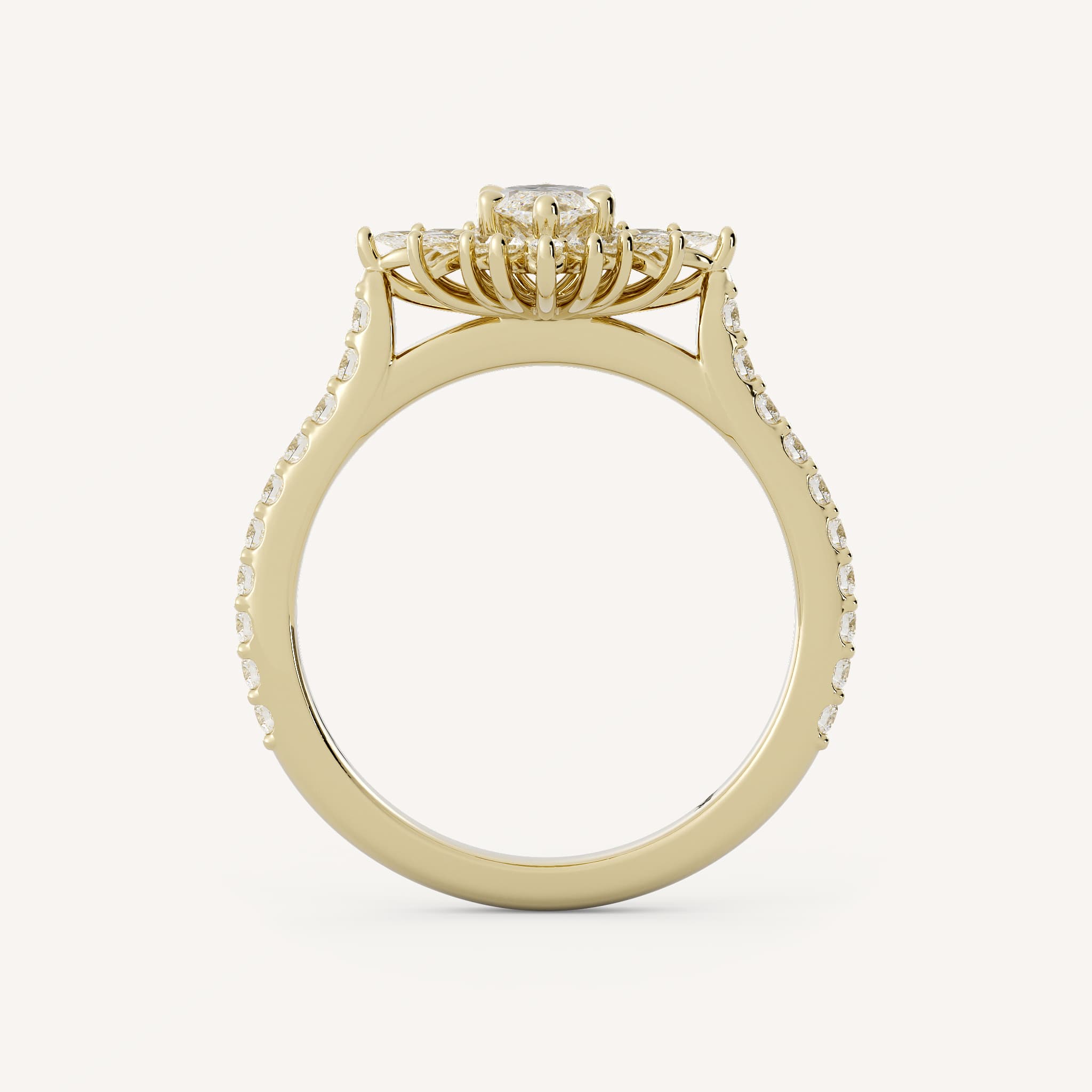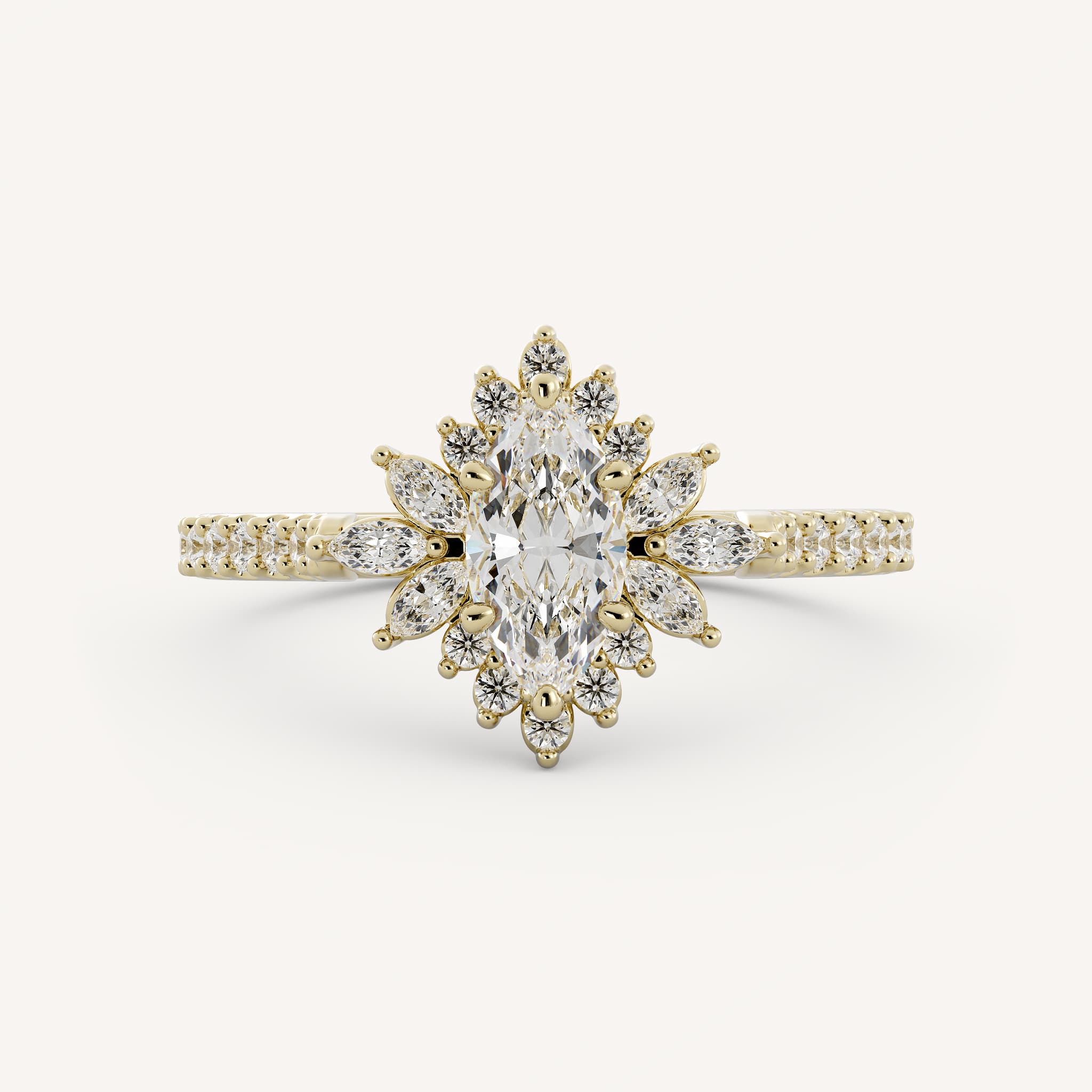 Birdy features a marquise center stone with a charming burst halo of marquise and round stones. Set in a cathedral basket on a scallop prong shank.