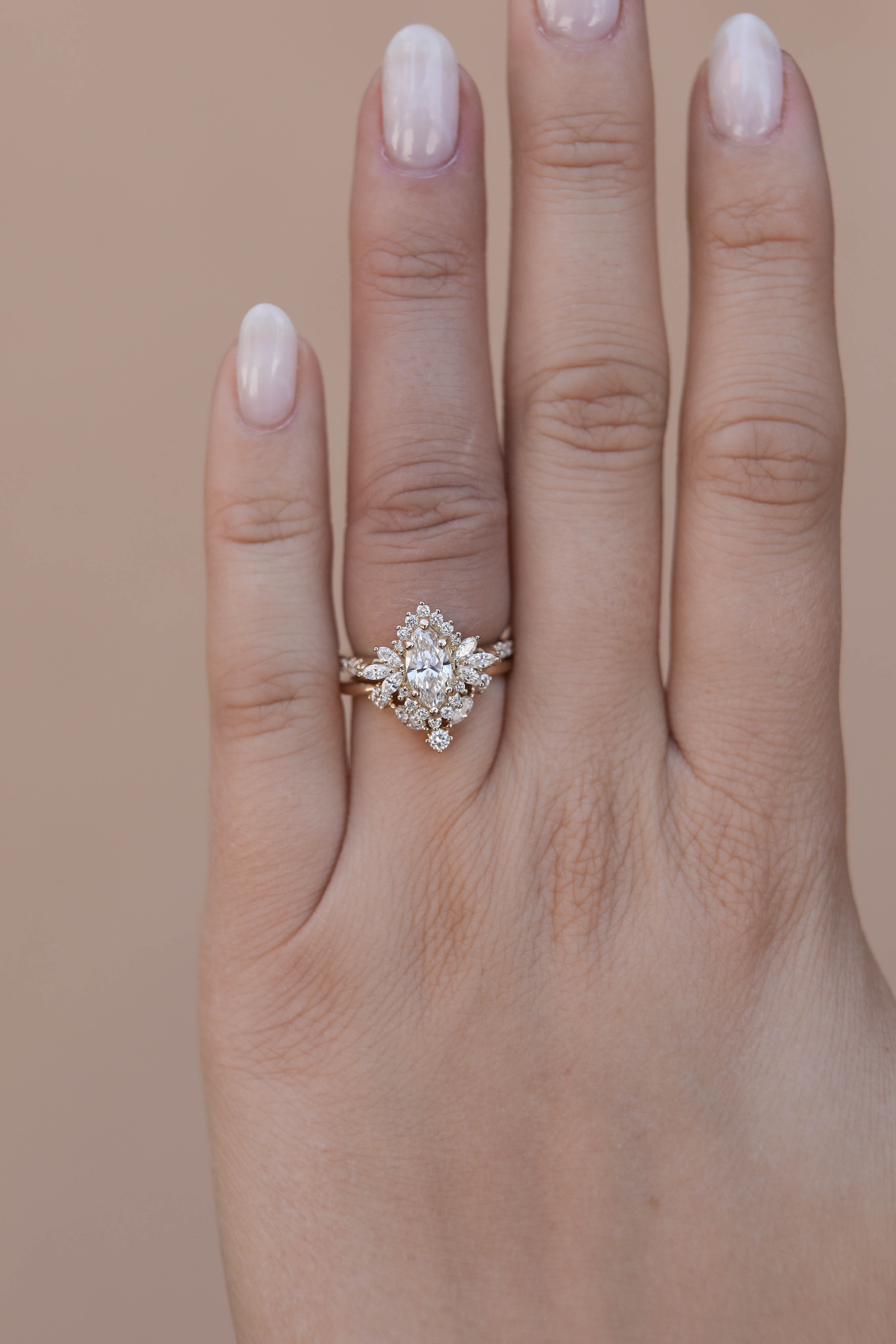 Birdy features a marquise center stone with a charming burst halo of marquise and round stones. Set in a cathedral basket on a scallop prong shank. Paired with our Willie band that features a dramatic v-shaped contour shank with round and marquise set stones.