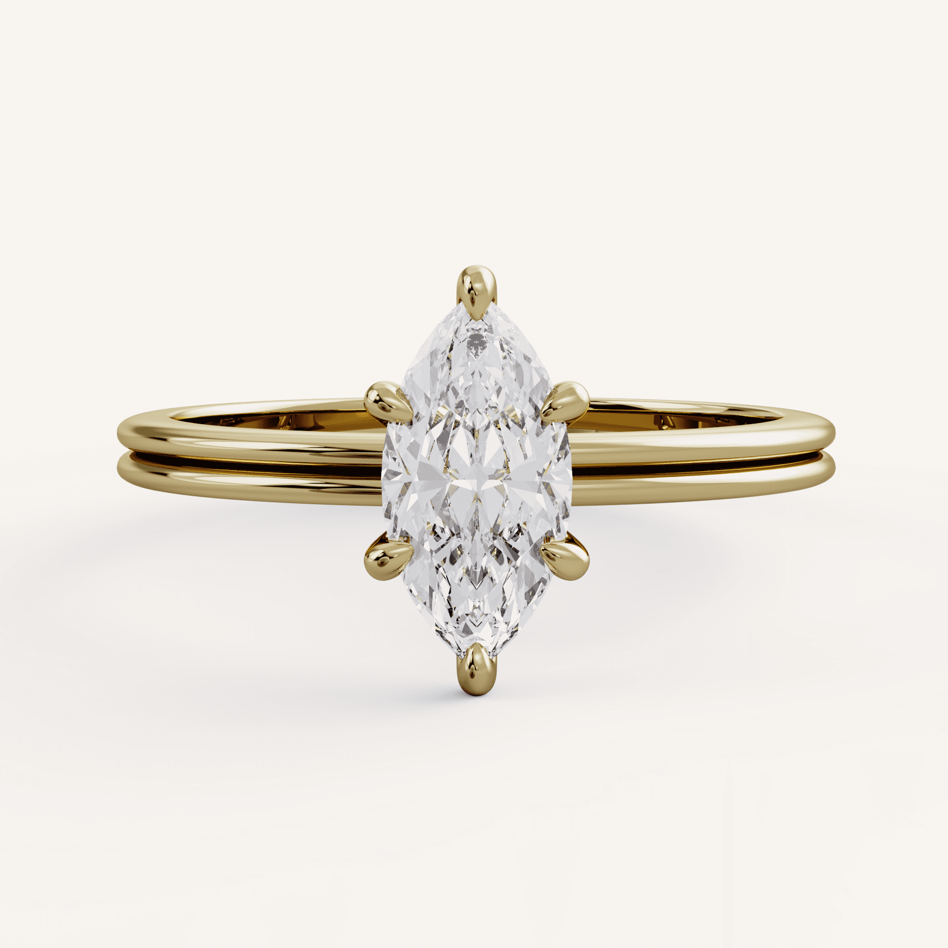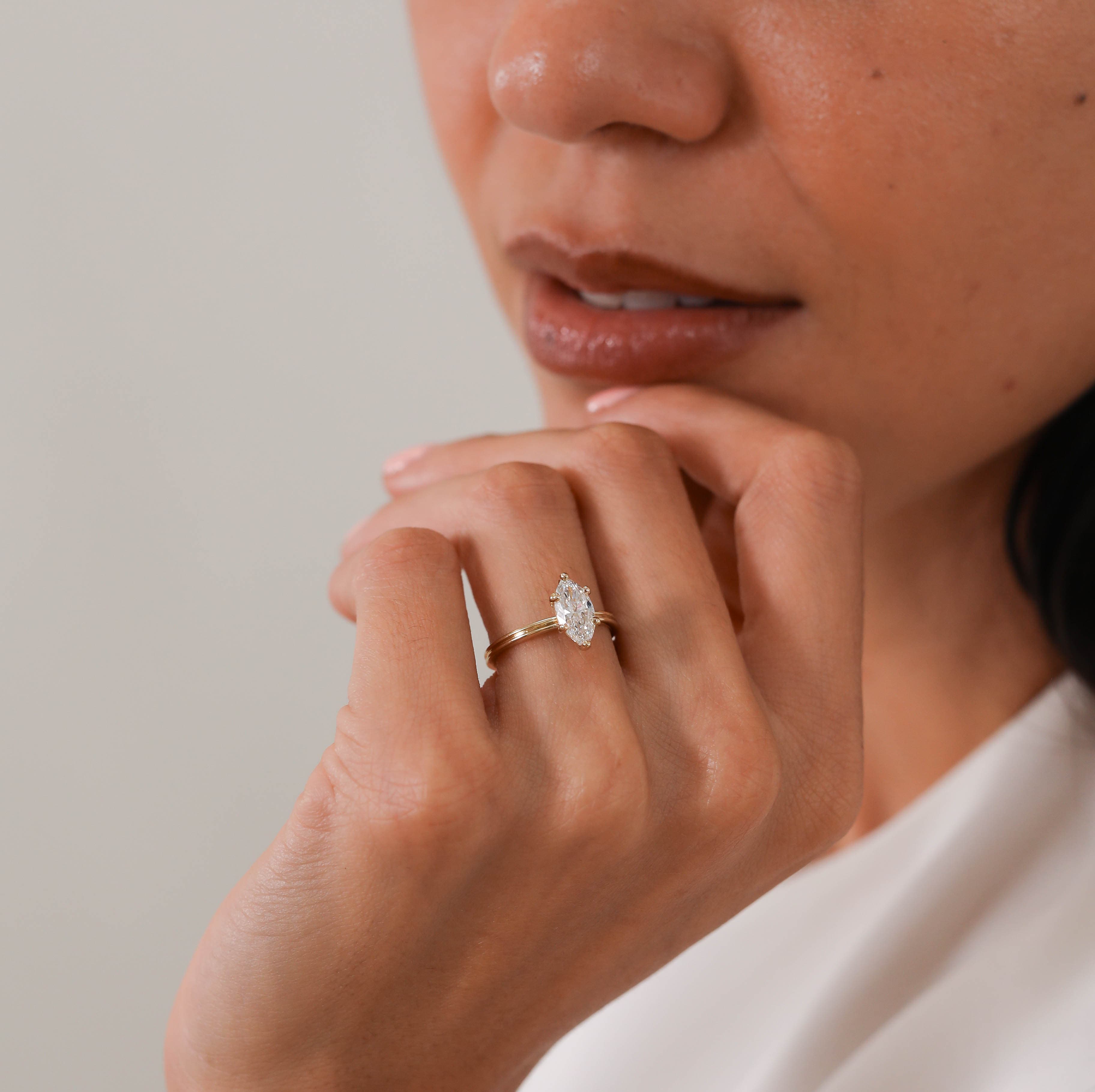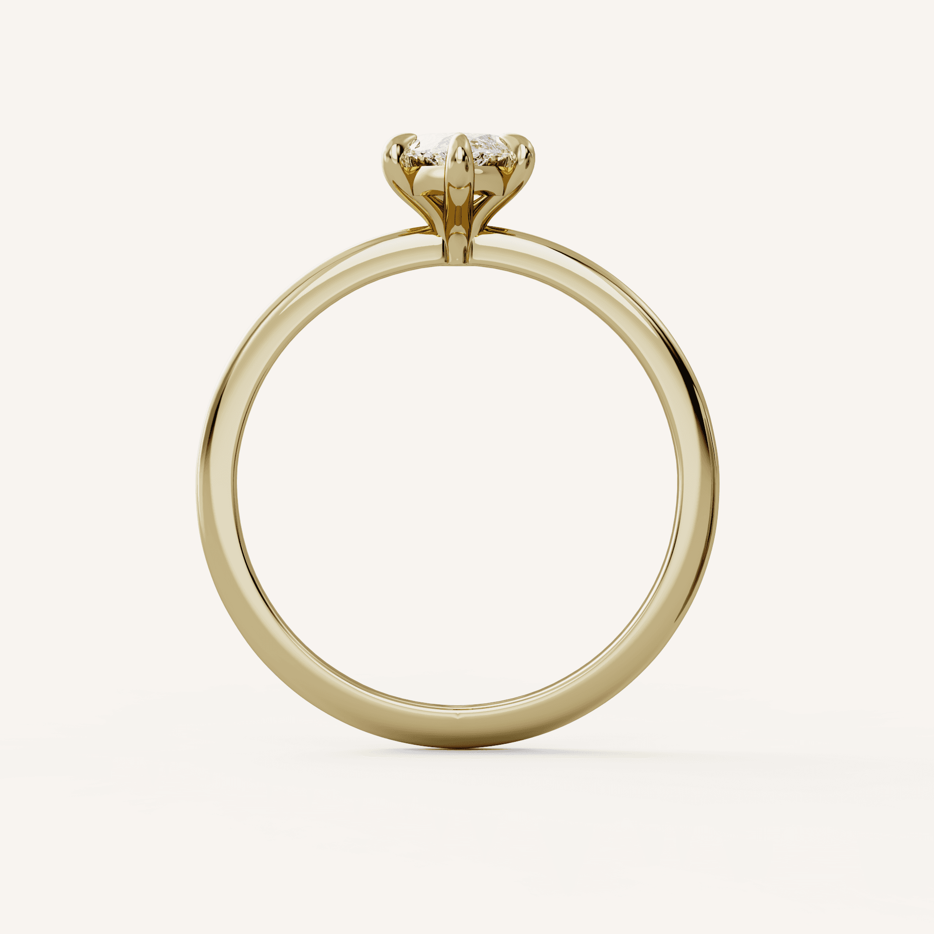 Campbell features a marquise shaped center stone set in a traditional solitaire setting with a detailed grooved shank.