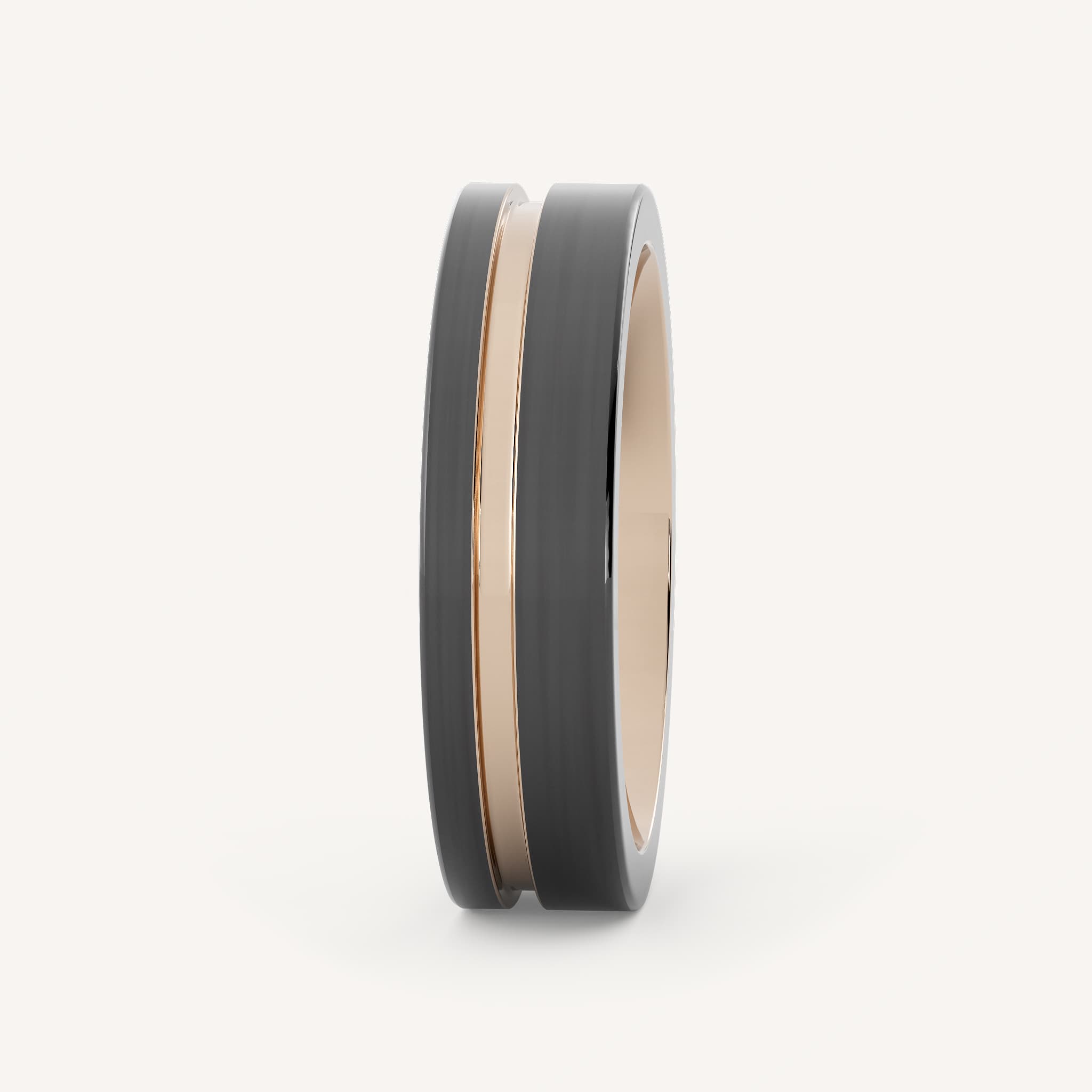 Cap is an striking tungsten band made with a comfort fit that features 18k Rose Gold plating on the inside of the band as well as a groove on the outside of the band. Offered in two widths.