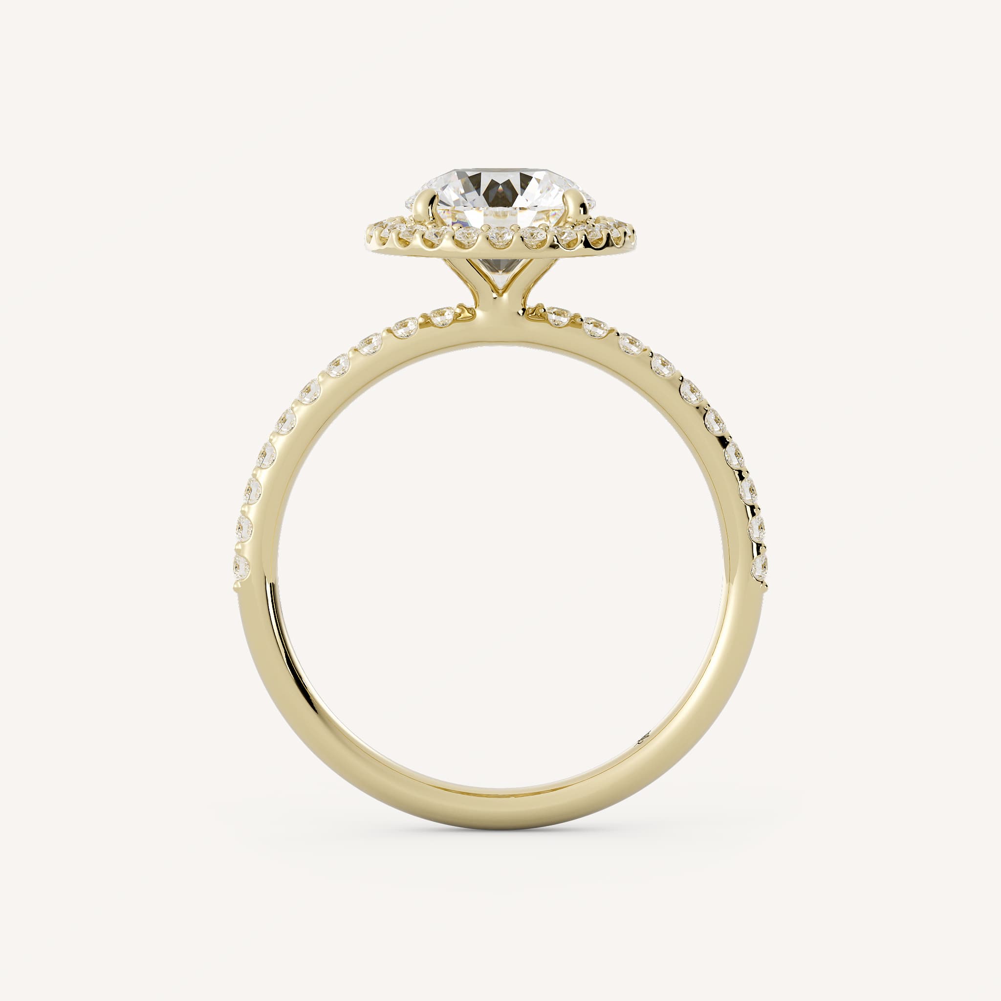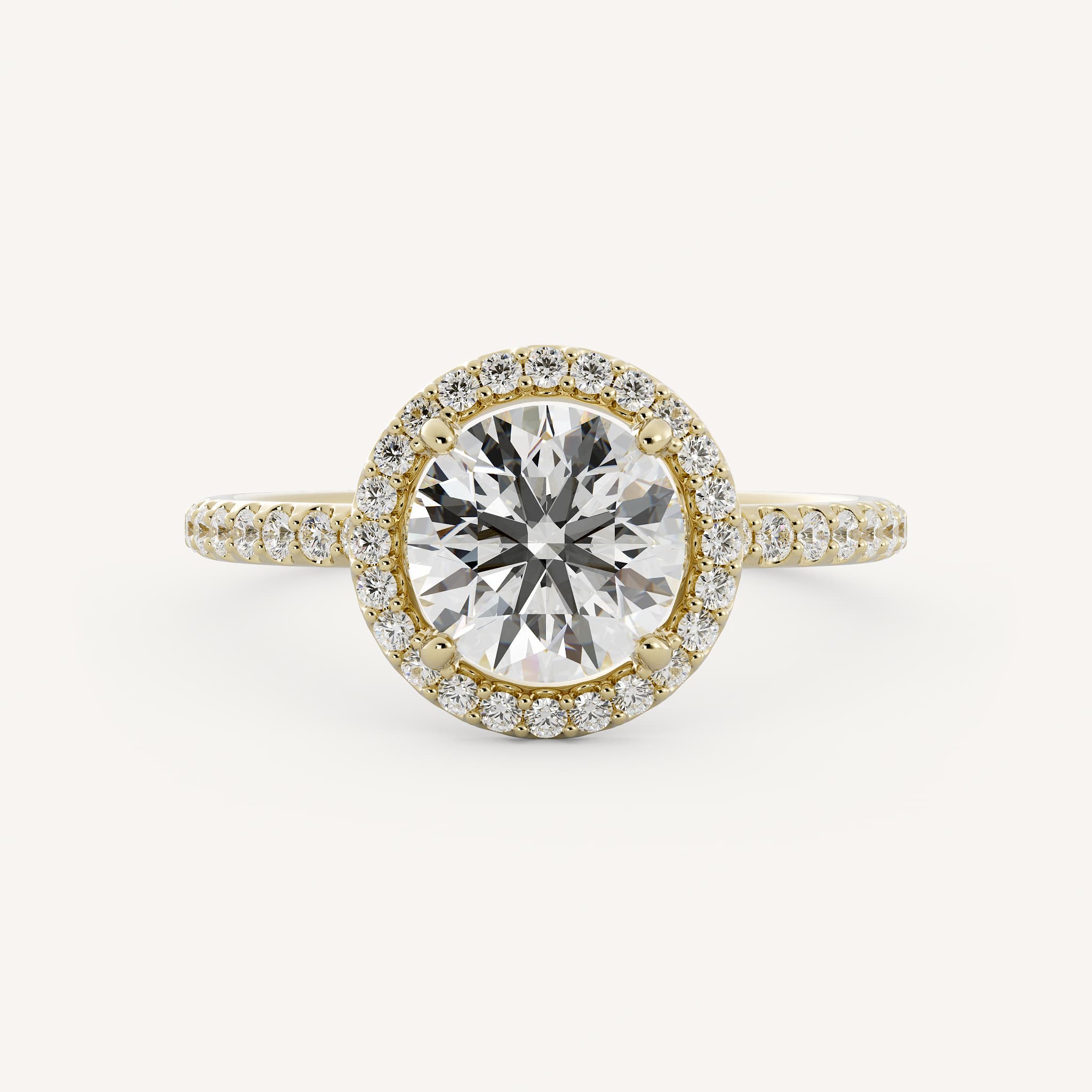 Chandler features a round center stone set in a traditional setting with a perfect classic halo and scallop prong set shank.
