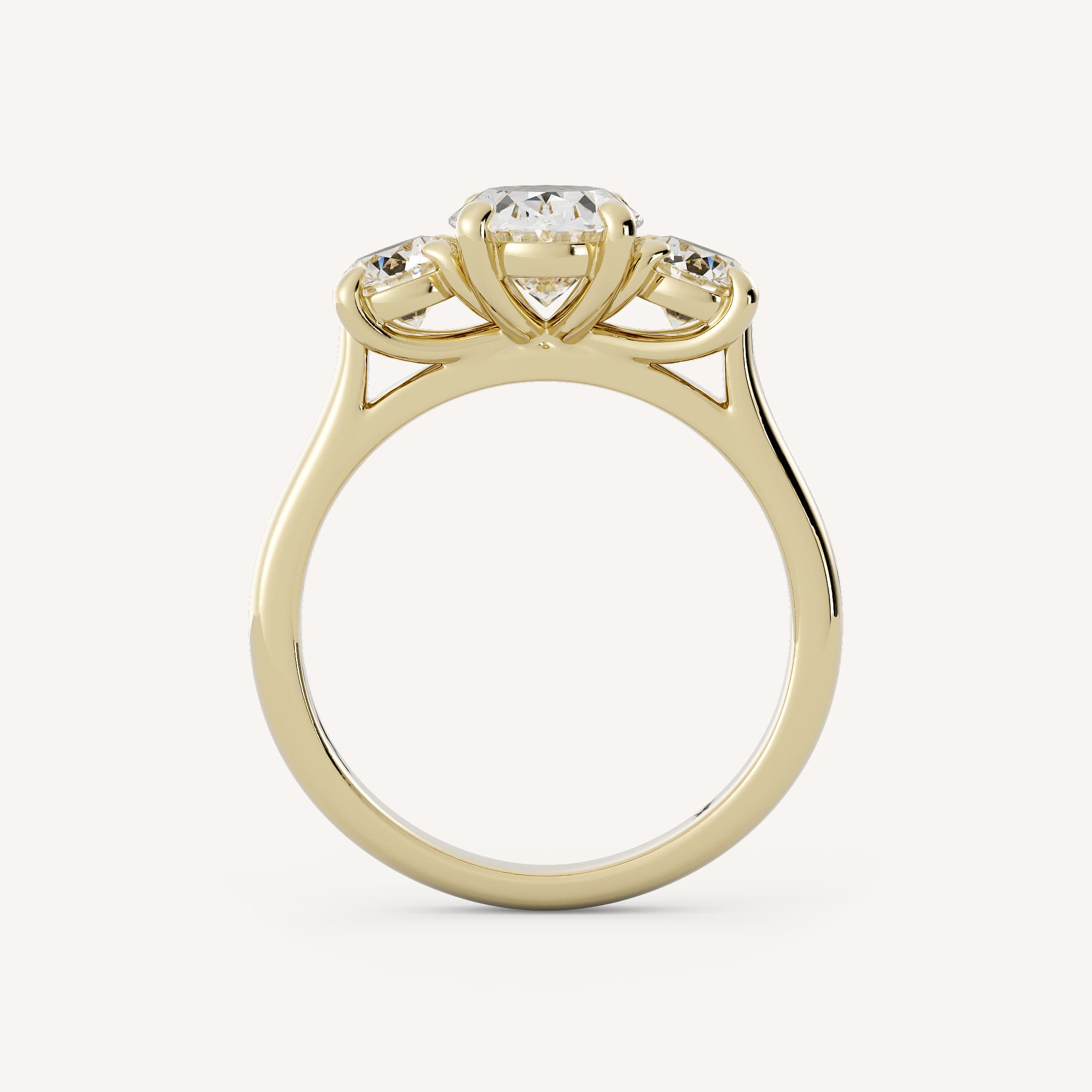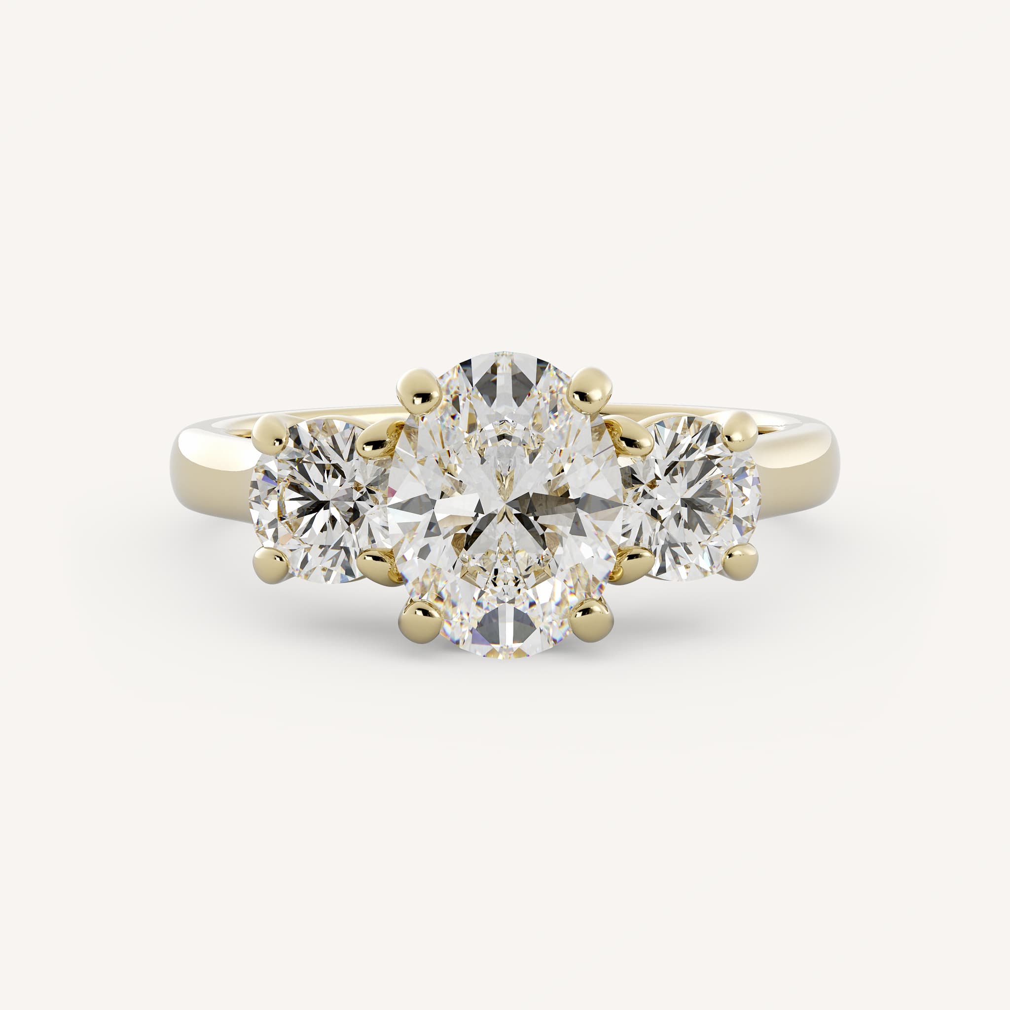 Charity features a striking oval center stone and two round accent stones in an elegant trellis setting on a half round flat edge shank.