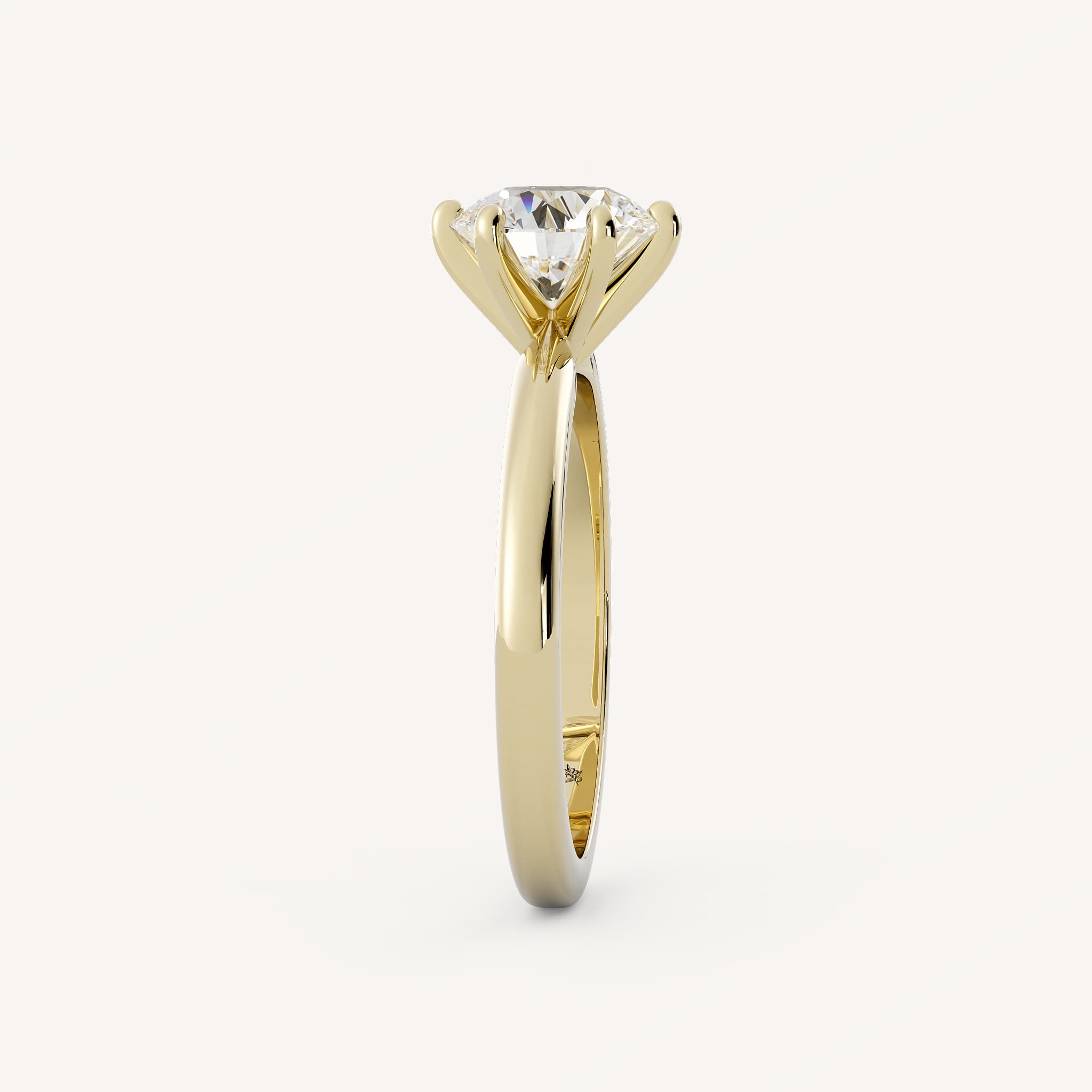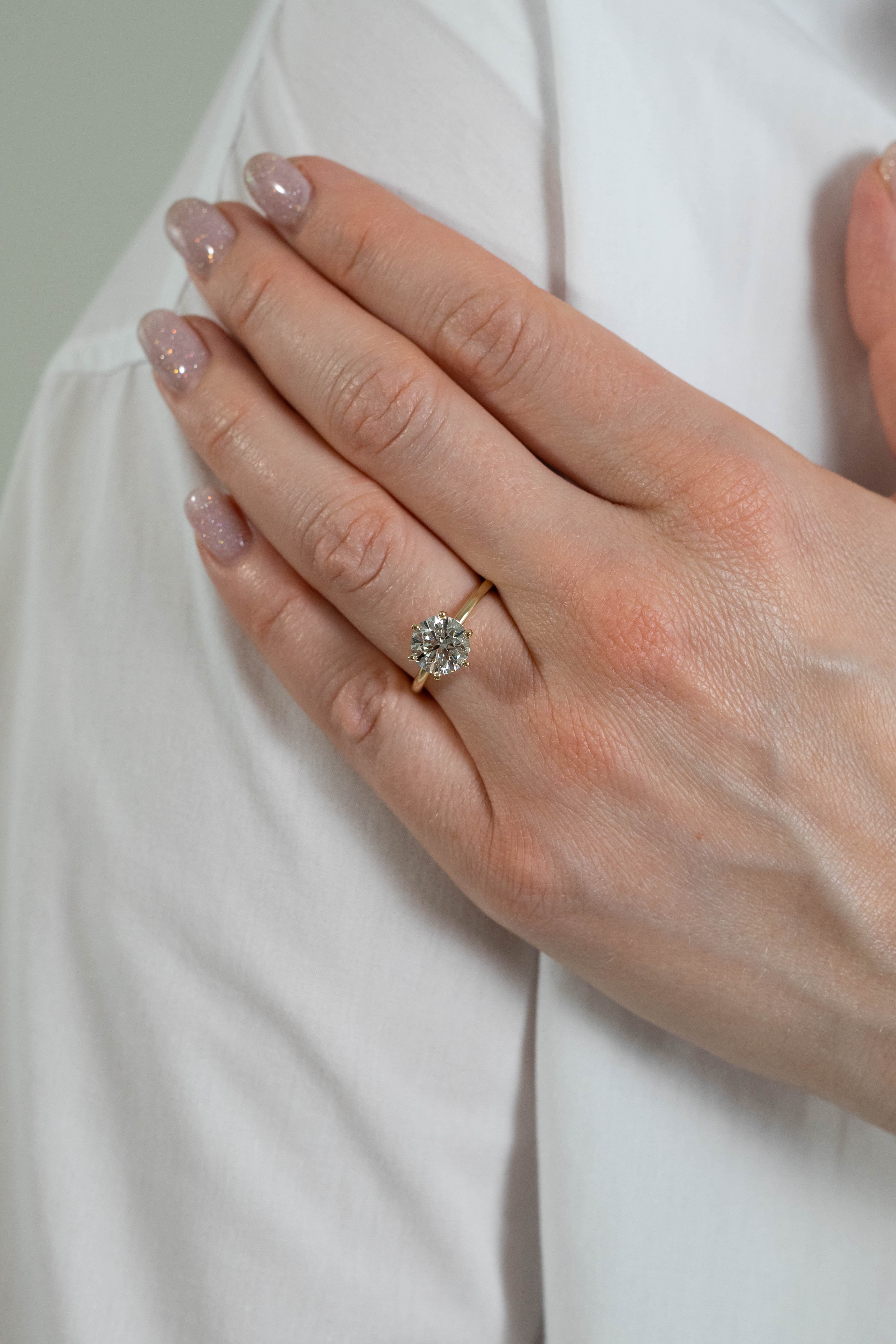 Charly features a round center stone set with six bold prongs on a half round shank.