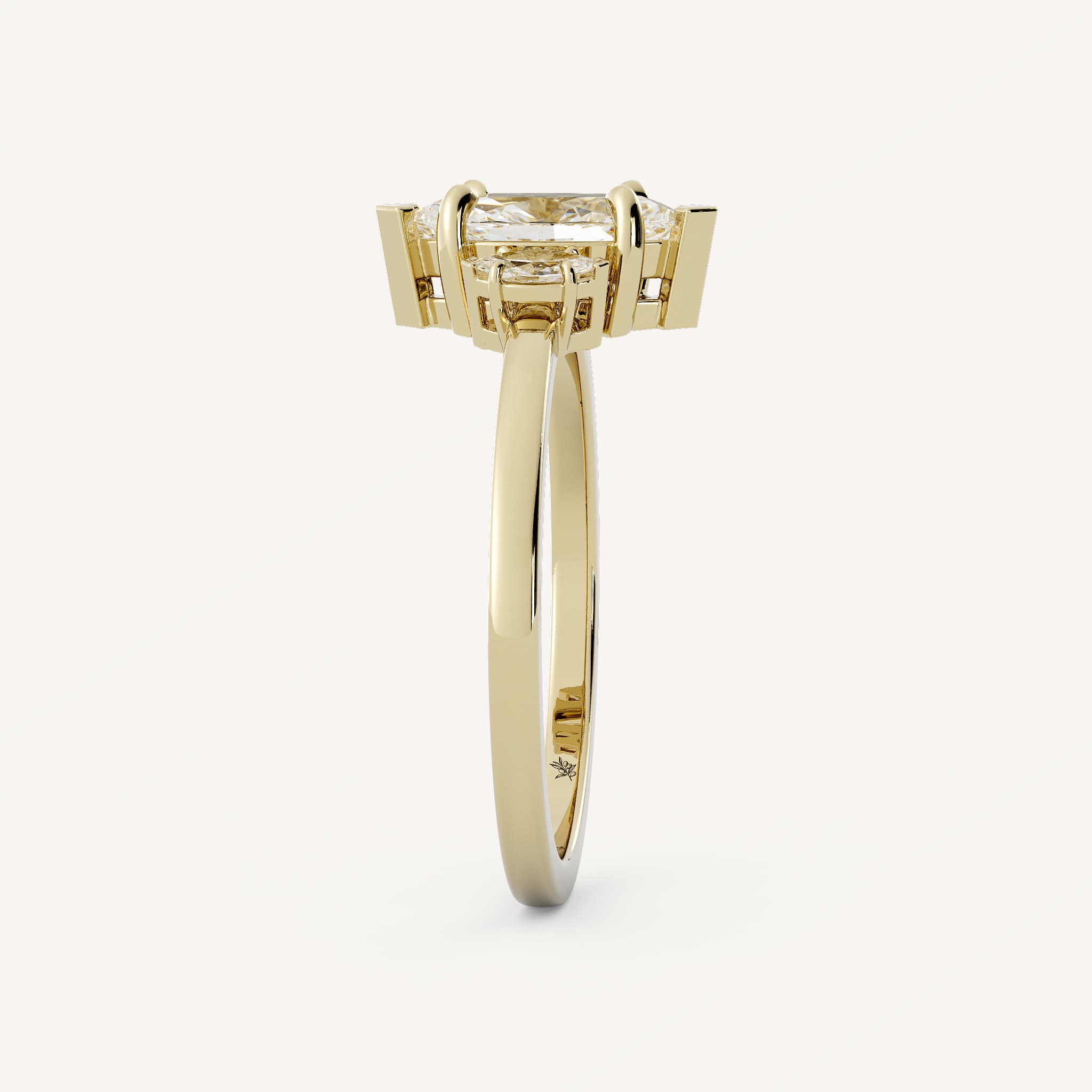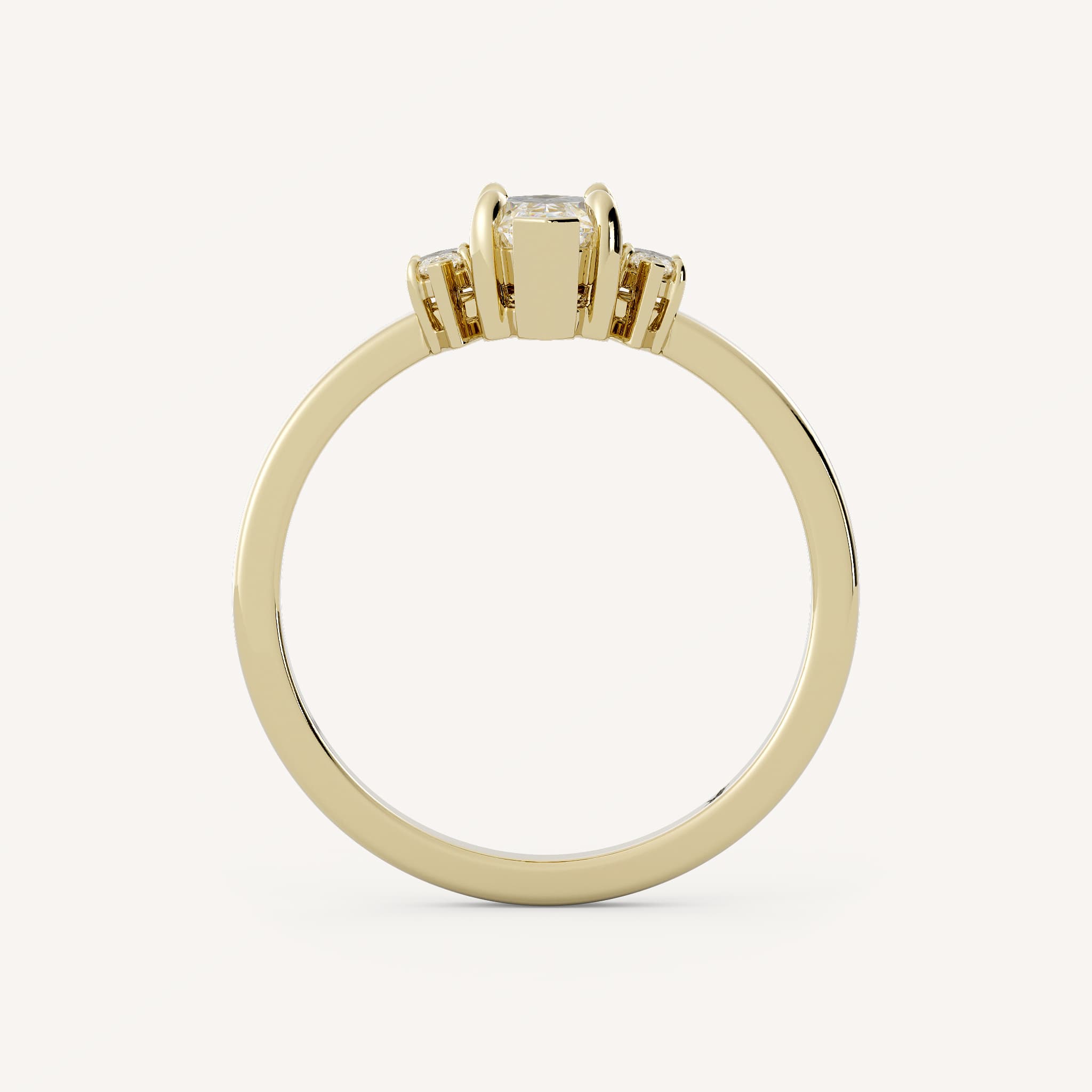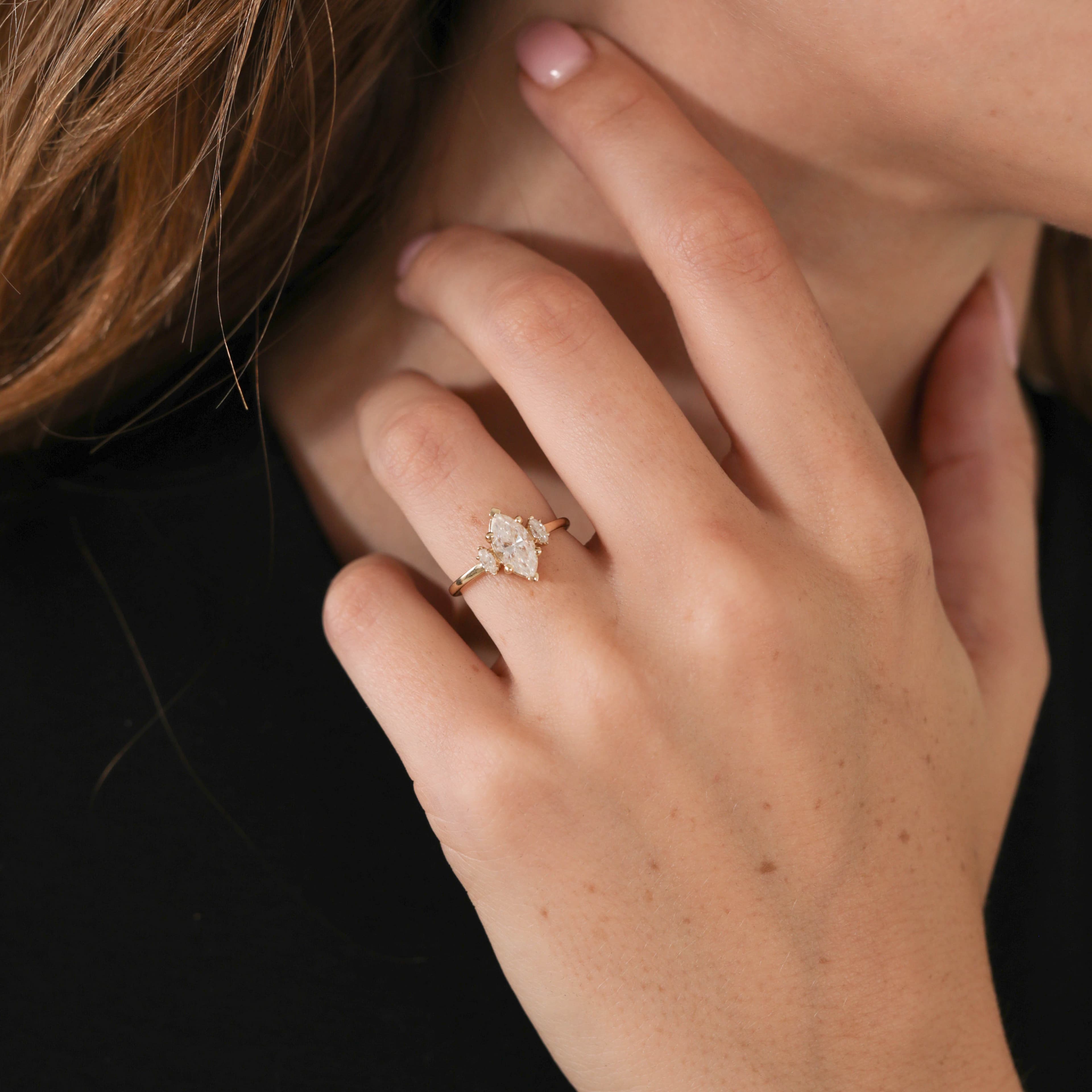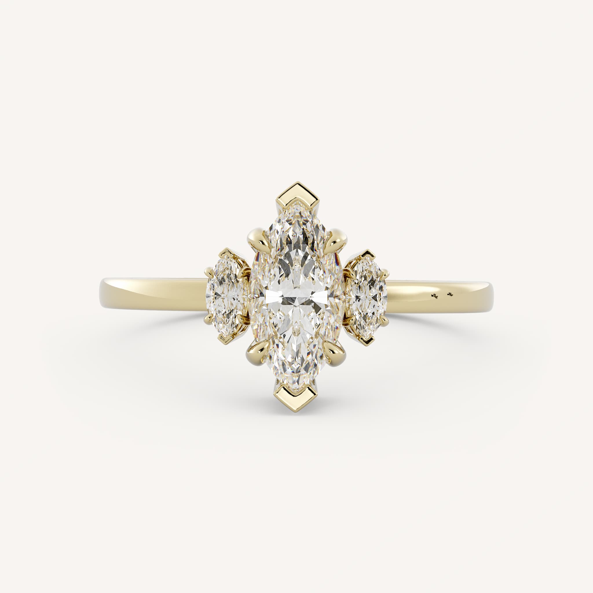Clarence features a graceful marquise center stone with two marquise accent stones set with v-prongs in a three stone basket on a half round flat edge shank.