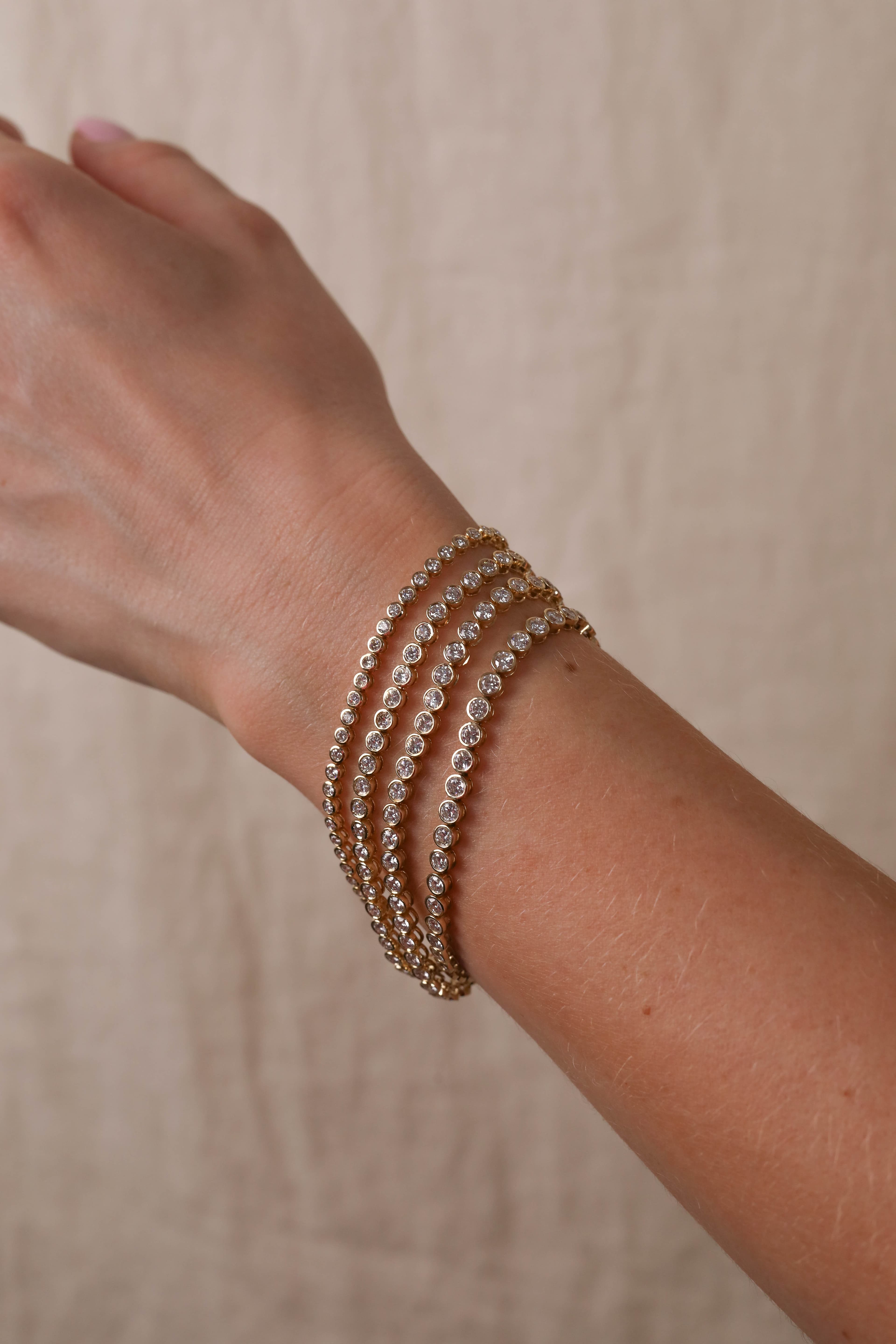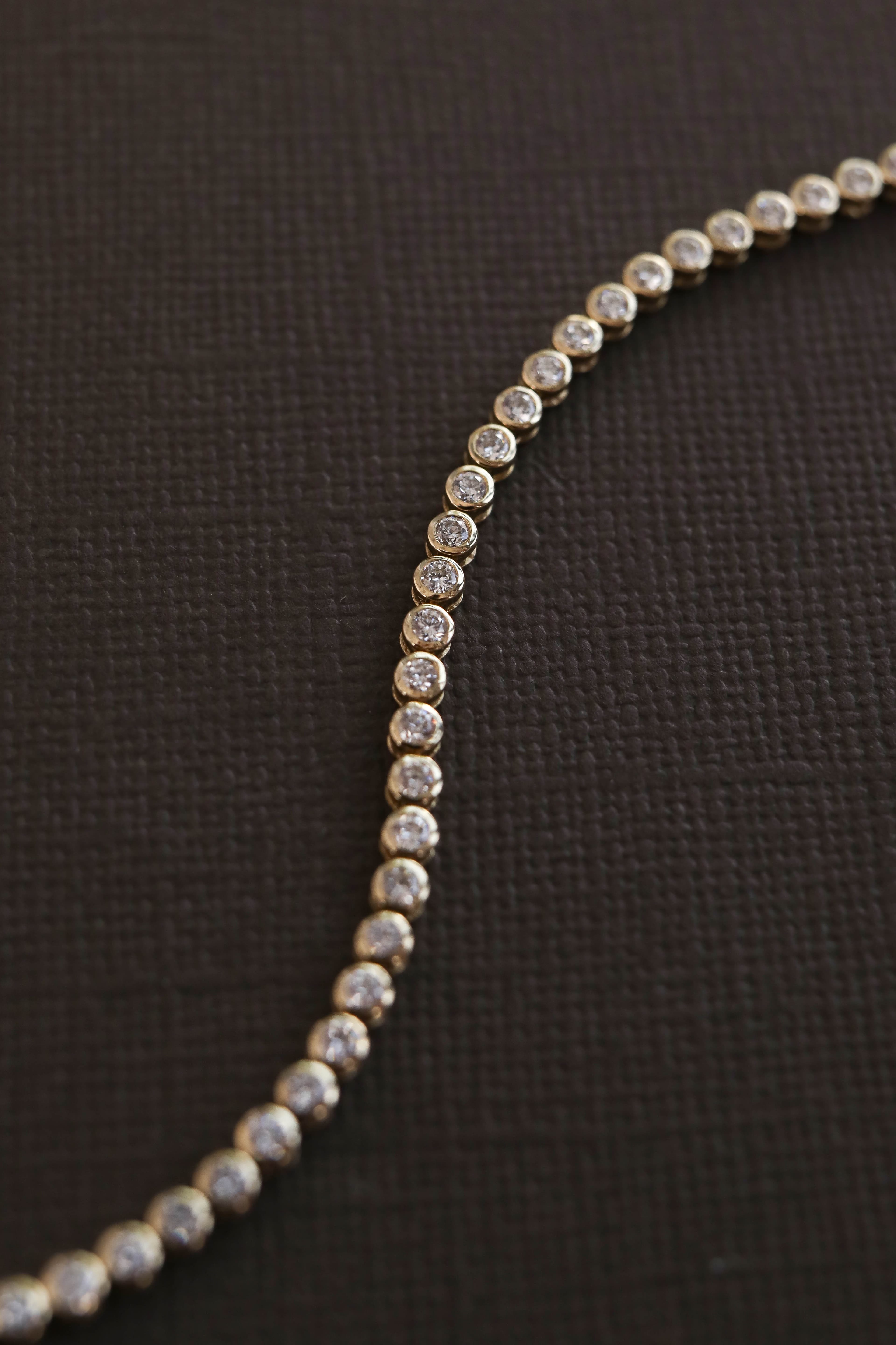 Timeless round bezel tennis bracelet with DEF color, VS2+ clarity Lab Diamonds. Comes in 7 inch length and can be shortened by request.