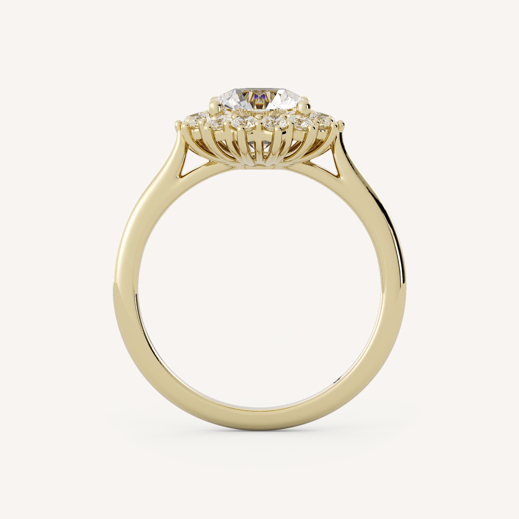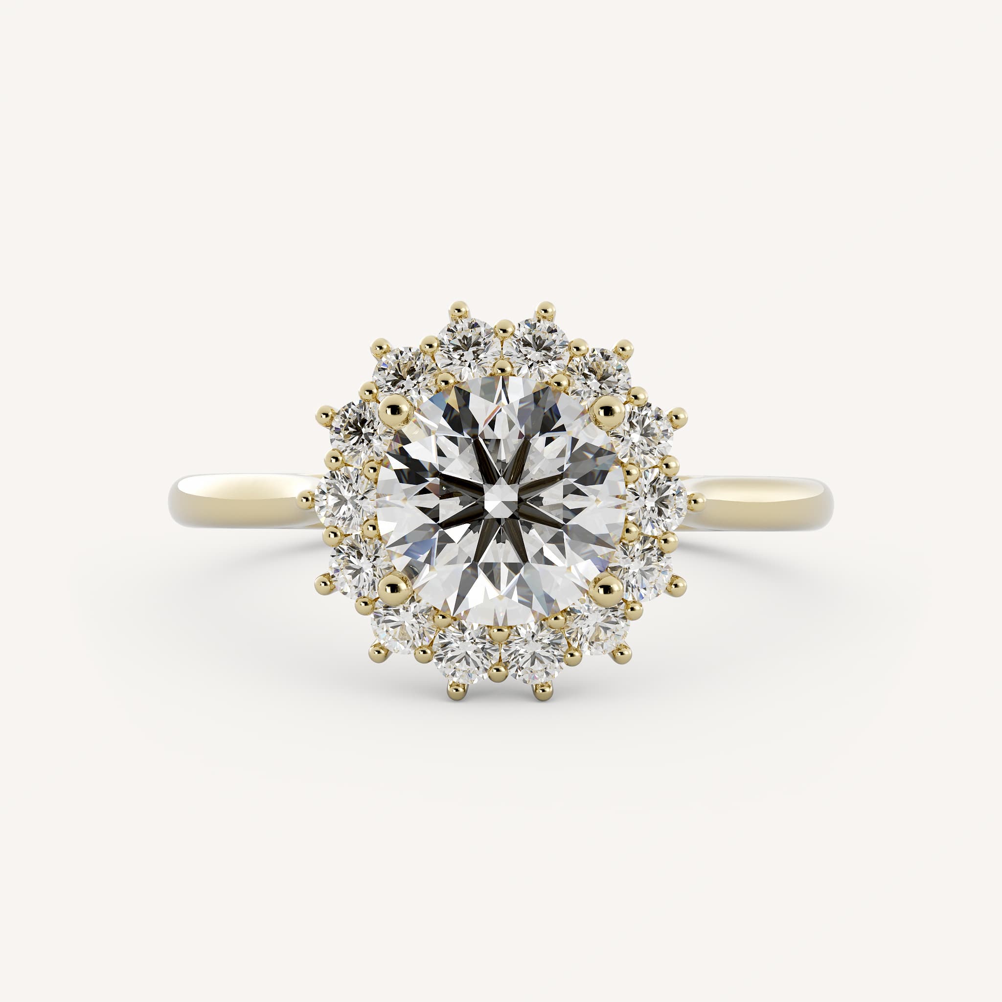 Colette features a round center stone with a gorgeous burst halo set in a cathedral basket on a half round shank.