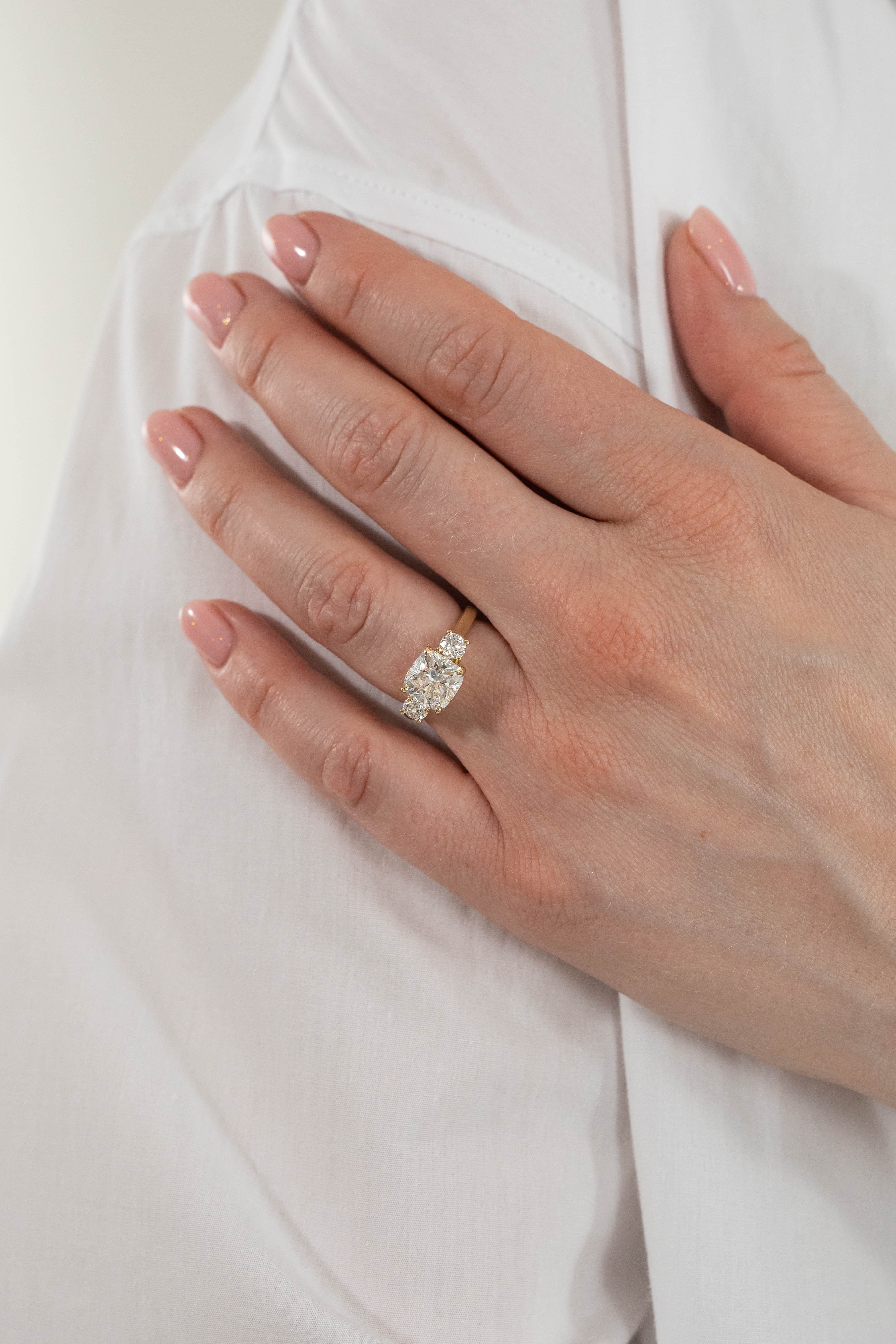 Duchess features a graceful cushion center stone set in an elegant trellis setting accented by two round side stones on a half round shank.