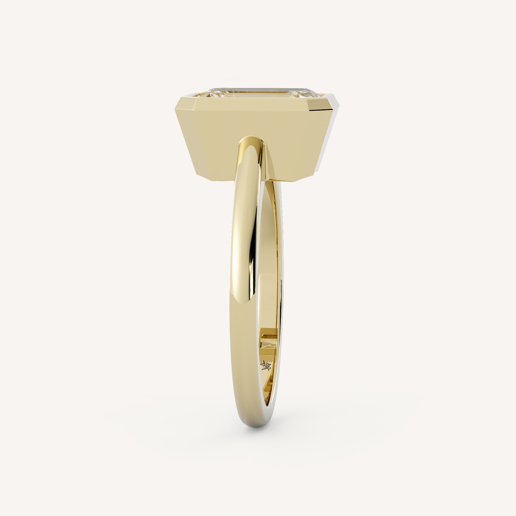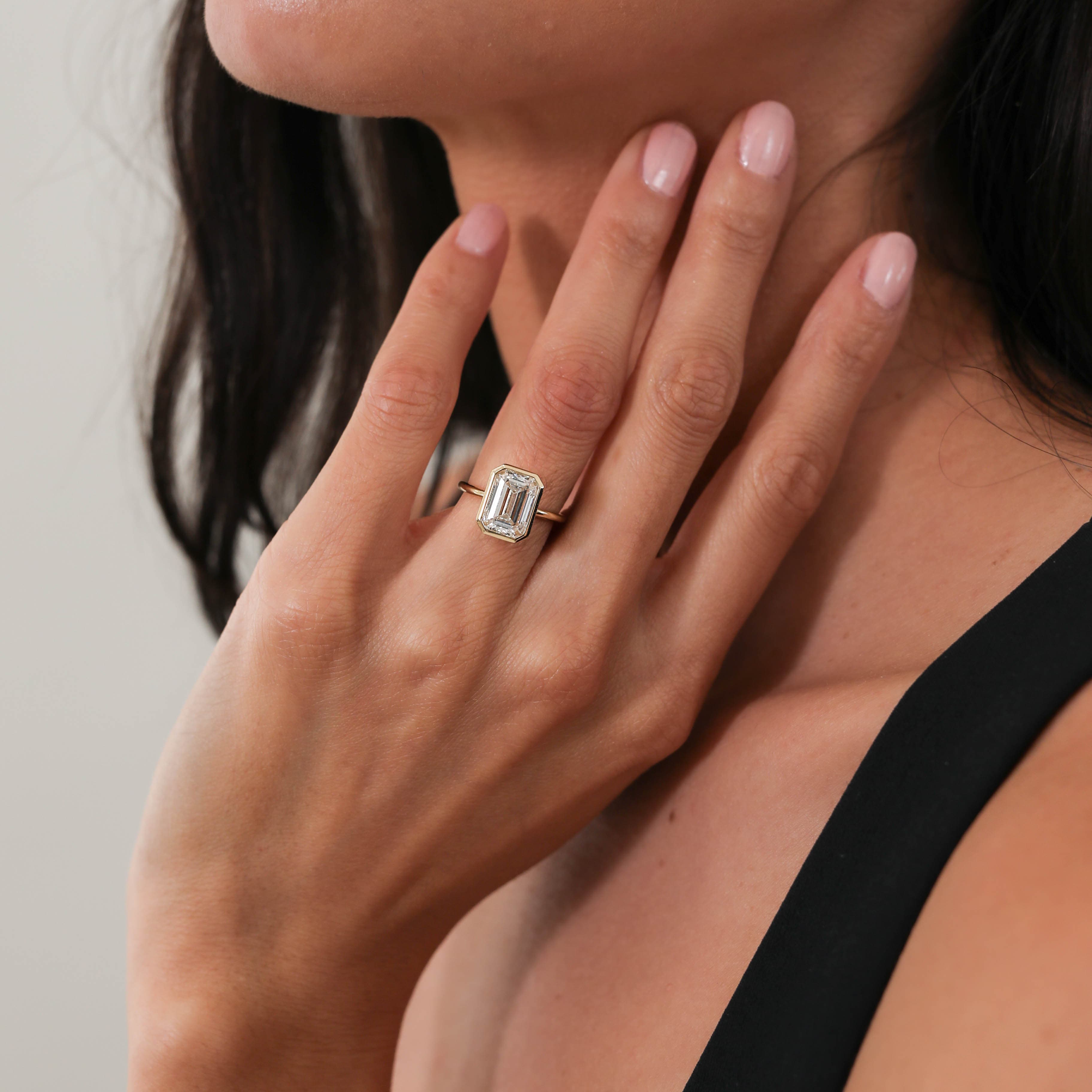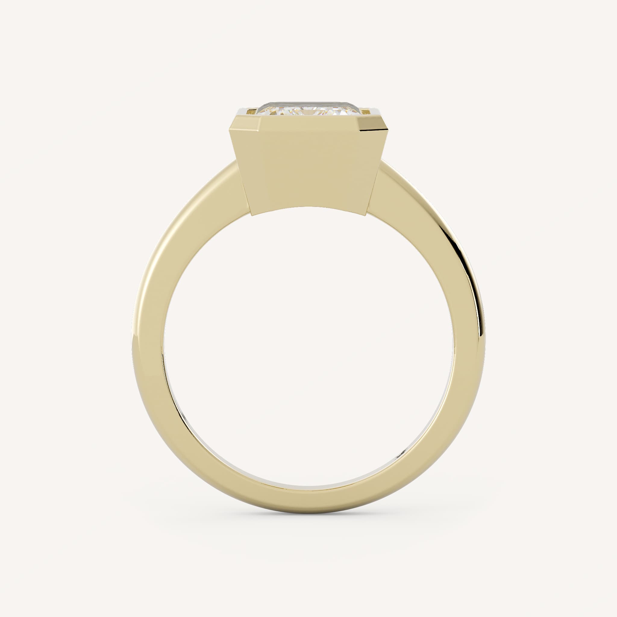 Elliot features a striking emerald shaped center stone set in a bezel on a half round shank.