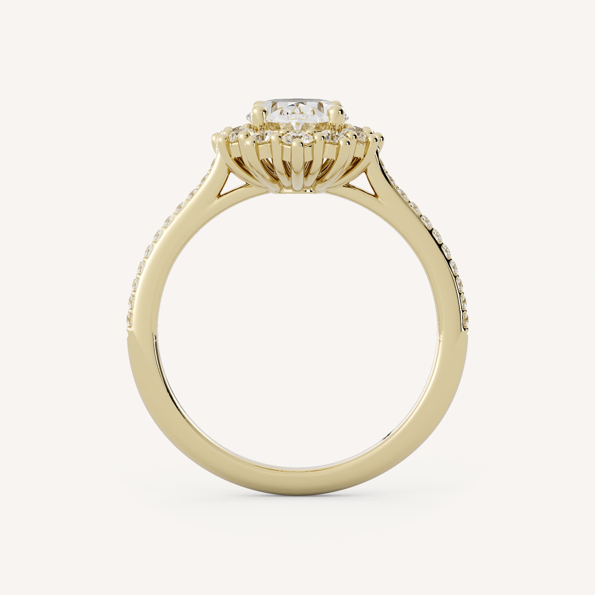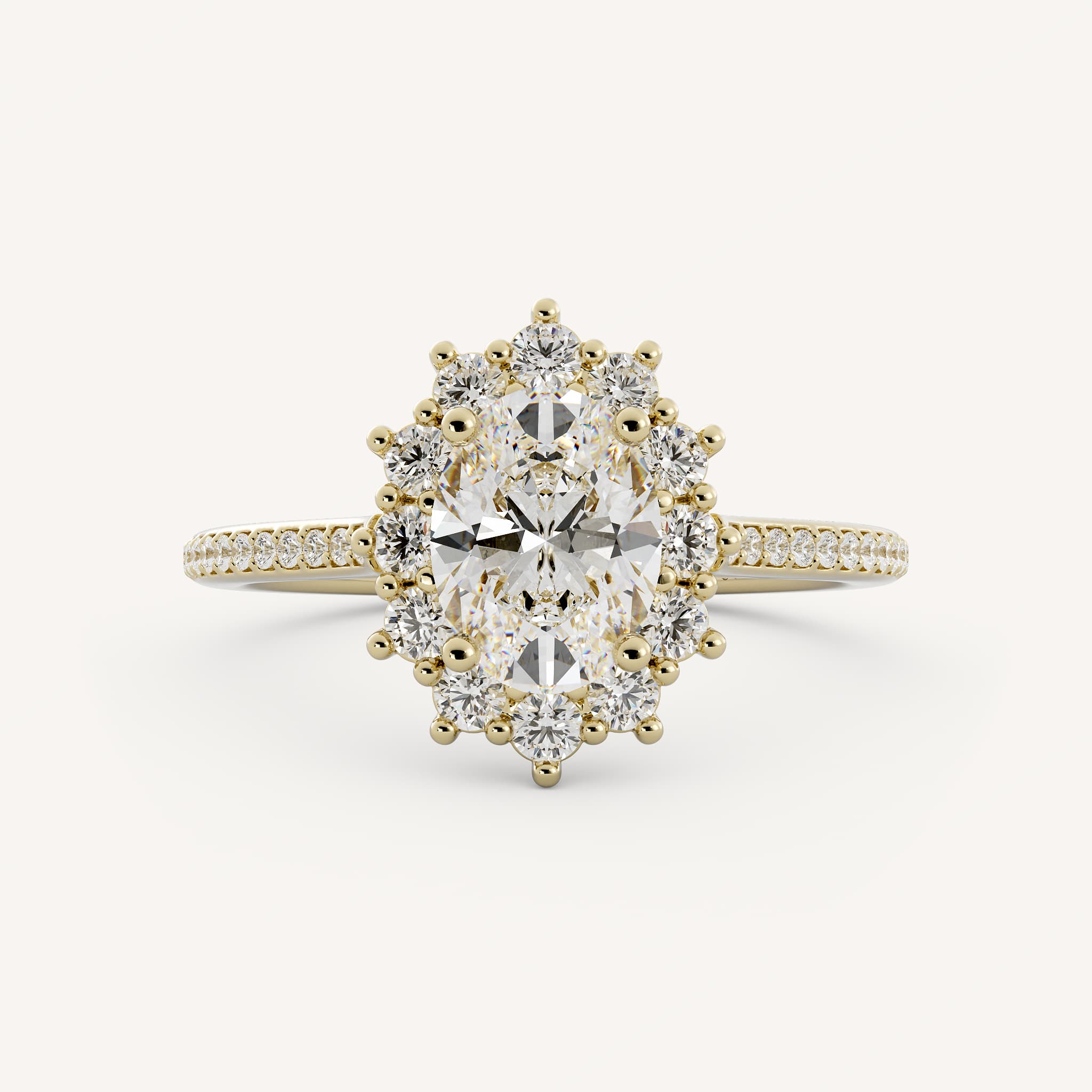Elsie features an oval center stone with a burst halo set in a basket setting complete with a traditional prong set diamond shank.