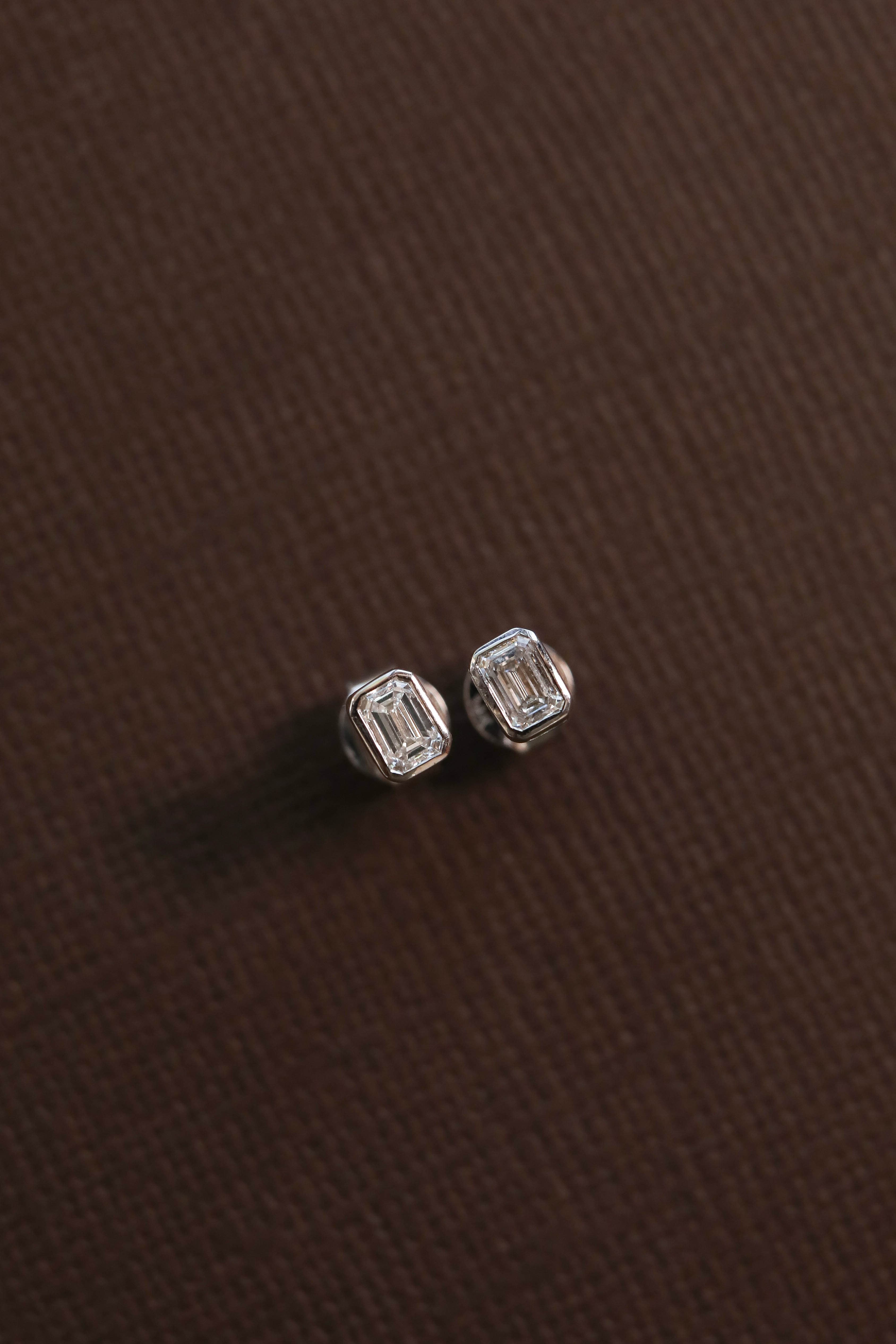 Surrounded by 14K Gold, The Emerald Bezel Studs beautifully showcase the traditional step-cut with each diamond bezel set with friction backs.