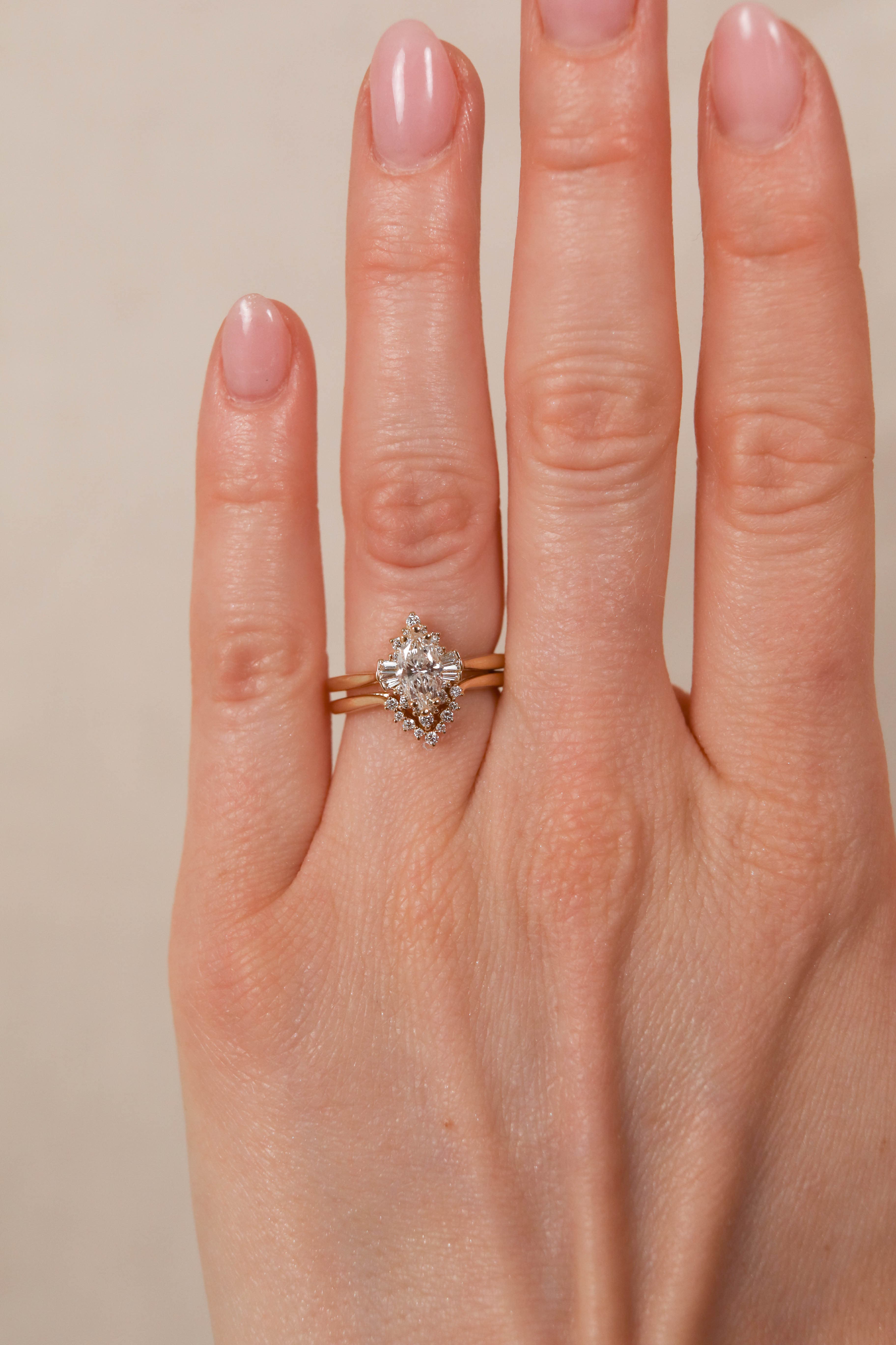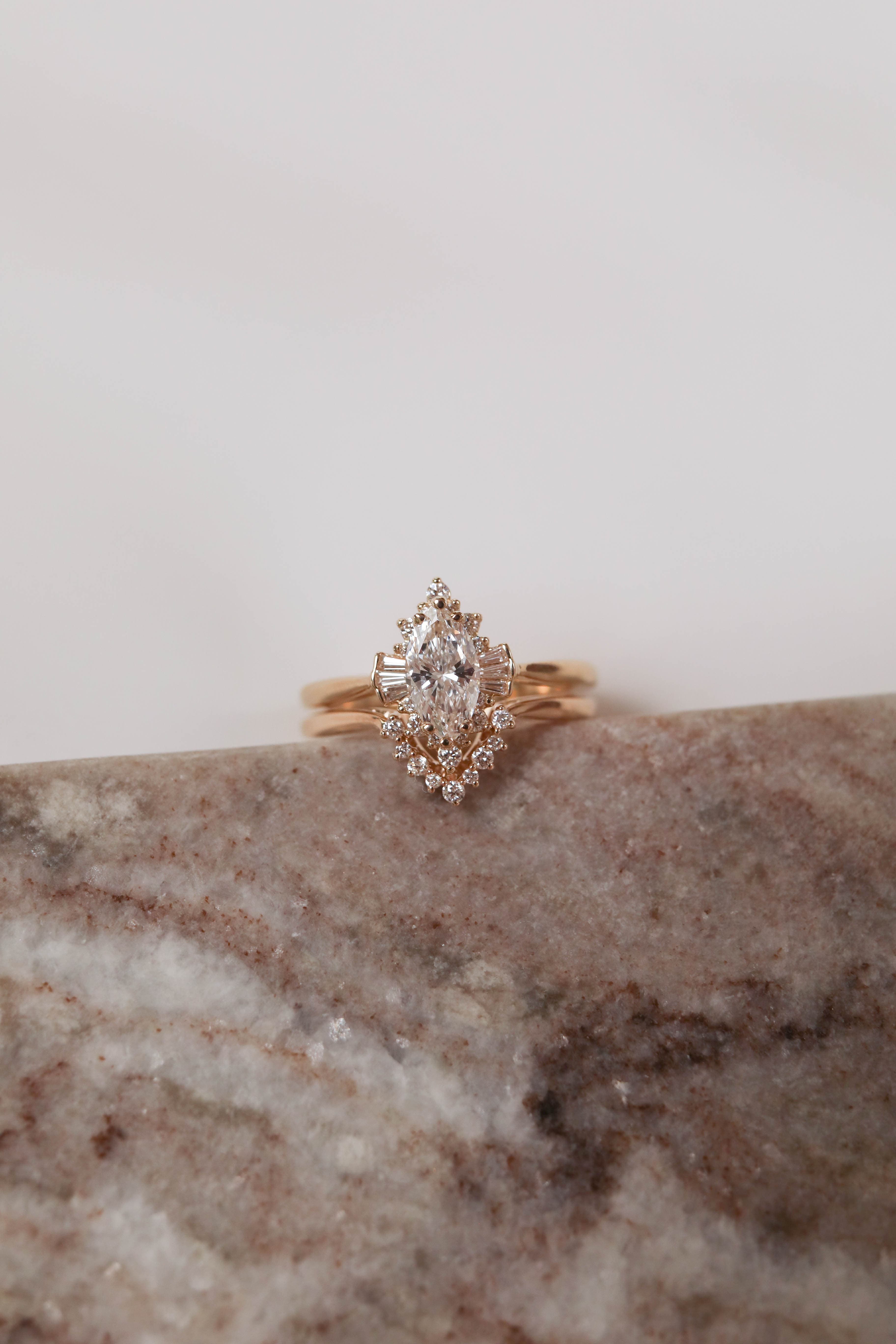 Emerson features a marquise center stone set in a vintage burst halo made of baguette and round stones. This design is set in a cathedral basket on a pinch tapered shank. Paired with the Emerson Band which features round stones set in contour basket made to pair perfectly with Emerson.