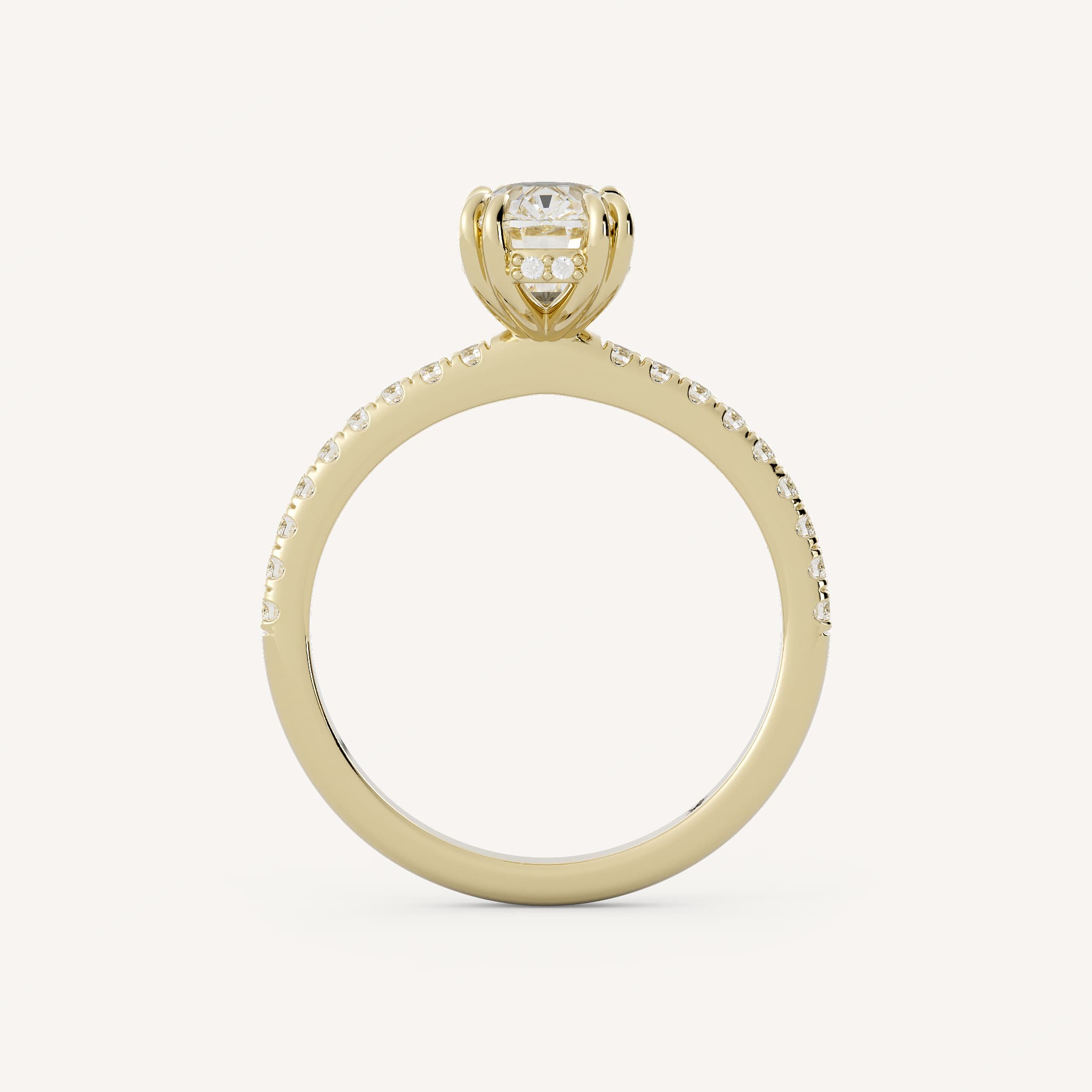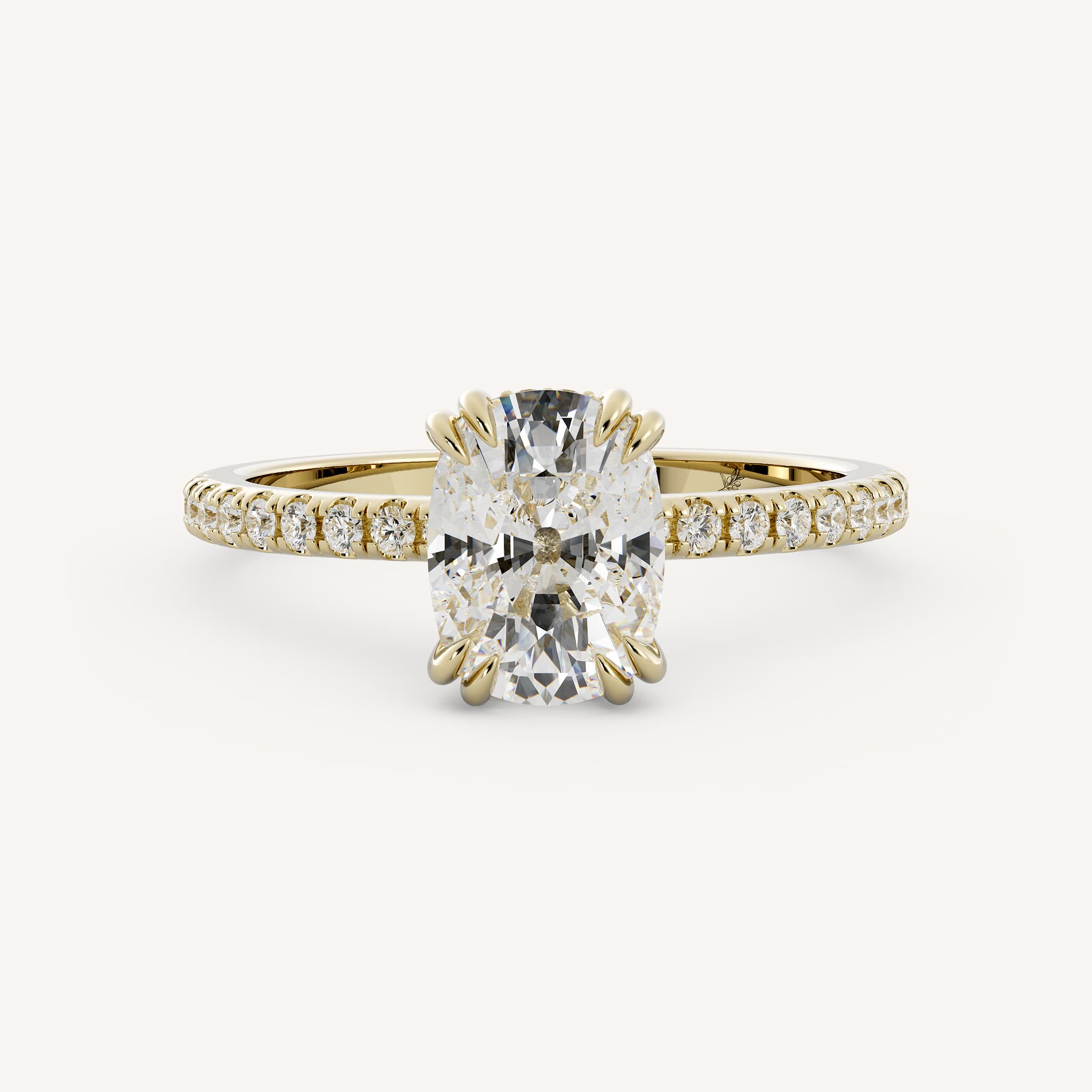 Emily features an elongated cushion center stone with a double claw prongs and a charming double halo. Set in a traditional solitaire setting on a scallop prong diamond shank.