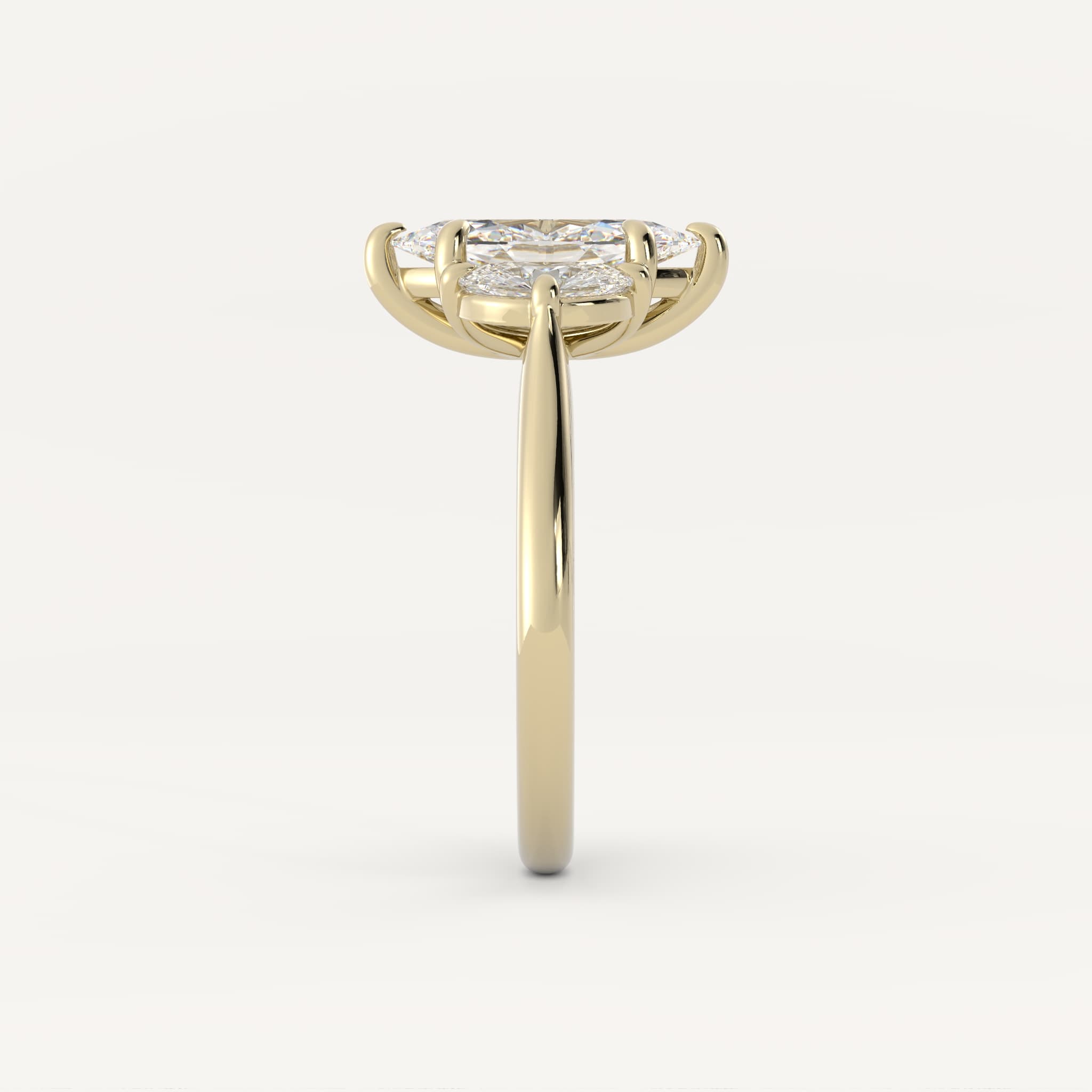 Emmett features a striking marquise center stone with moissanite half-moon accent stones set in a three-stone basket on a half-round shank.