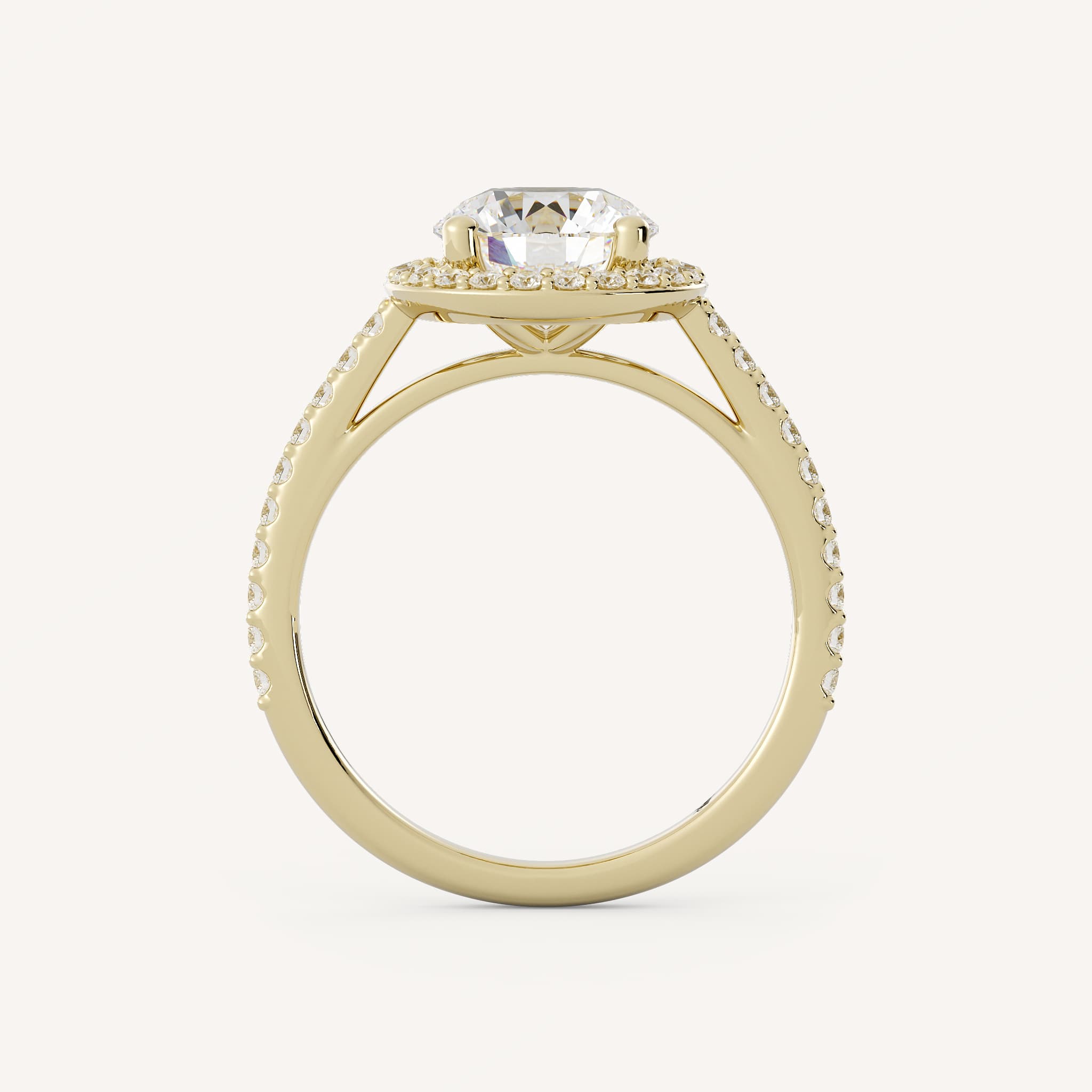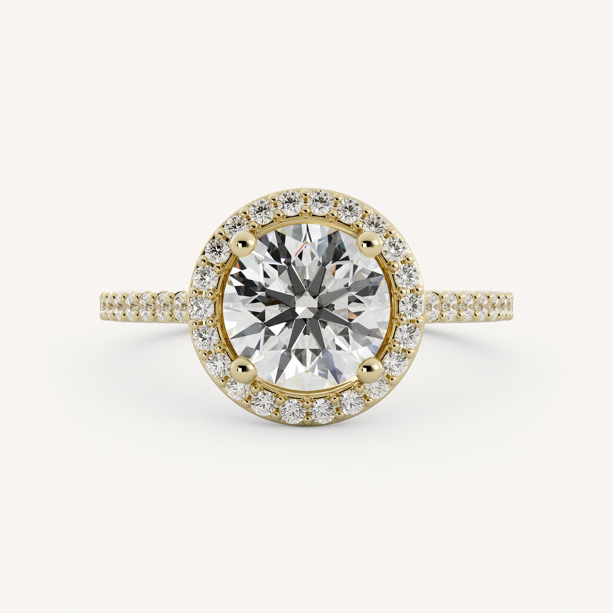 Everett features an eye-catching round center stone with a classic halo set in a cathedral setting on a traditional prong set diamond shank.
