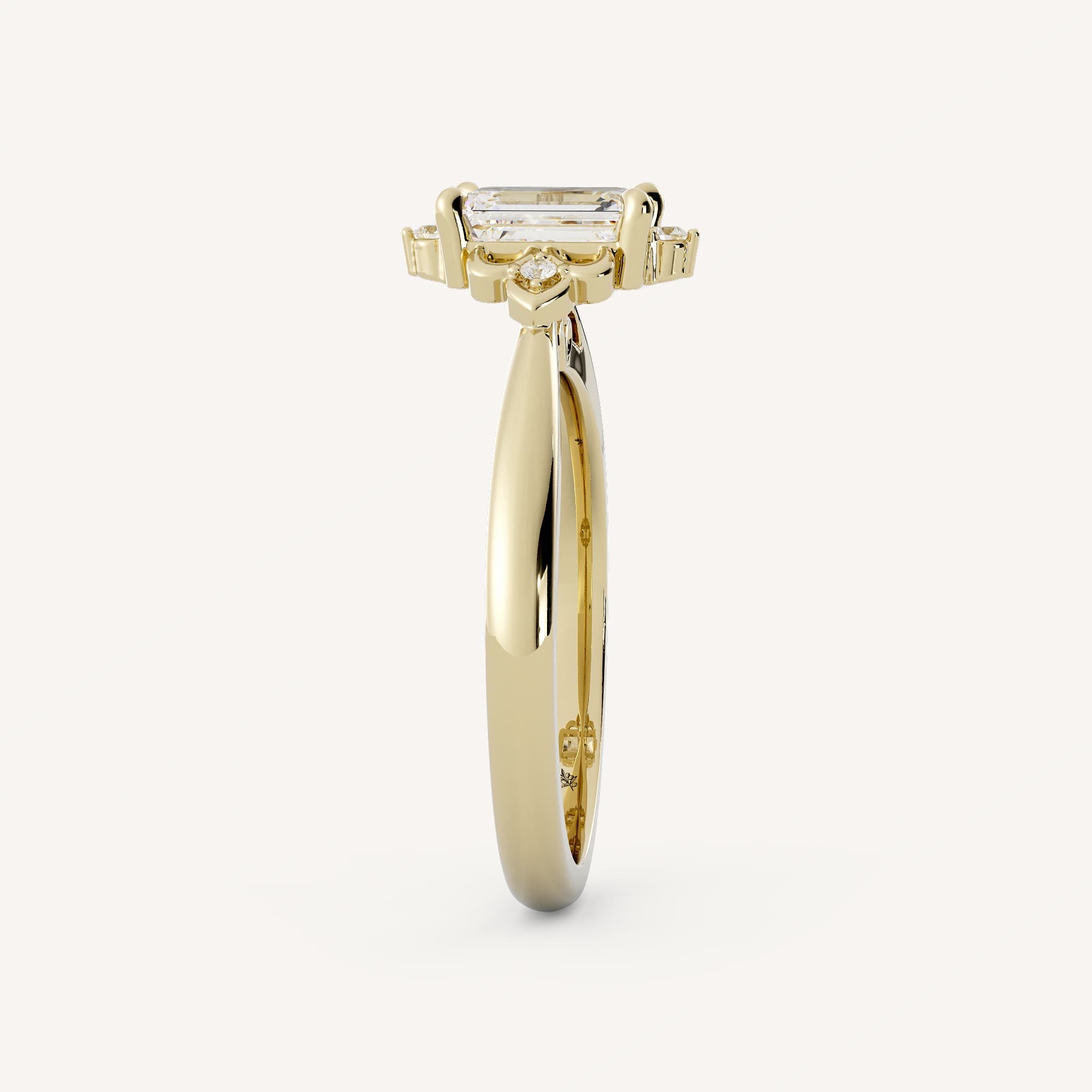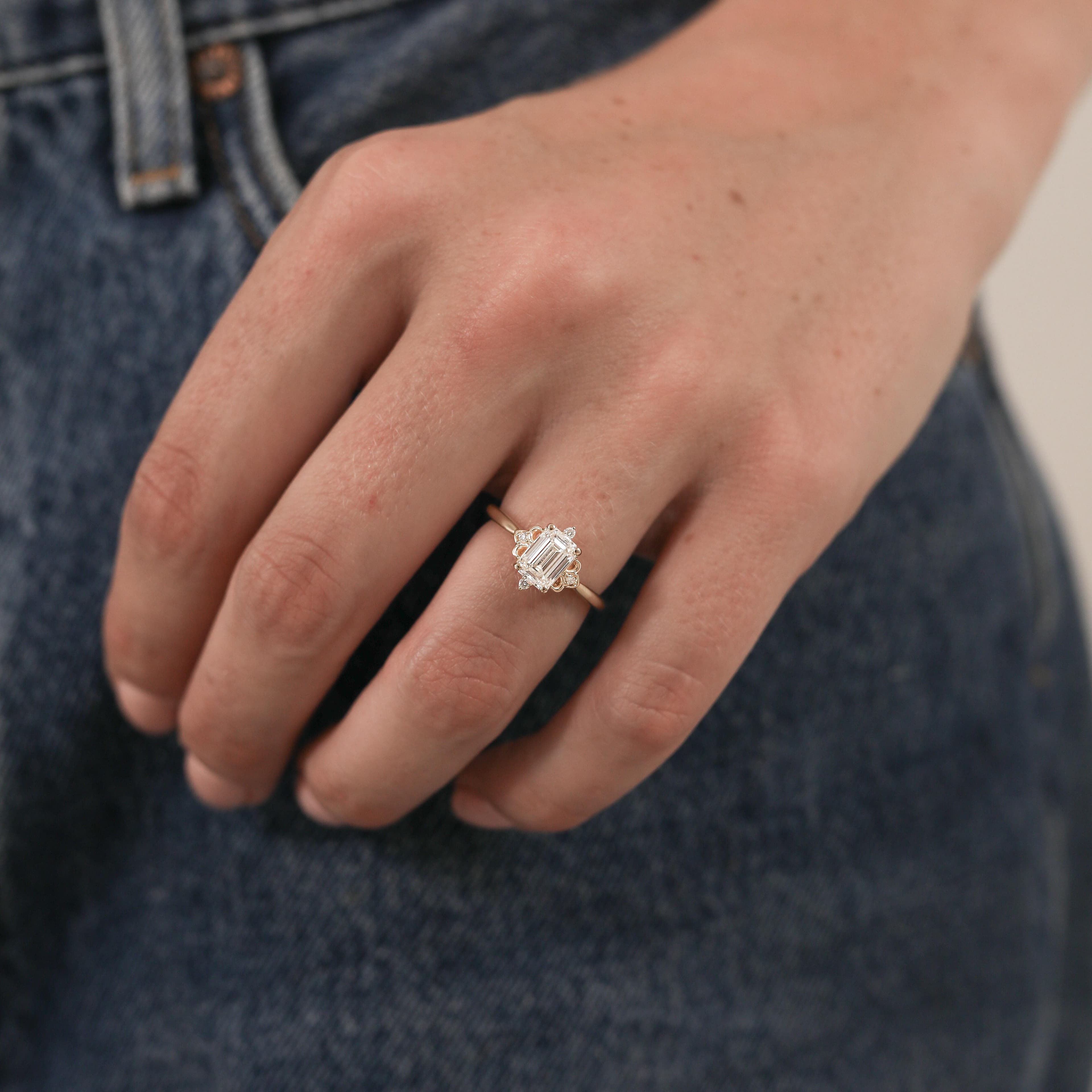 Evy features an emerald shaped center stone set in an ornate gold halo complete with round accent stones. This design features a detail cathedral setting on a half round shank.