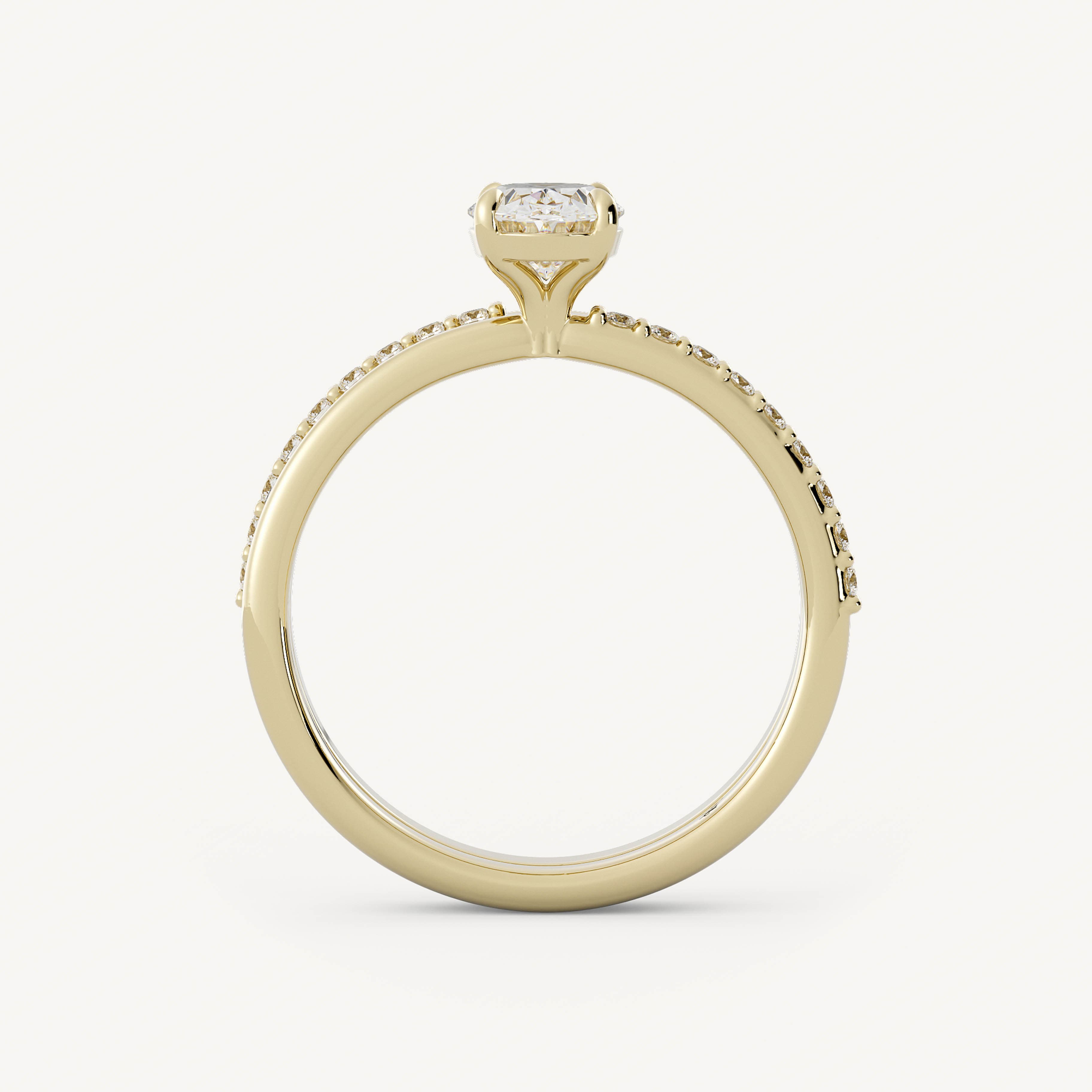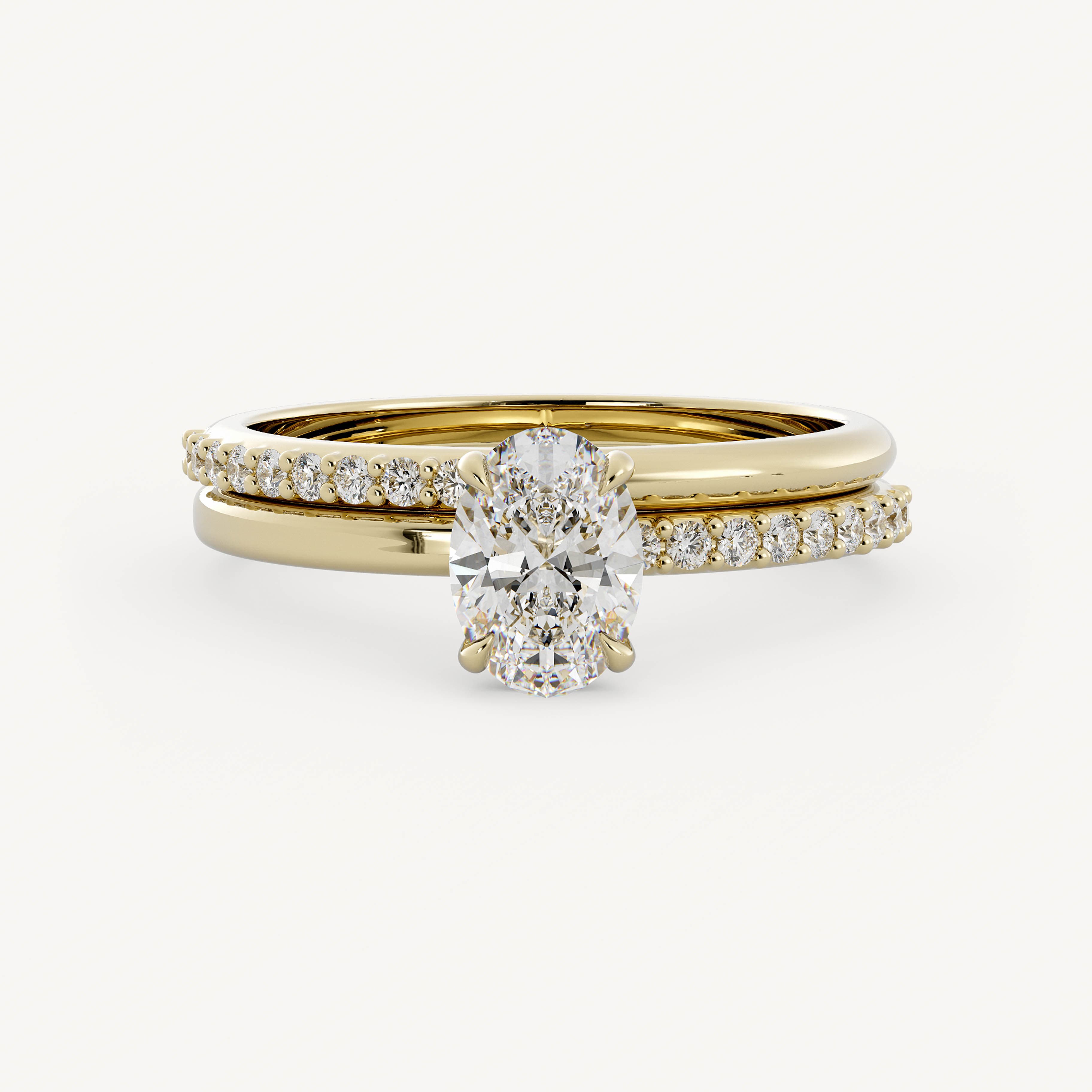 Finneas features a bold oval center stone set in a traditional solitaire setting with one side of the half round flat edge shank set with traditional prong set diamonds. Paired with Finn which is a unique band featuring half-pave set diamonds on a quarter of the shank.