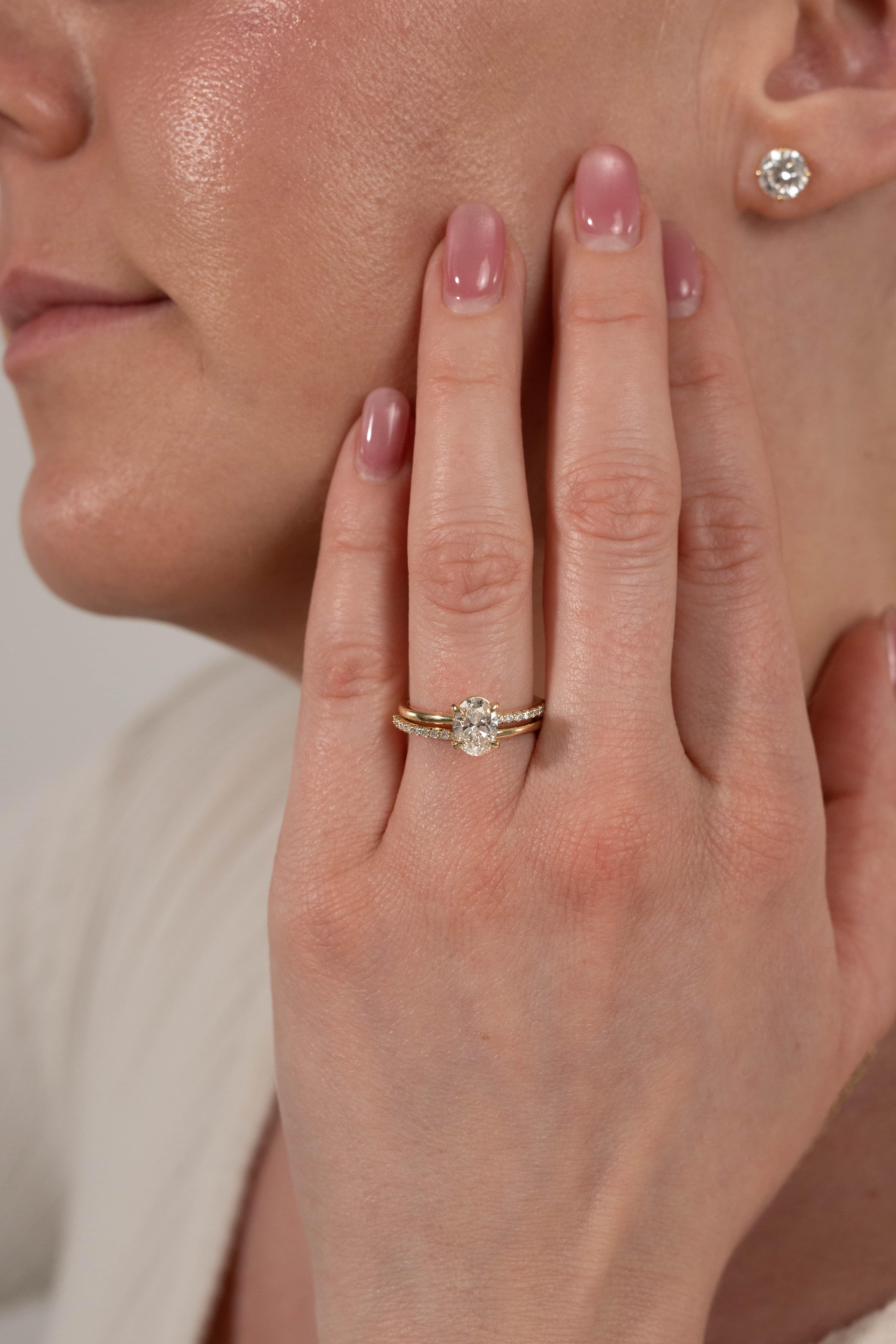 Designed to complement, the Finn Band offers a distinctive pairing with half pavé-set diamonds spanning a quarter of the shank, adding just the right touch of brilliance.