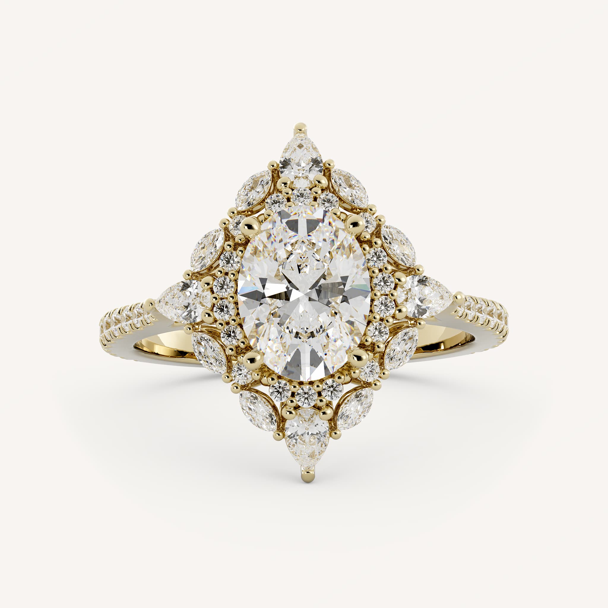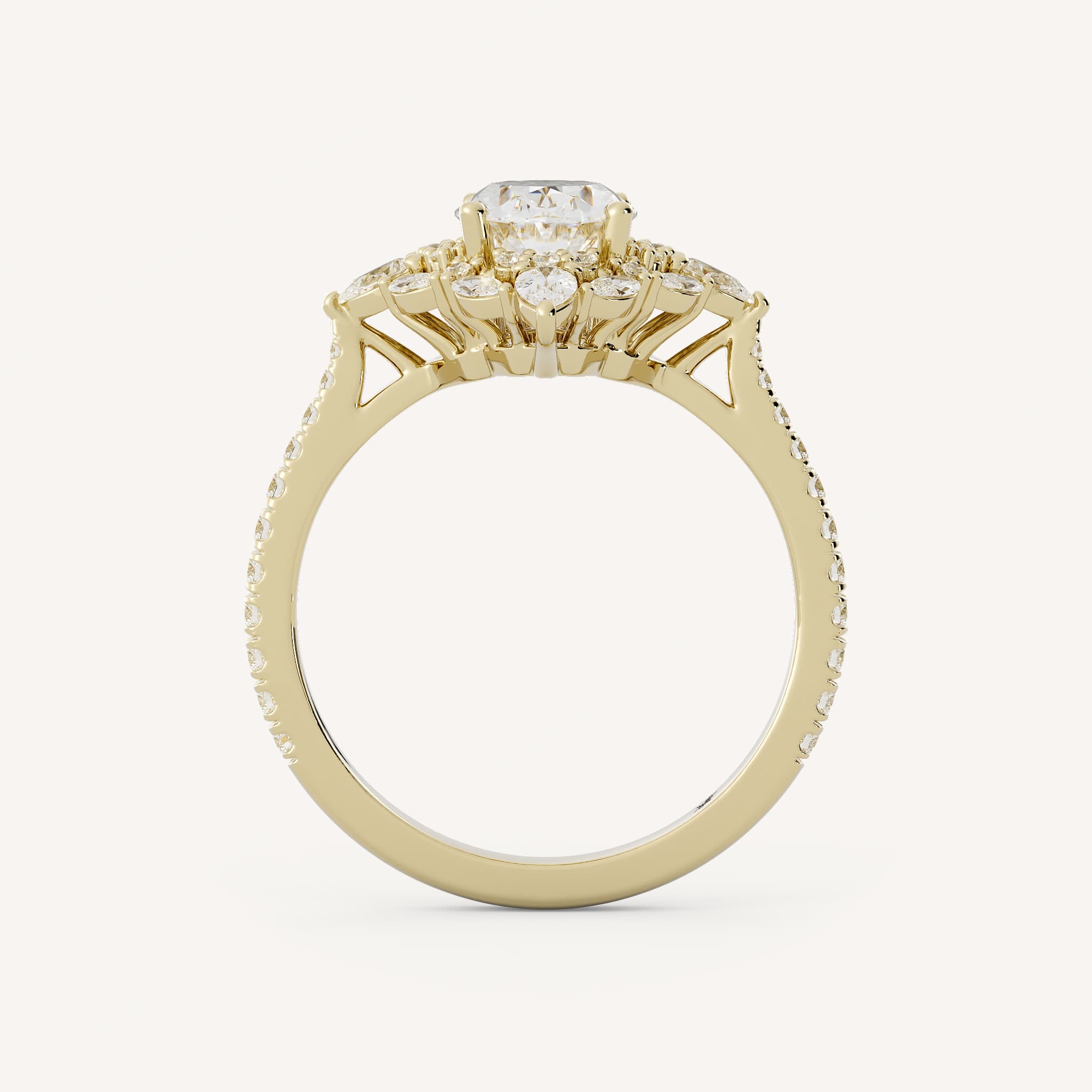 Frances features an oval center stone with classic inner halo and a second halo made of marquise and pear stones. Set in a basket setting on a traditional prong diamond shank.
