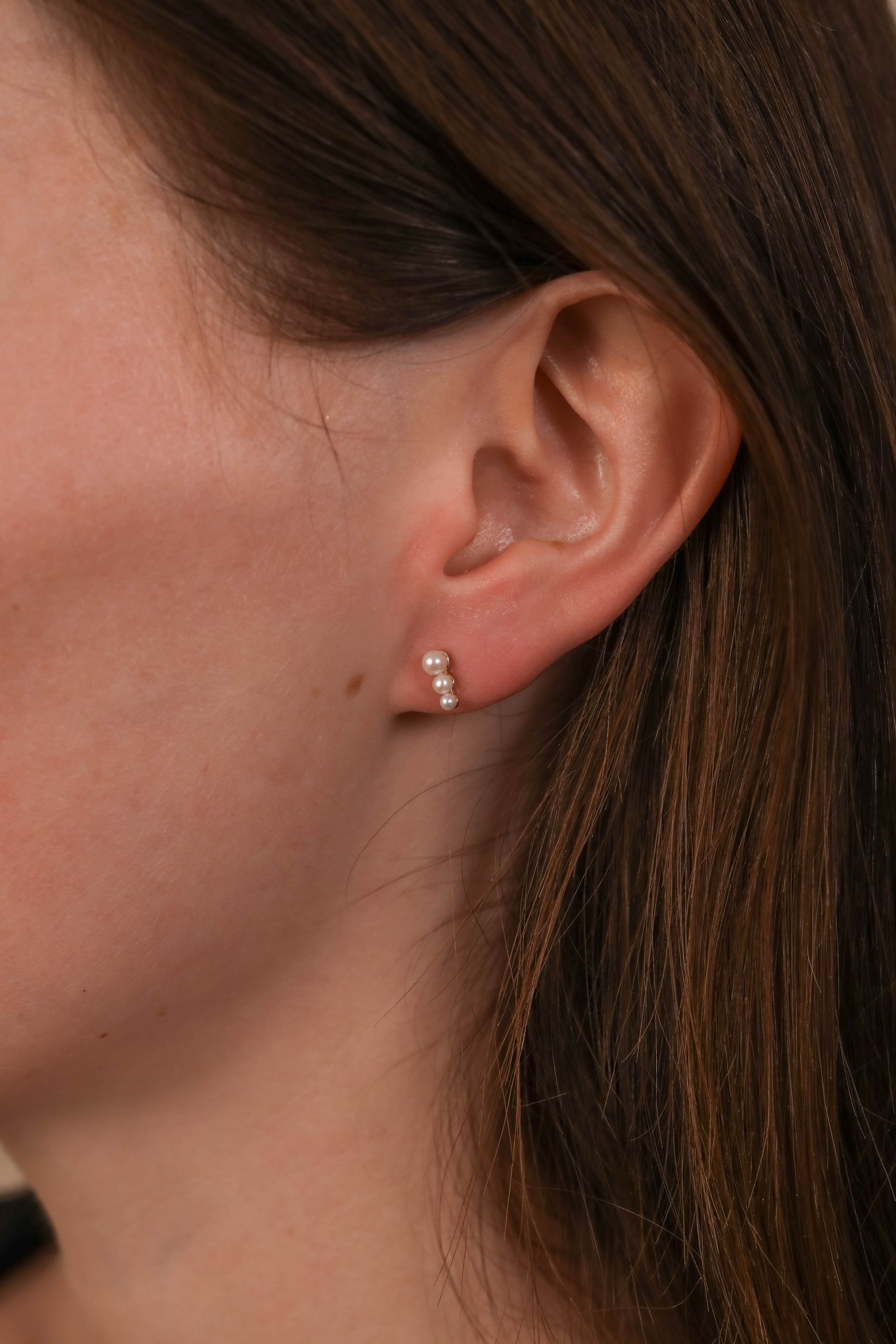 Effortlessly elevating any look, the Graduated Pearl Studs display three dainty freshwater pearls descending in size, set in 14K gold.