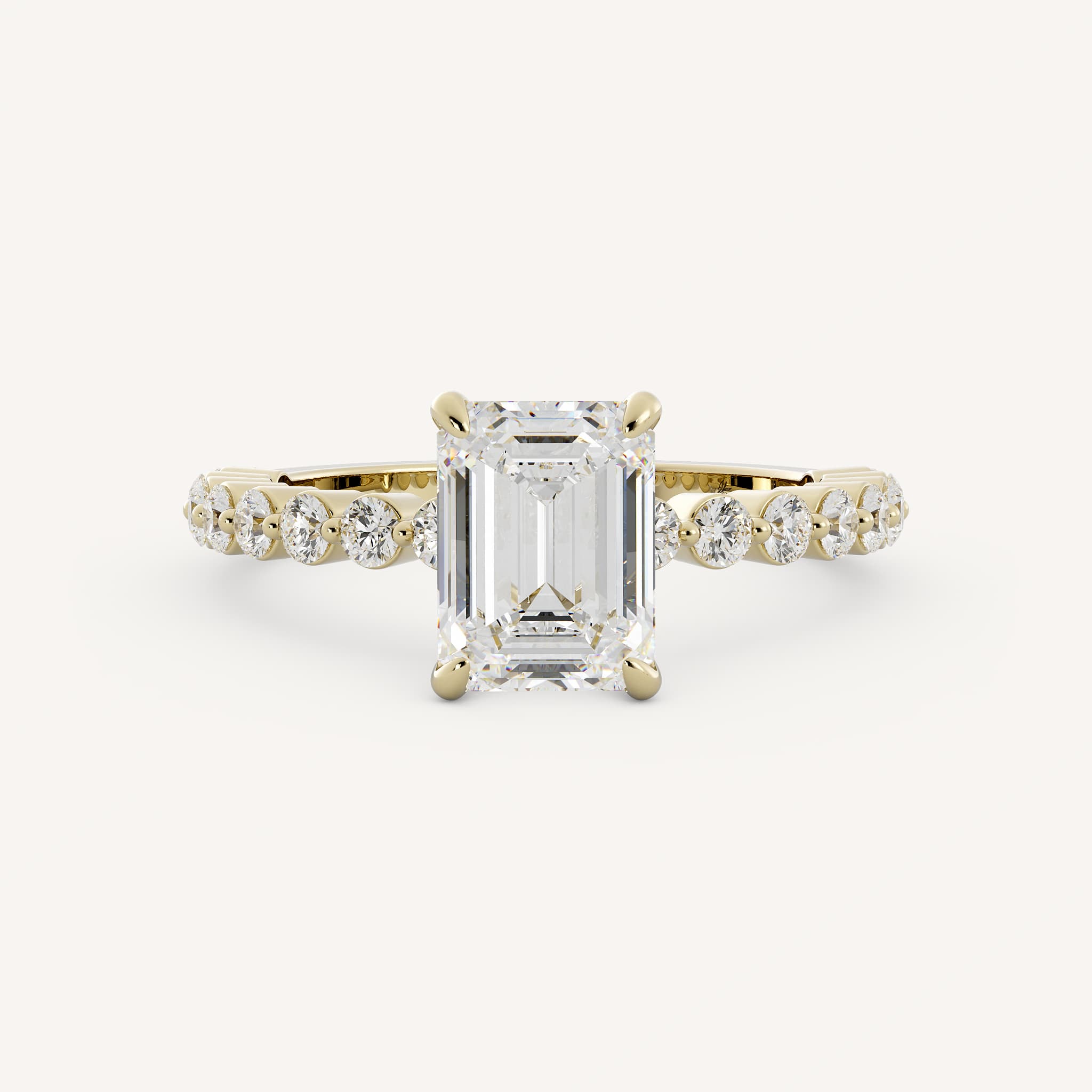 Harriett features an eye-catching emerald shaped center stone set in a traditional solitaire setting with a single shared prong round diamond shank.