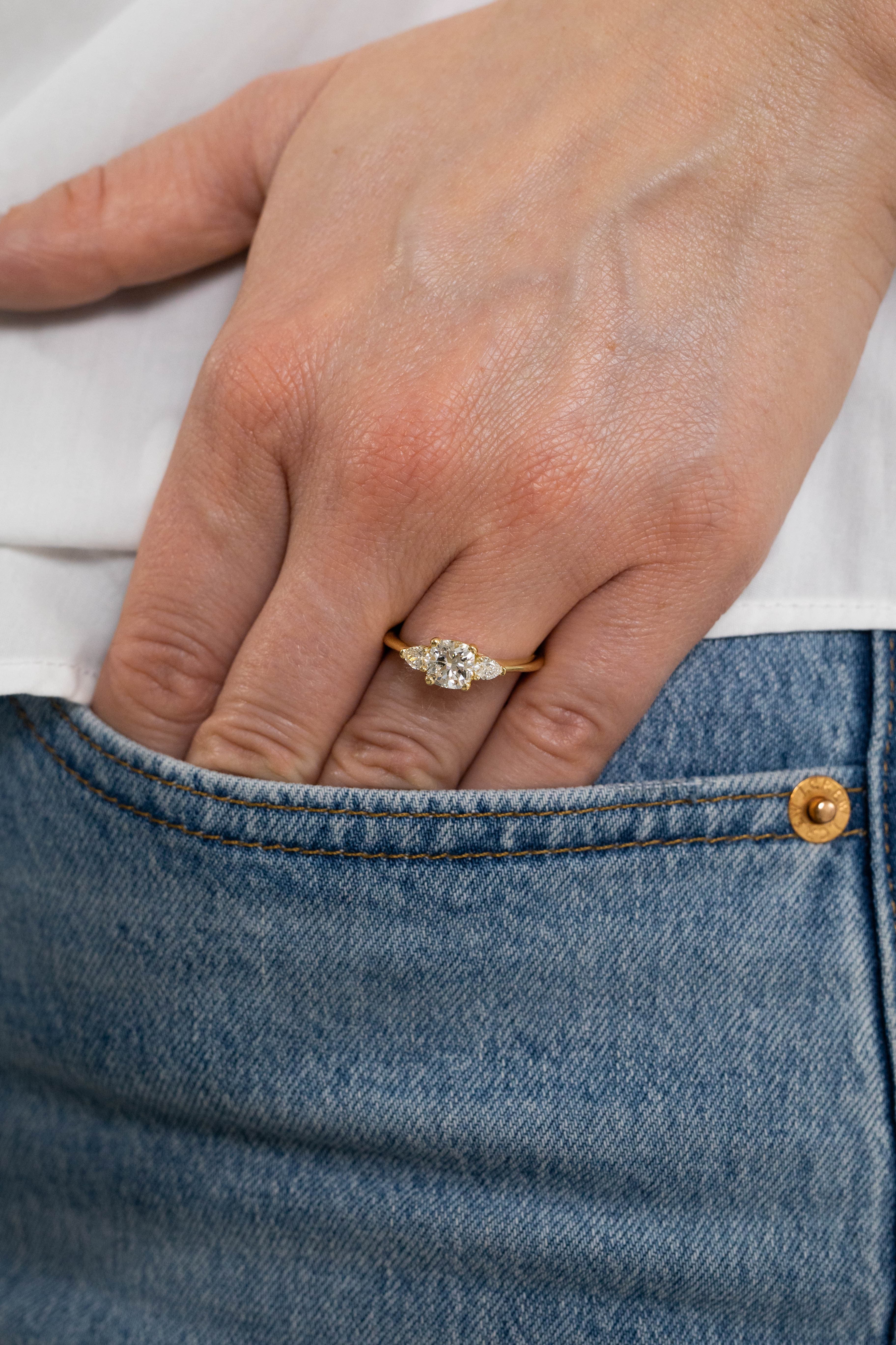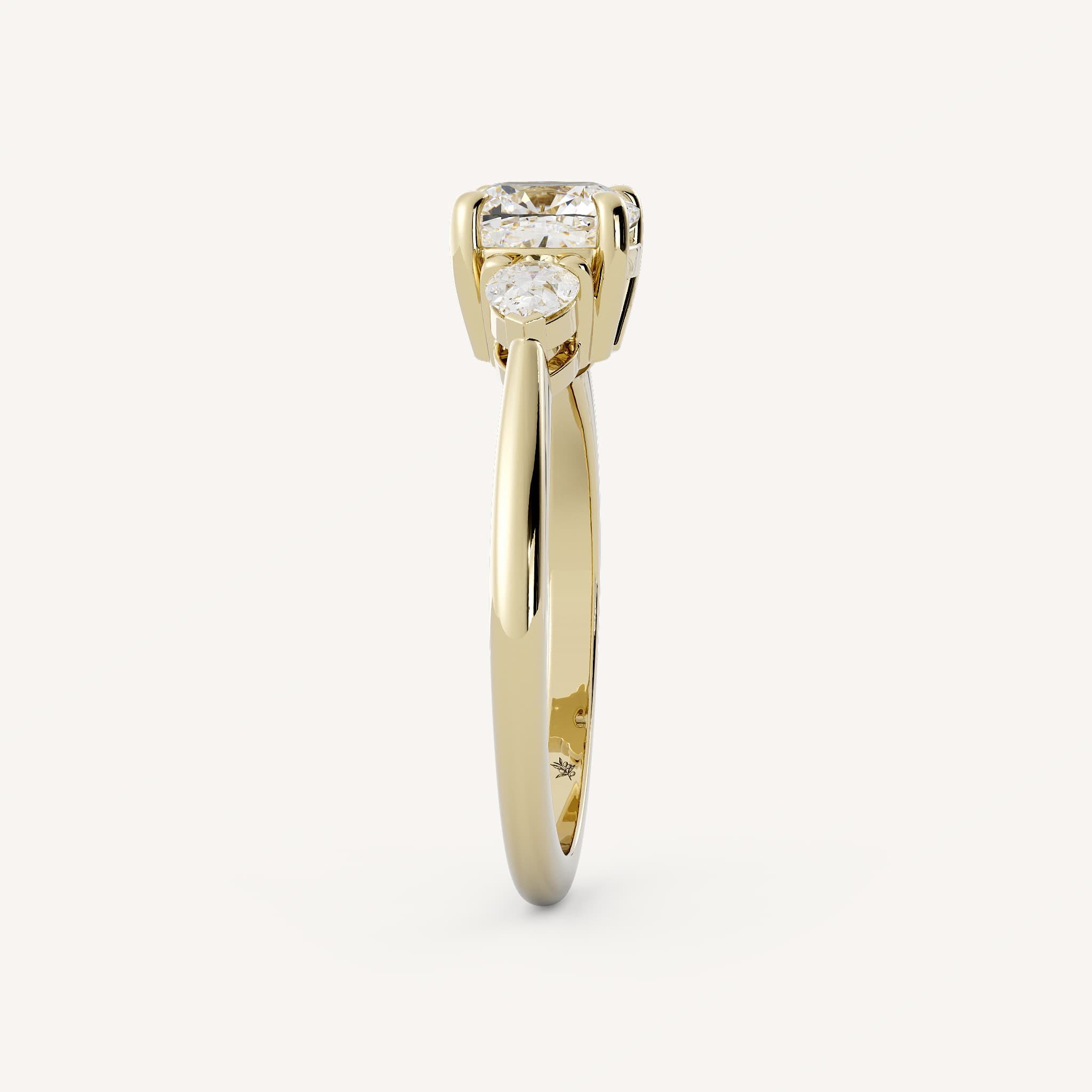 Hollis features a stunning cushion center stone with two pear side stones set in a three stone basket on a half round shank.