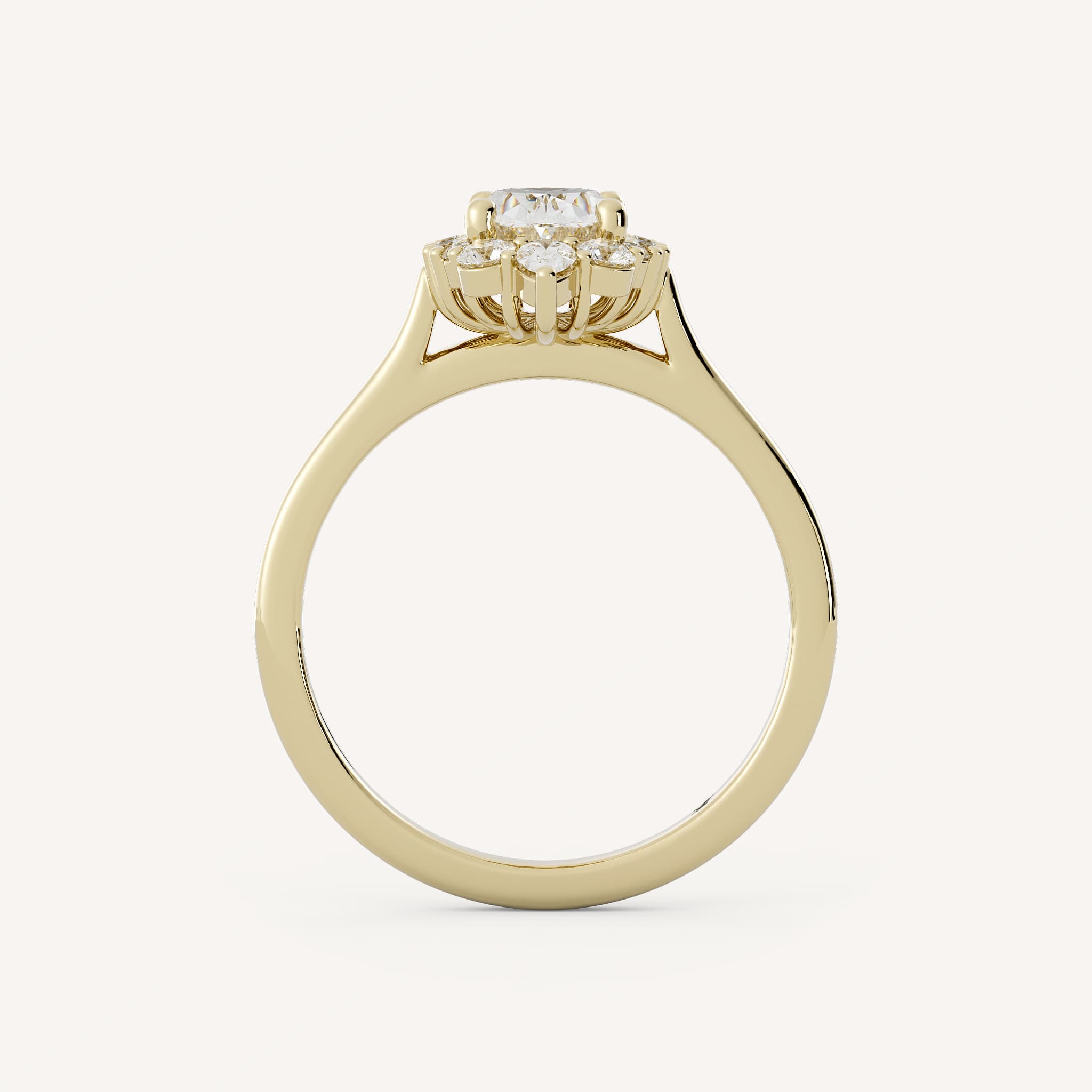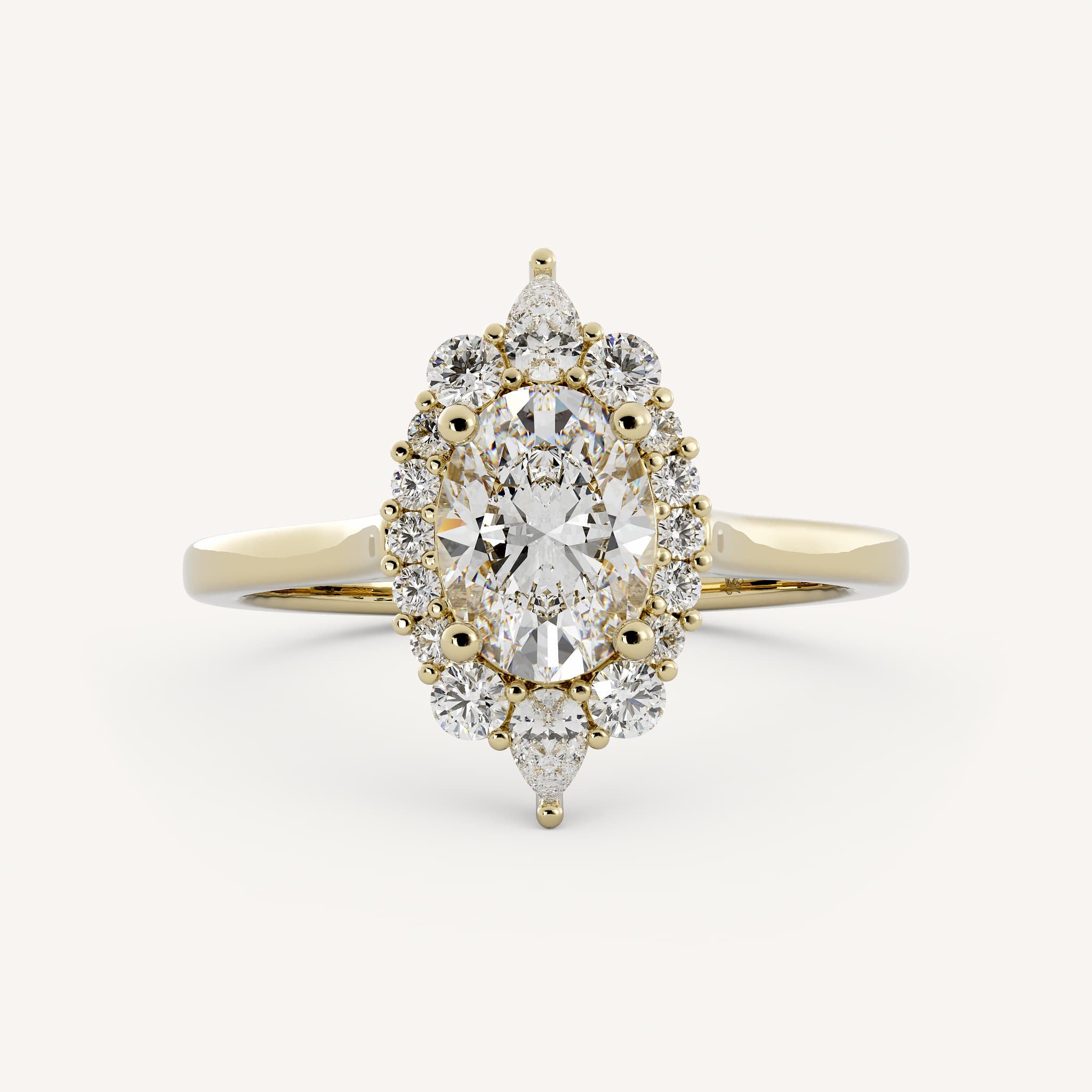 Indio features an oval center stone with a unique diamond halo of round and pear stones set in a cathedral basket setting on a half round flat edge shank.