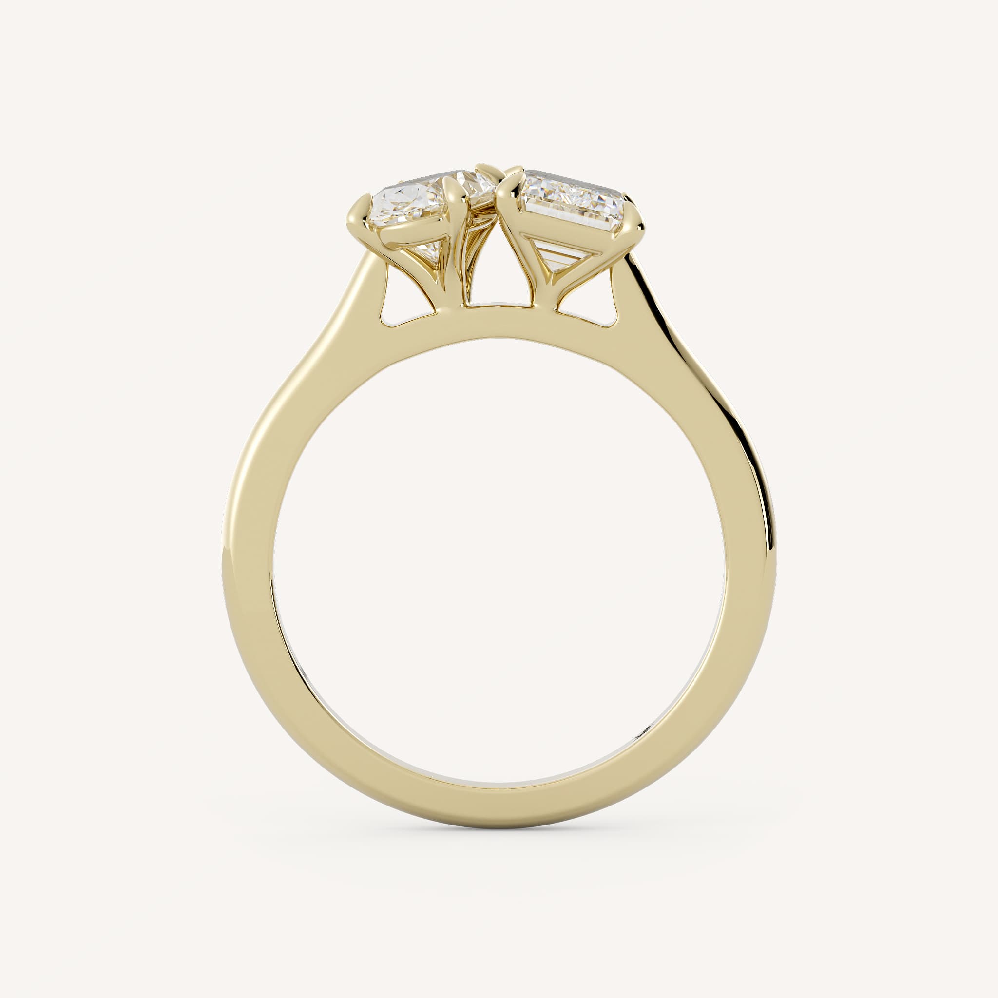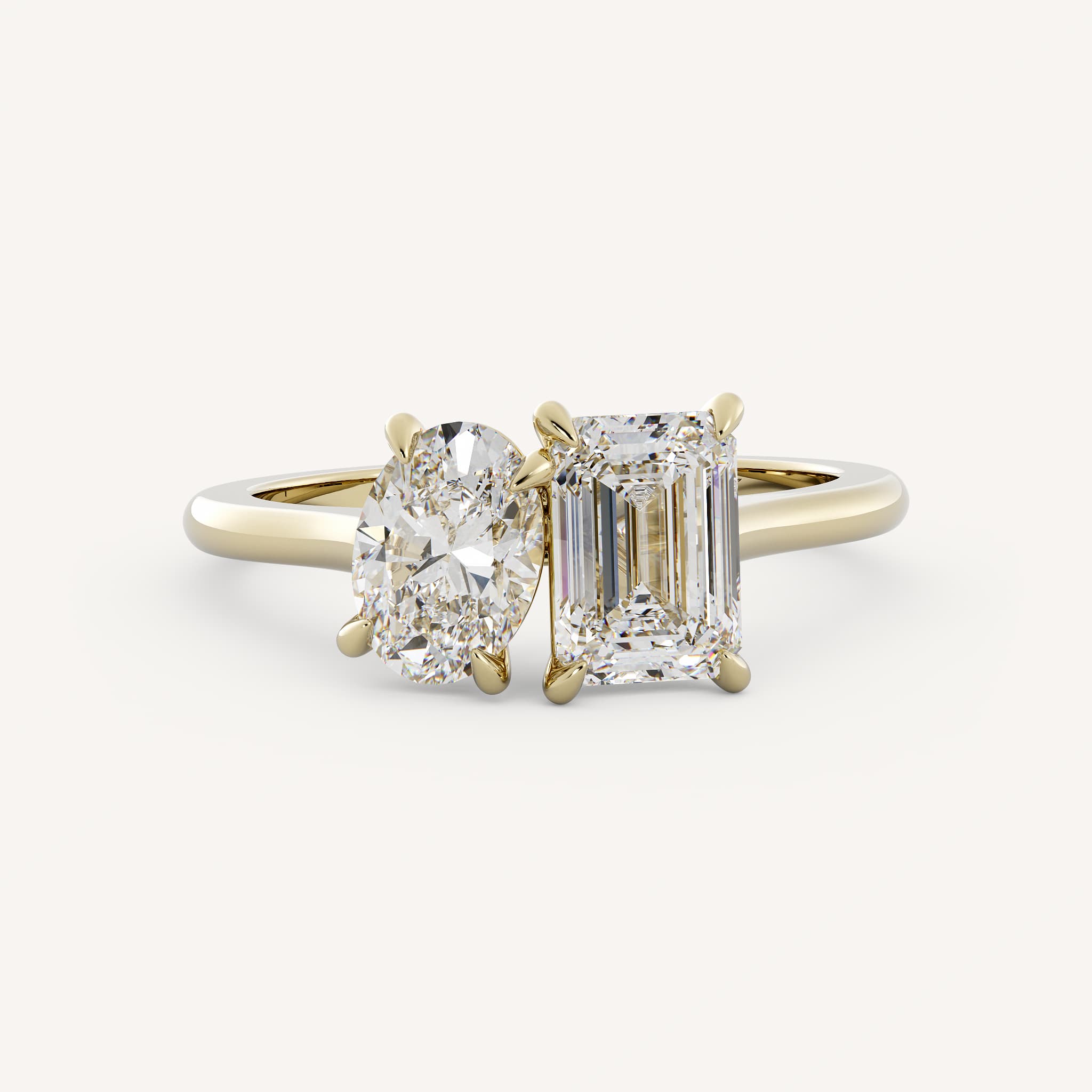 Lawson features a trendy 0.75CT oval and 1.00 CT emerald shaped center stone set side by side with claw prongs in a cathedral setting on a half round shank.