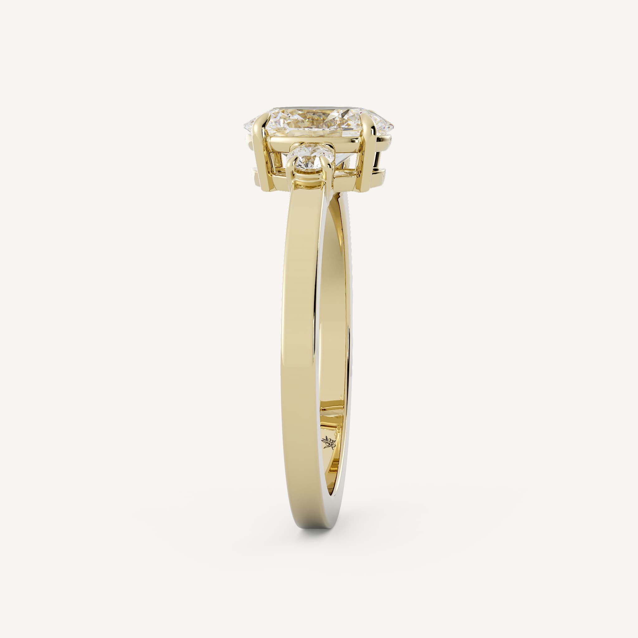Lincoln features an oval center stone set with two complementary round accent stones set in a three stone basket setting on a half round flat edge shank.