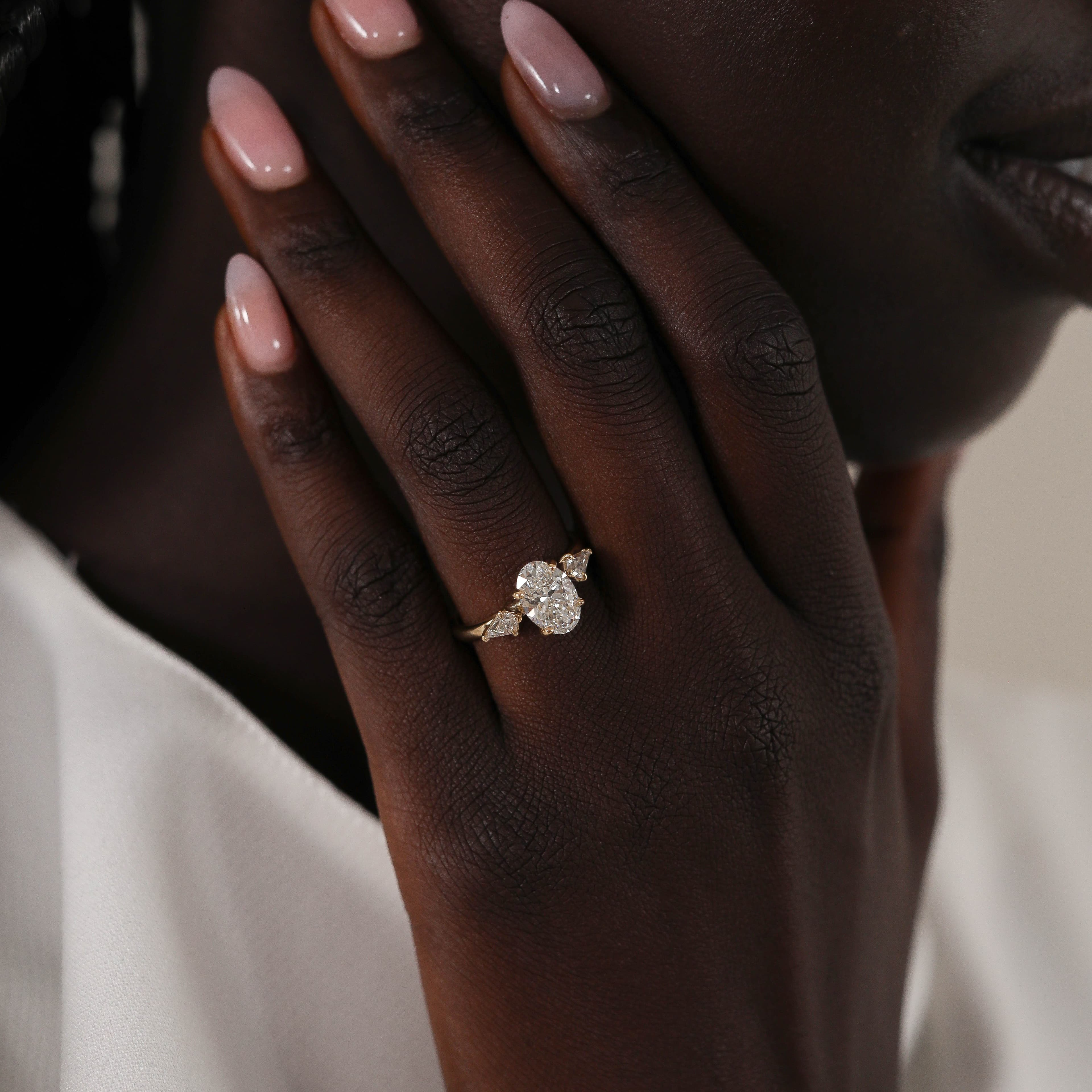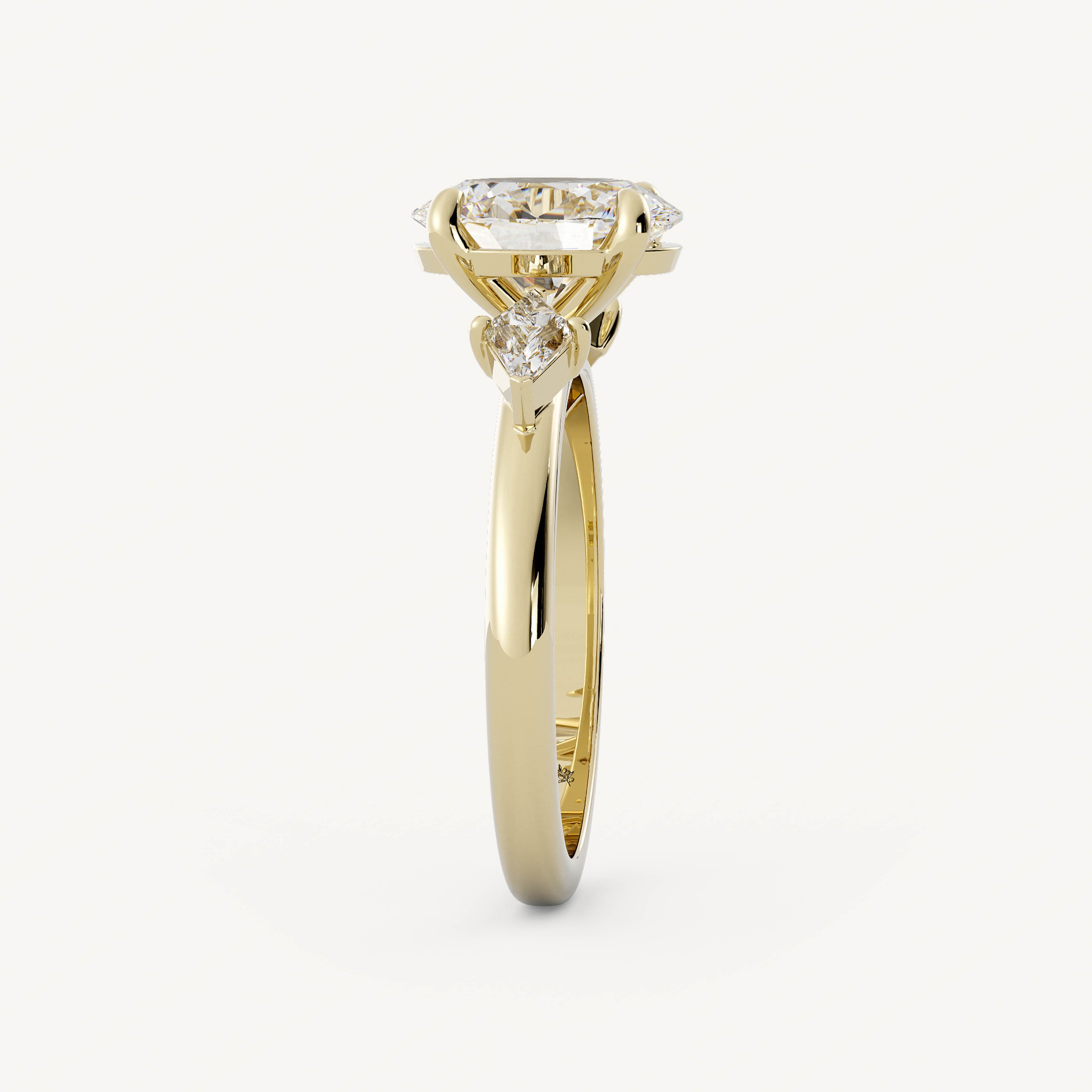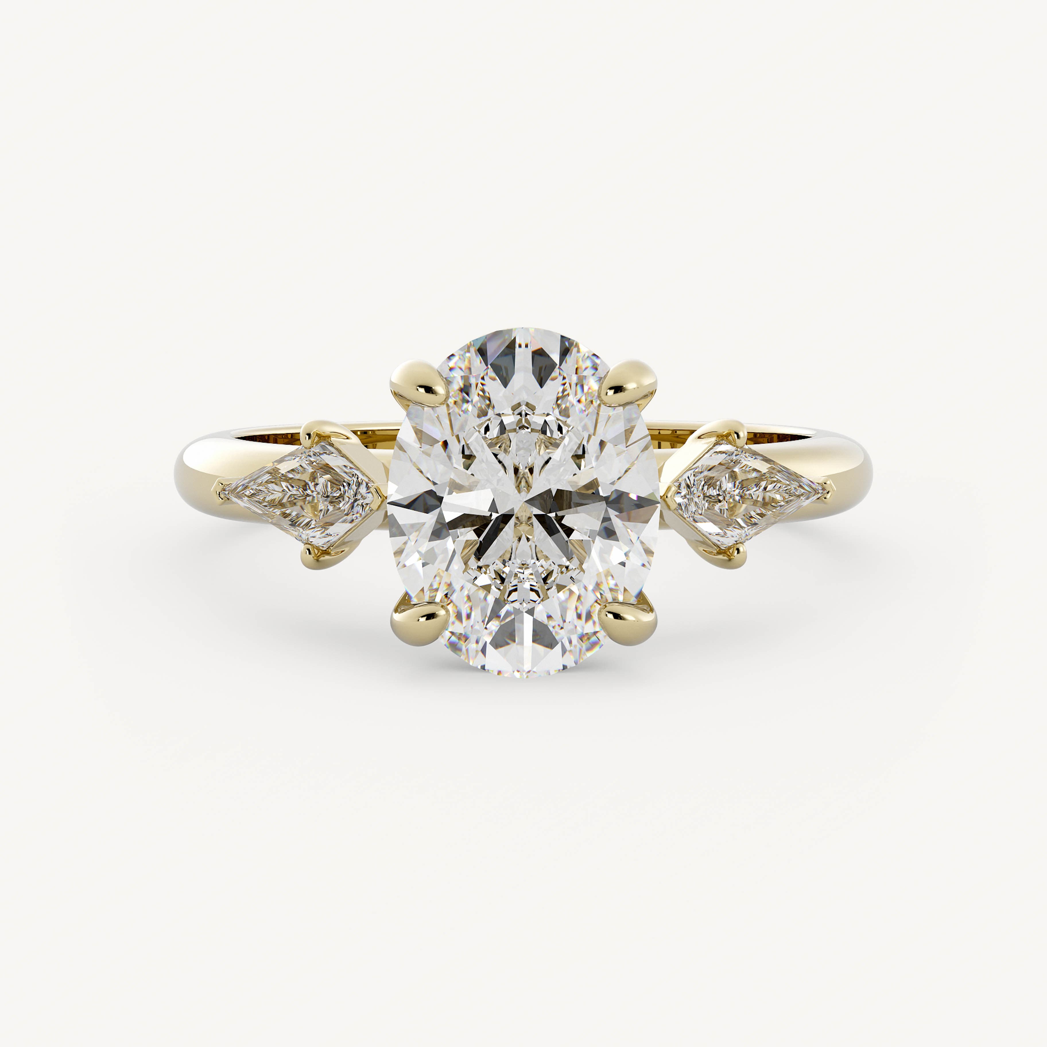 Lindon features an elegant oval center stone with kite shape accent stones set traditionally on a half round shank.
