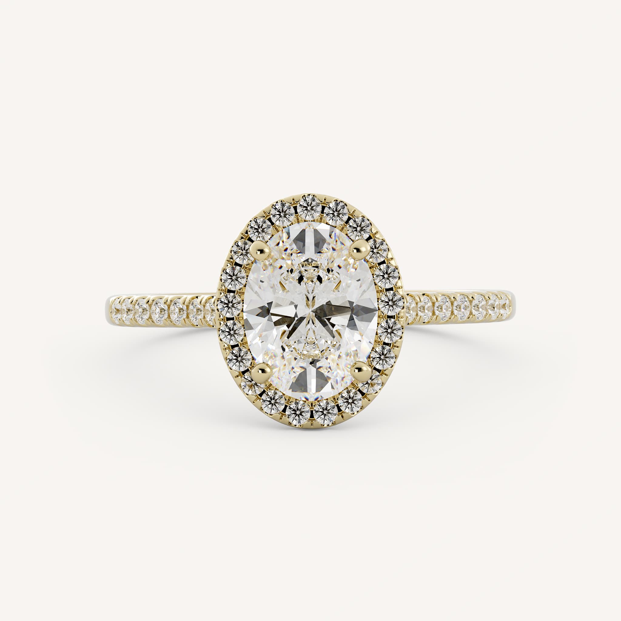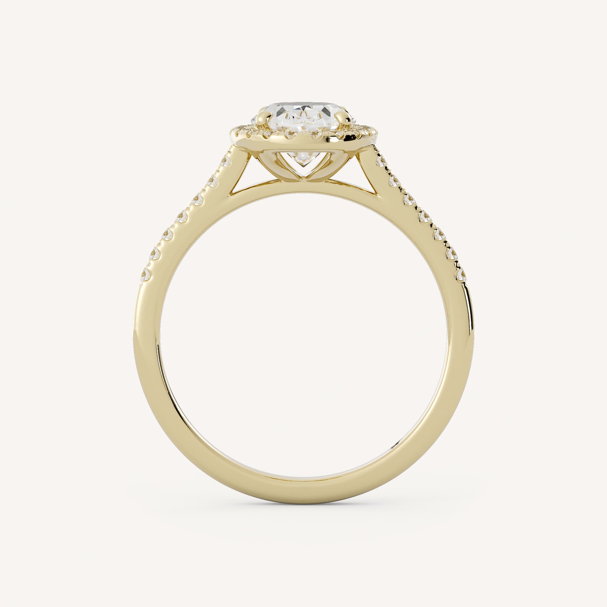 Mae features a charming oval center stone with a classic halo set in a cathedral setting on a scalloped prong shank.