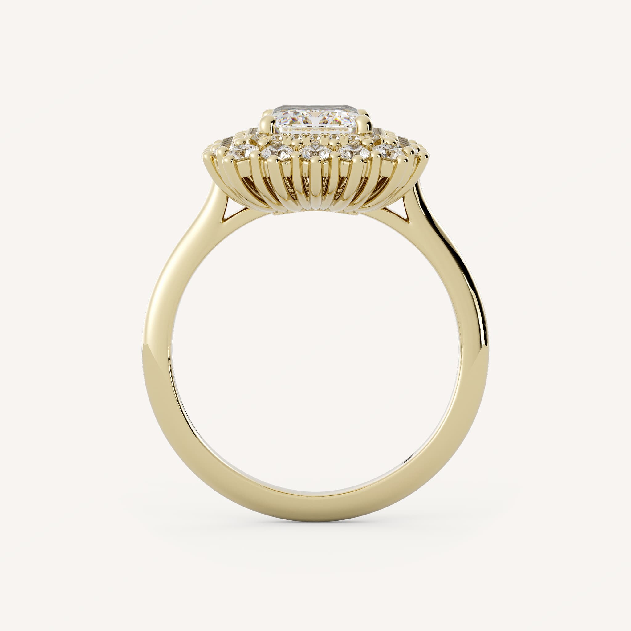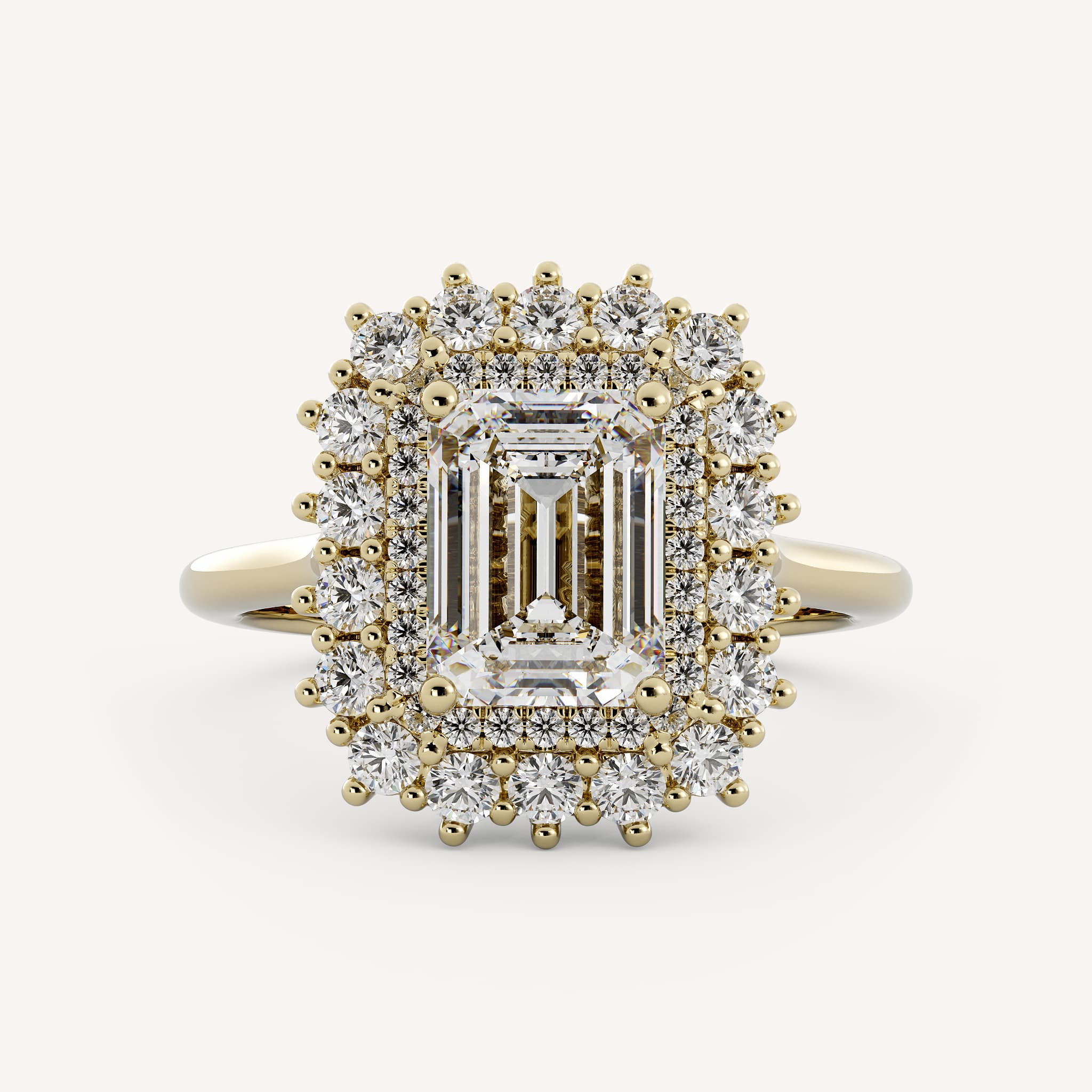 Margo features an emerald shaped center stone with a uniform double burst halo in a basket setting on a half round shank.
