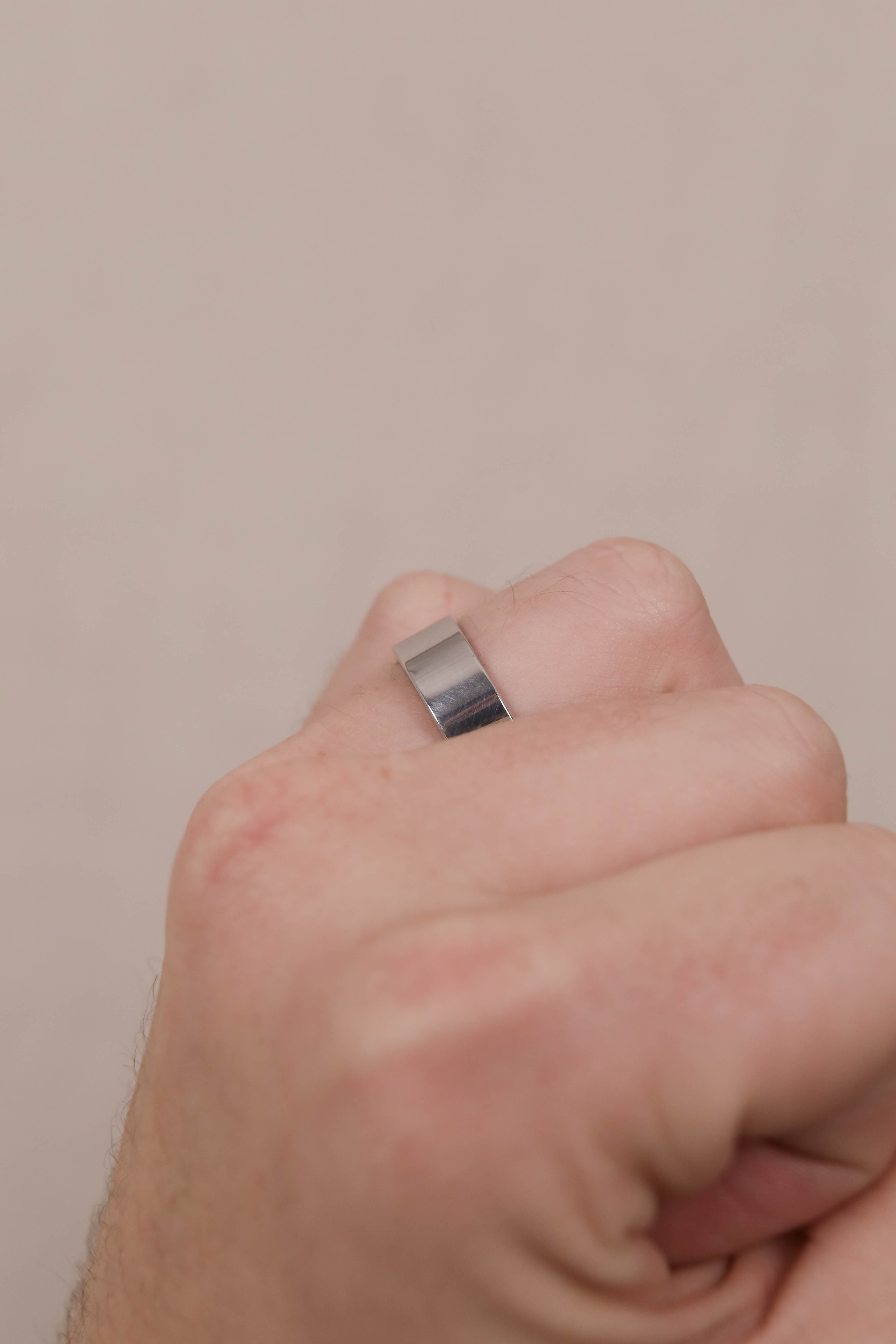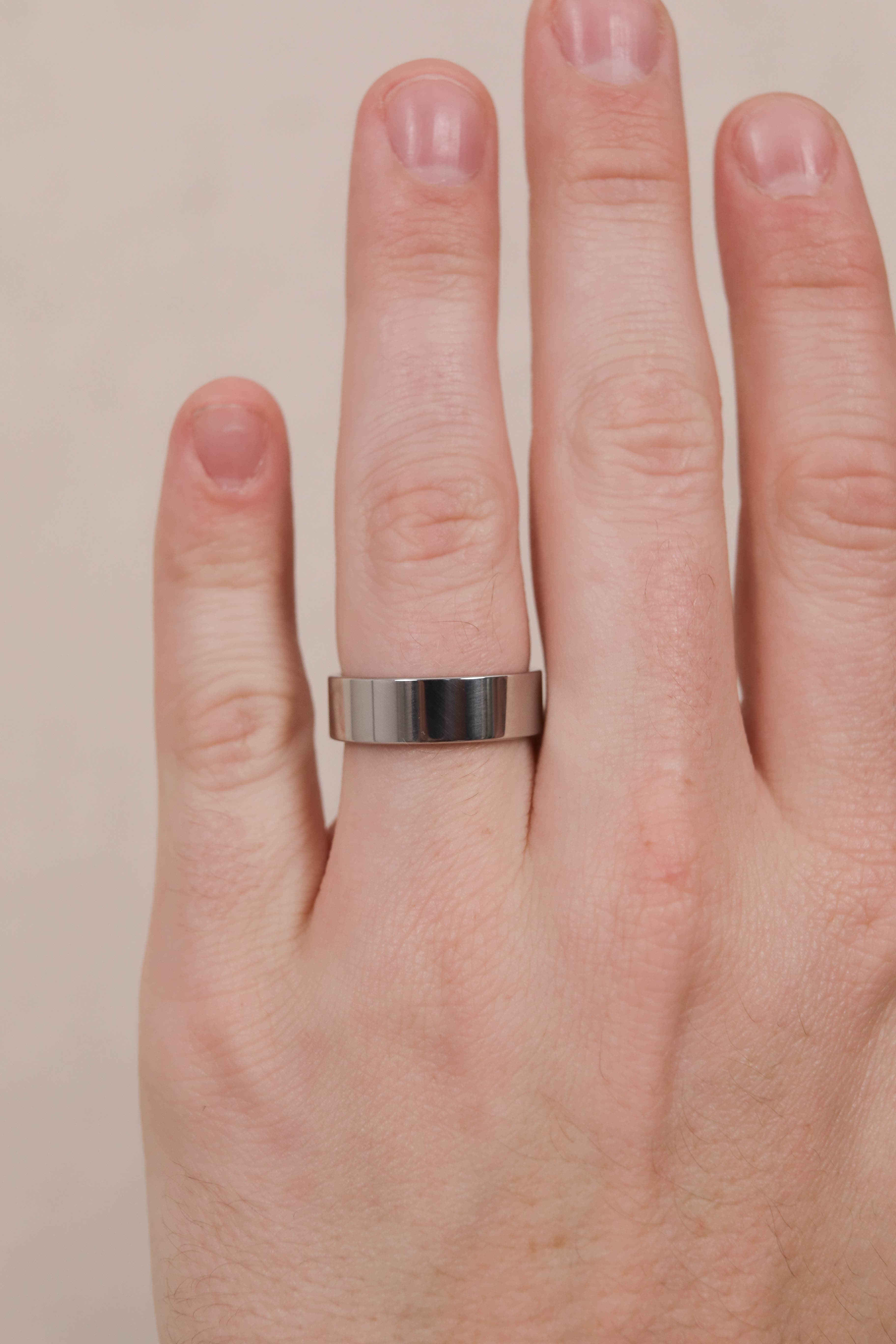 Max is a flat titanium ring with a high polish finish. Comes in 6mm, 7mm, and 8mm widths.