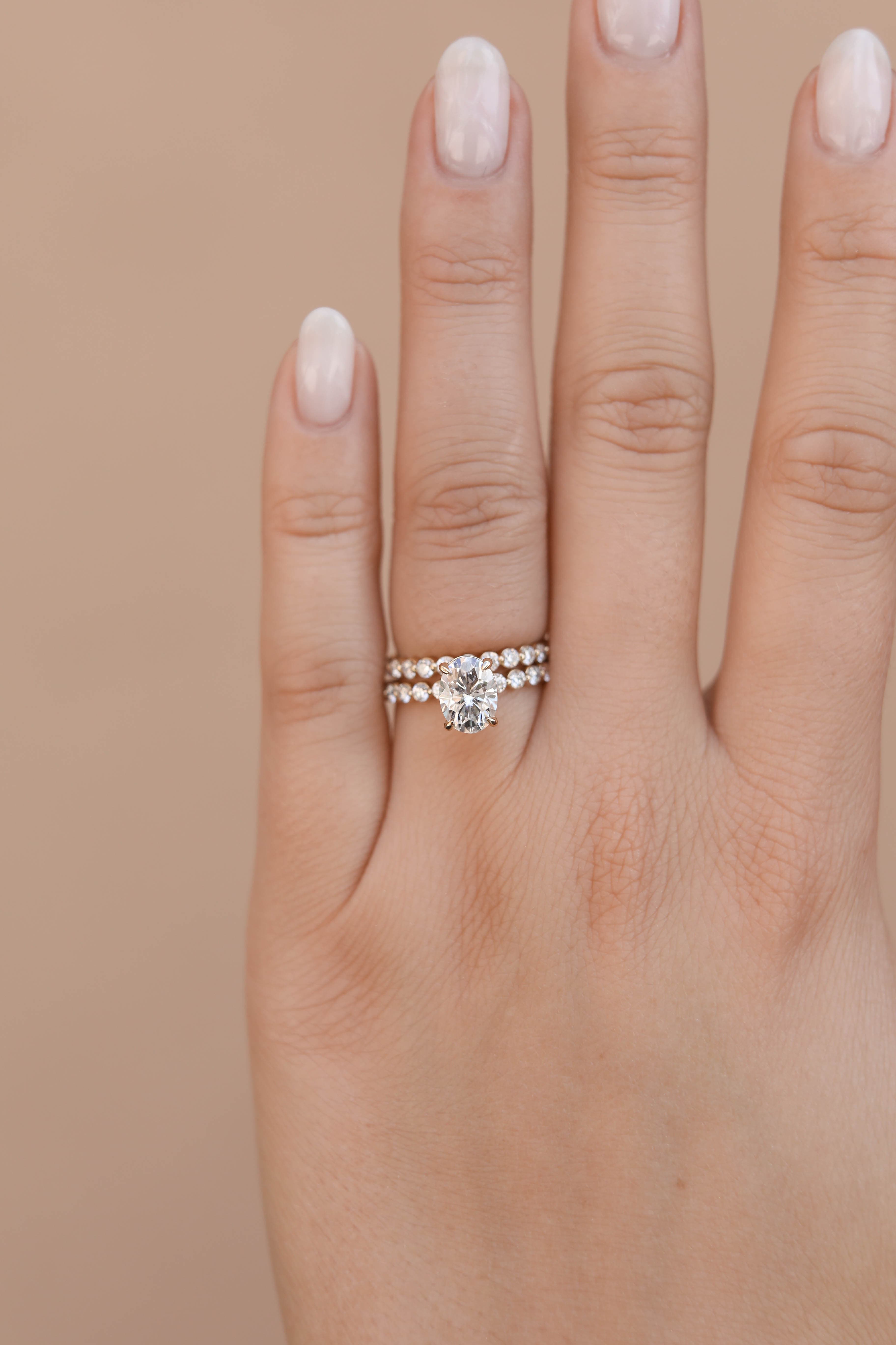 Megan features a charming oval center stone set in a traditional solitaire setting with single shared prongs. Paired with Dotty which features small round diamonds with single shared prongs on a ¾ eternity band.