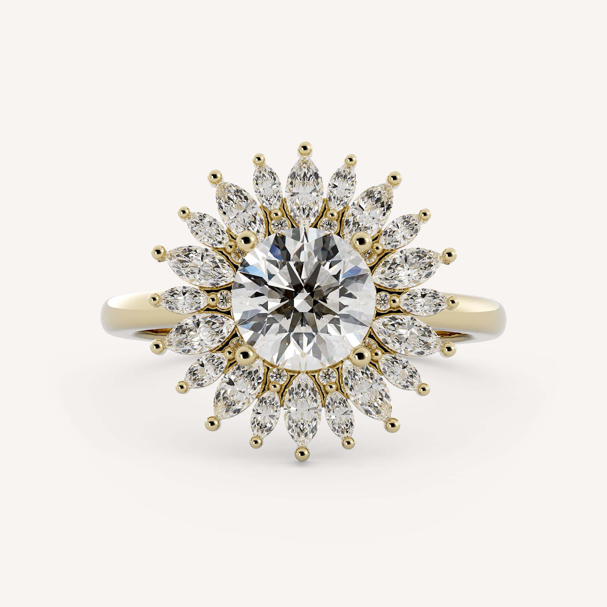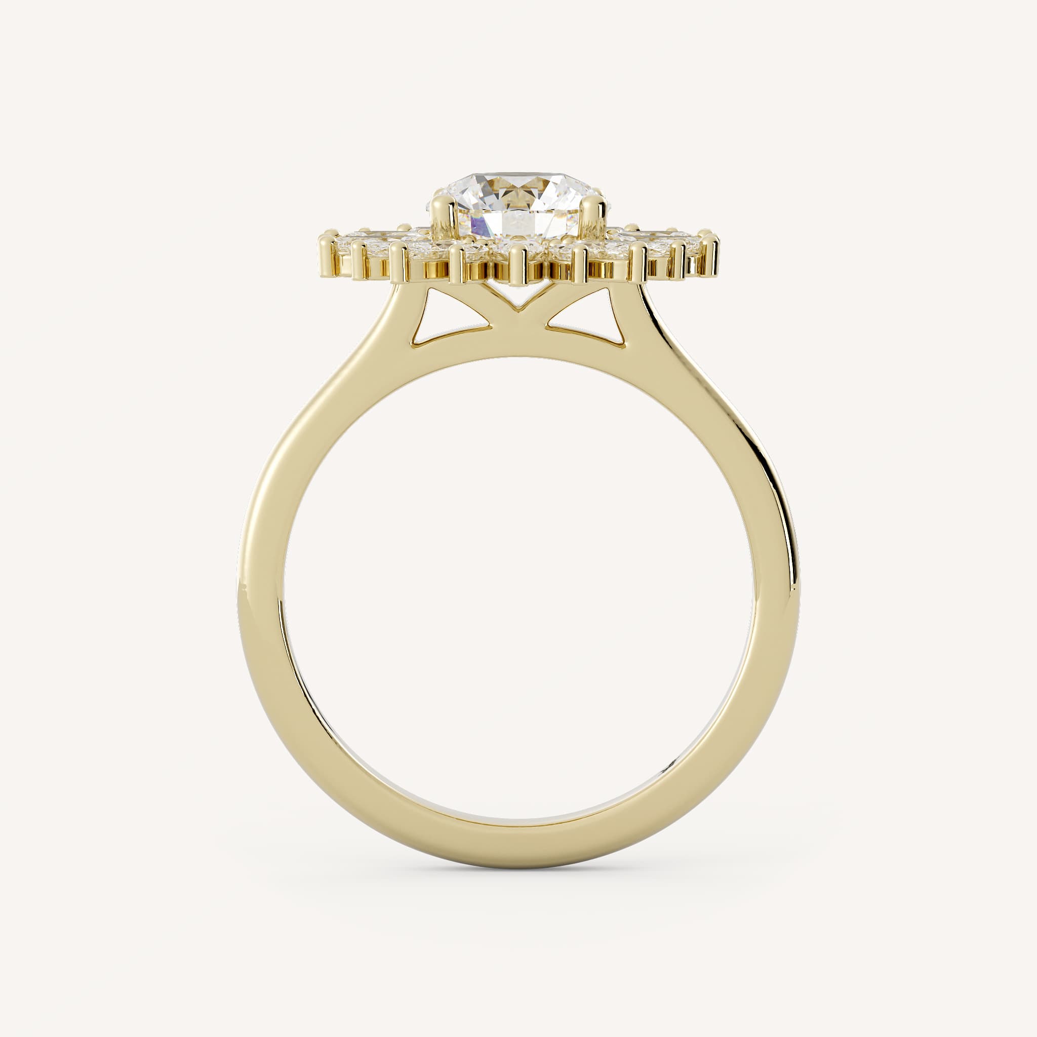 Mikayla features a round center stone with an intricate halo of round and marquise stones arranged in a floral pattern with a cathedral setting on a half round shank.