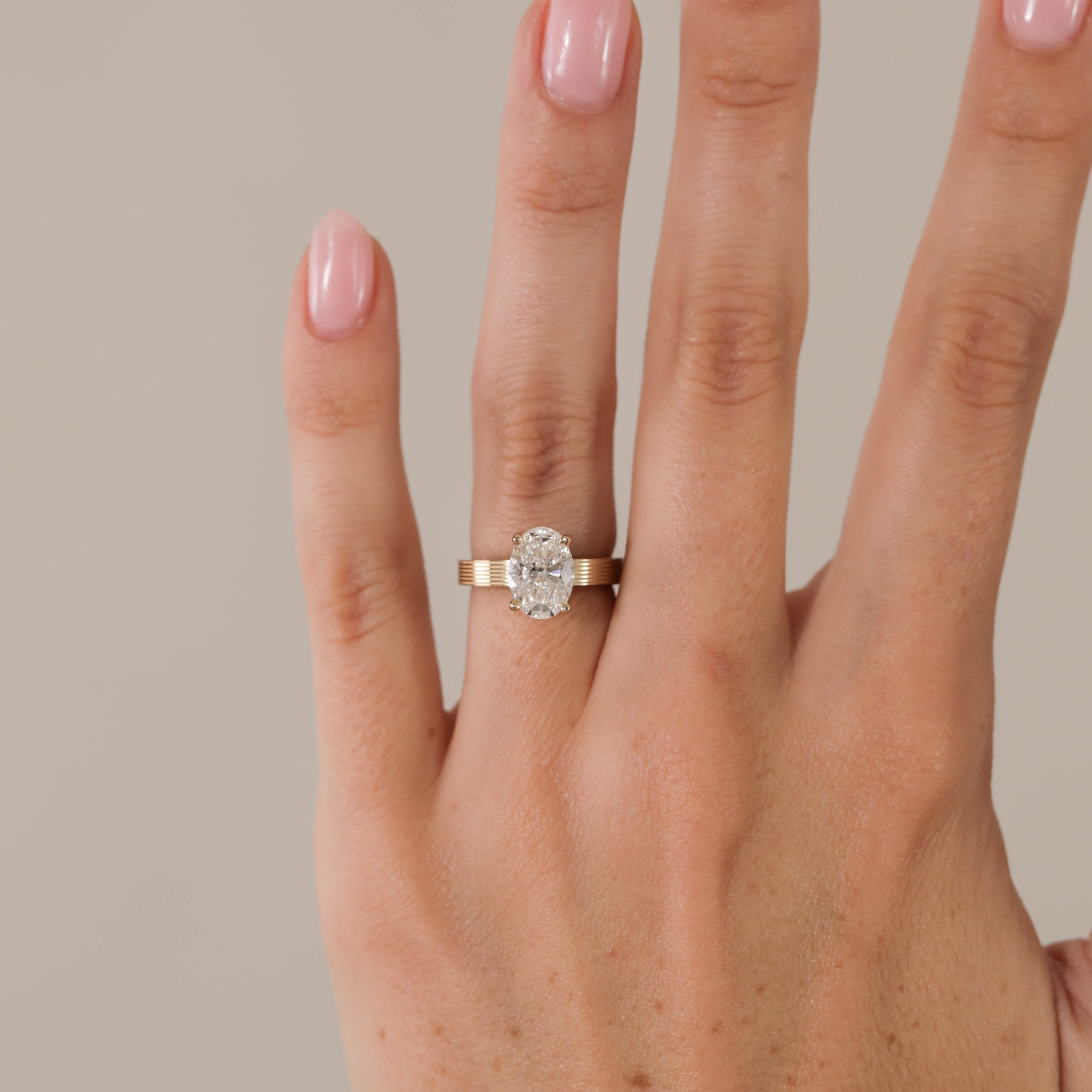 Osborn features an oval shaped center stone set in a traditional solitaire setting with a bold multi grooved gold shank.