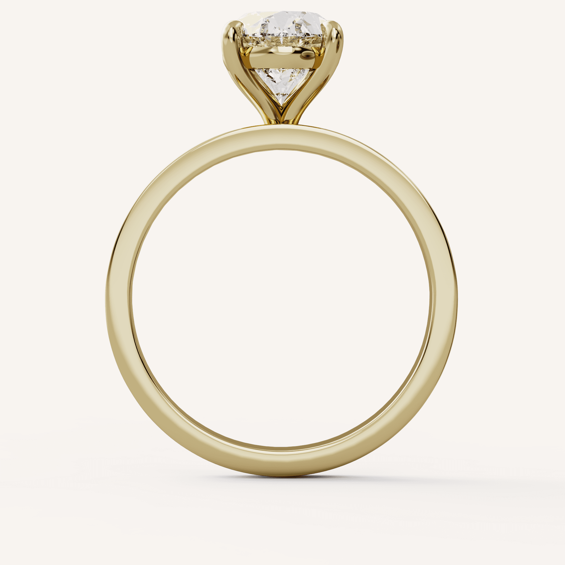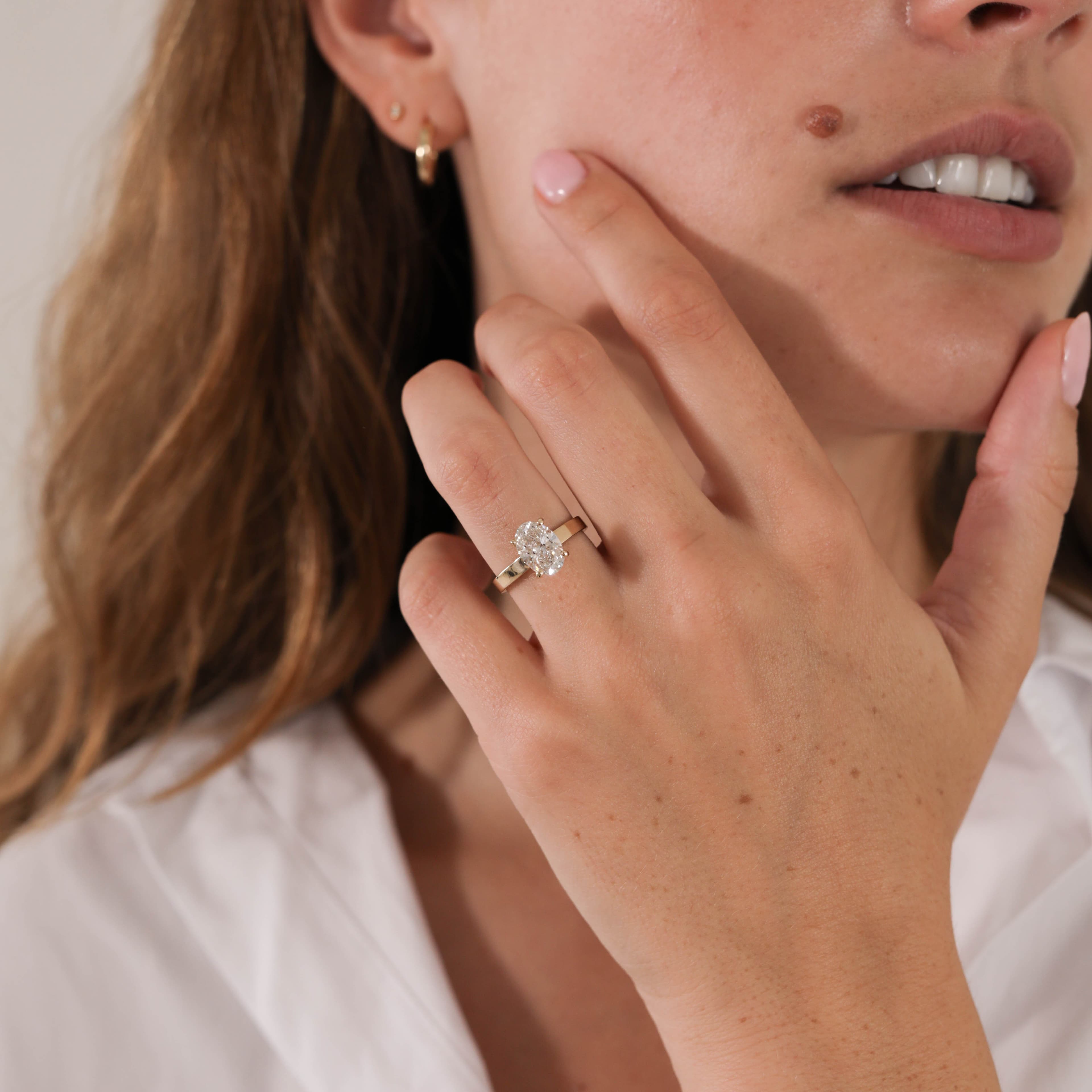 Ozzie features an oval center stone set in a traditional solitaire setting with claw prongs on a wide 3mm flat shank.