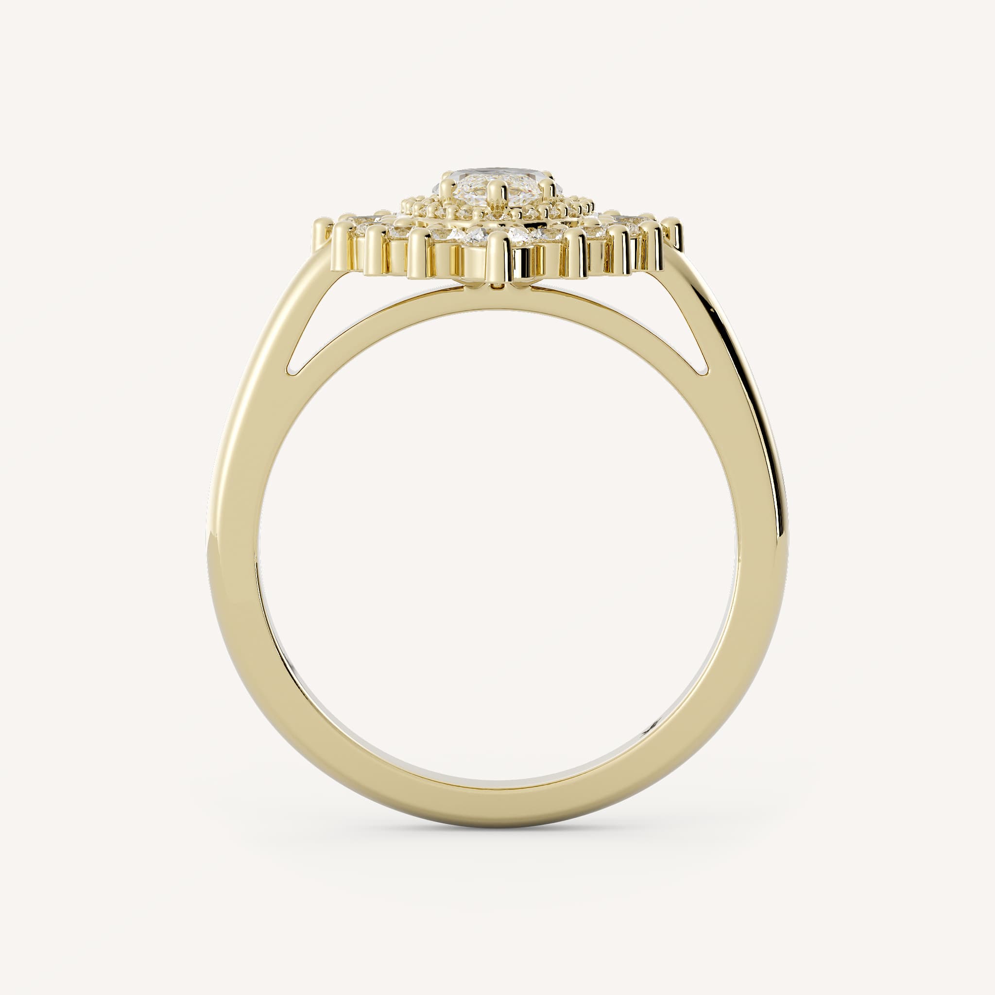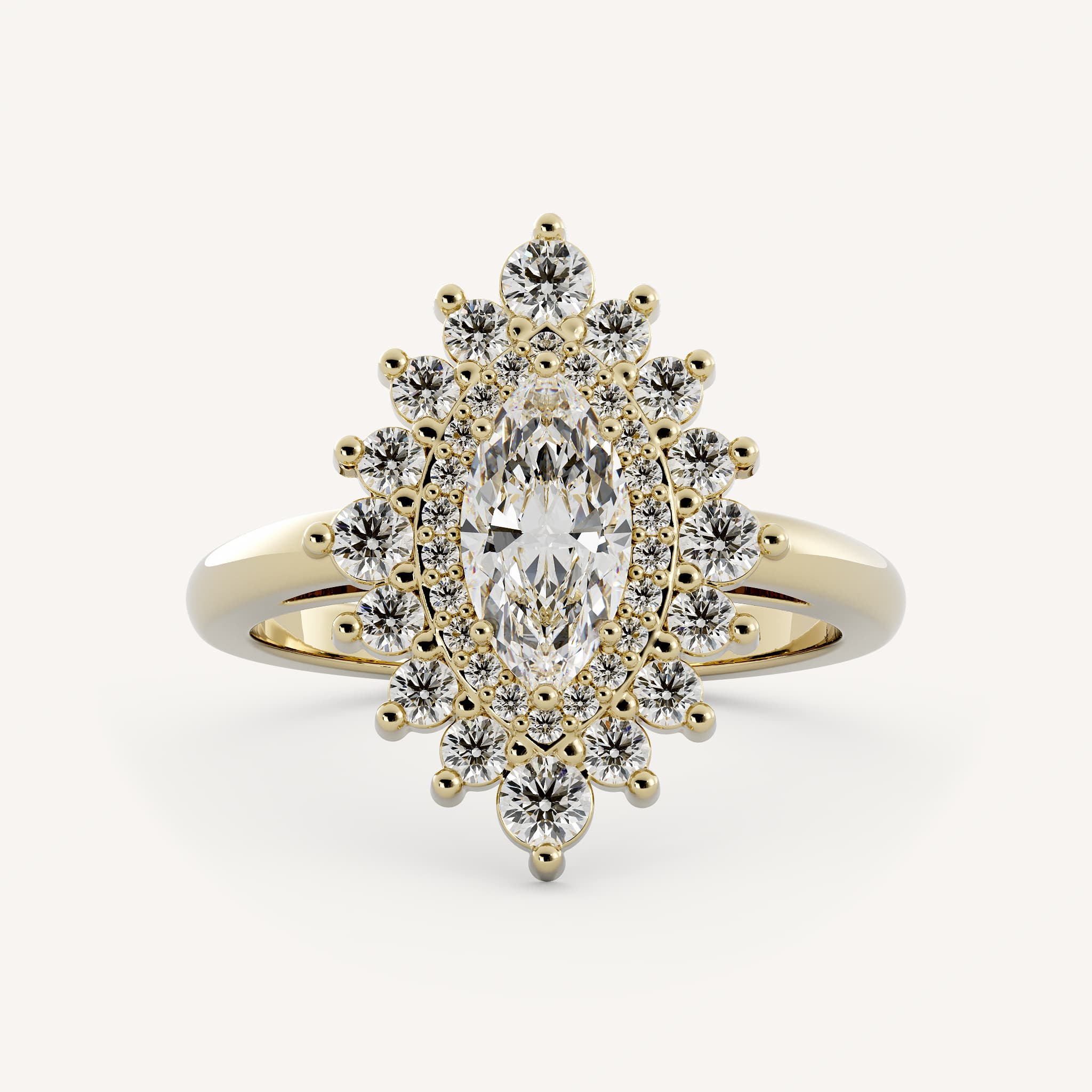 Parker features a marquise center stone with a complex double burst halo with a cathedral setting on a half round shank.
