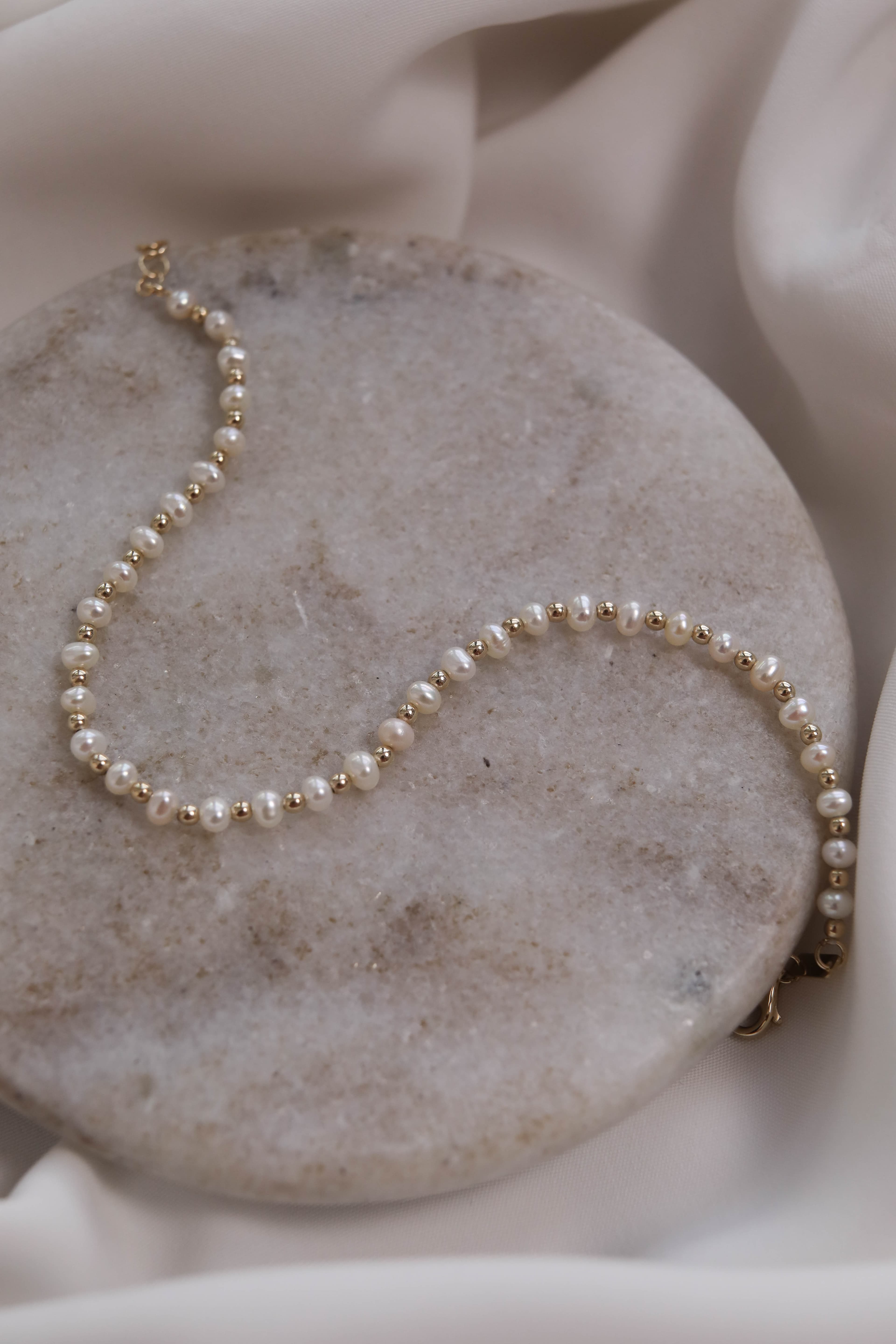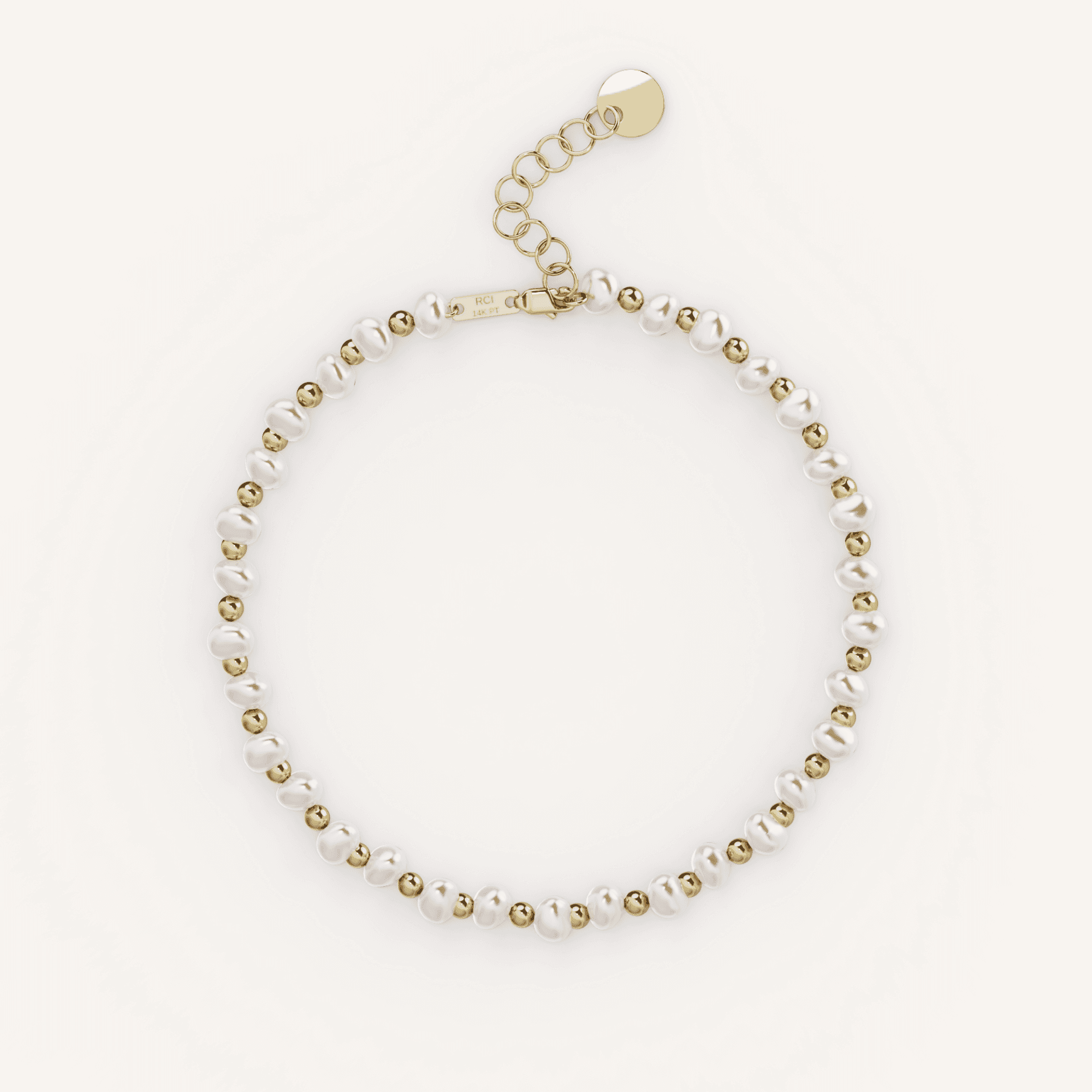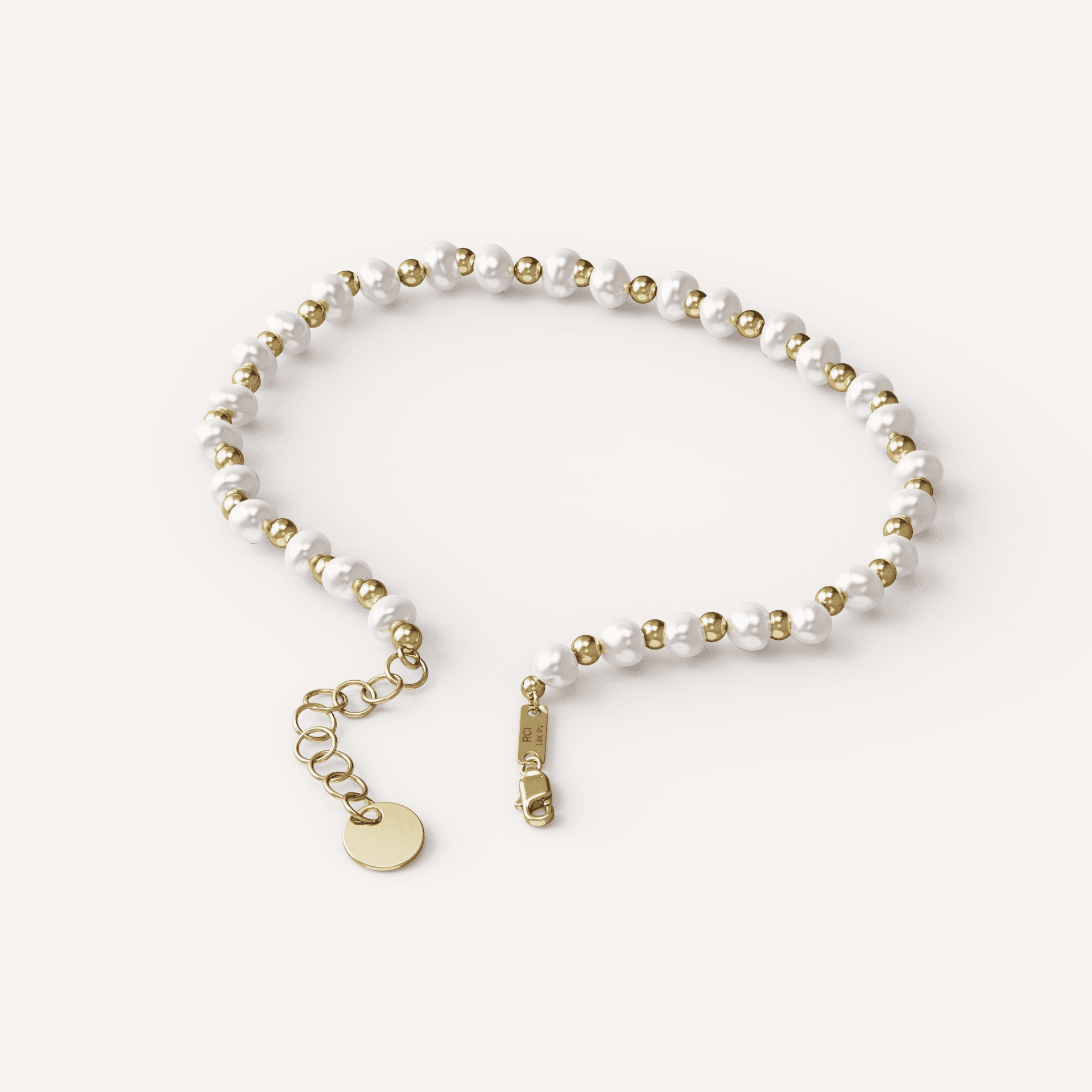 The Pearl & Gold Beaded Bracelet elegantly rotates between 14K yellow gold beads and 3.0-to-3.9-millimeter elliptical white freshwater pearls creating the perfect stand alone or stackable fine jewelry bracelet. Eight inches in length.
