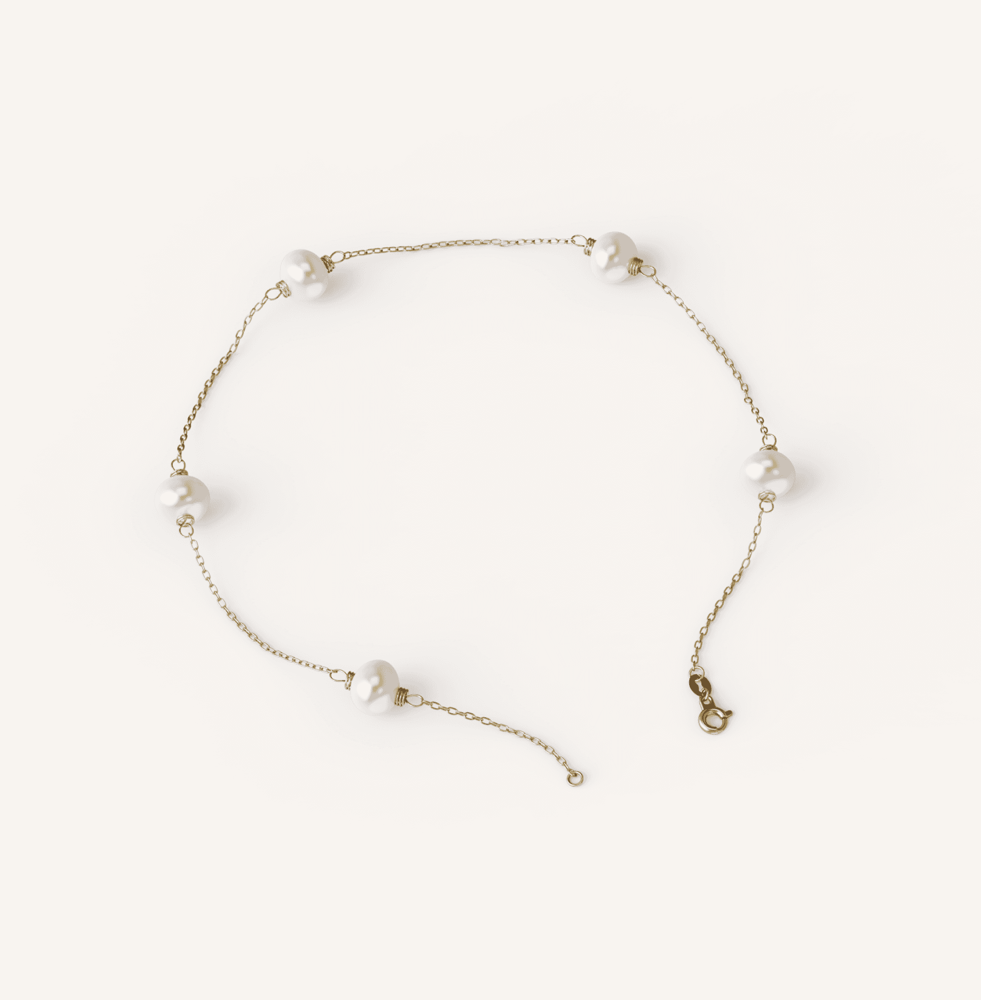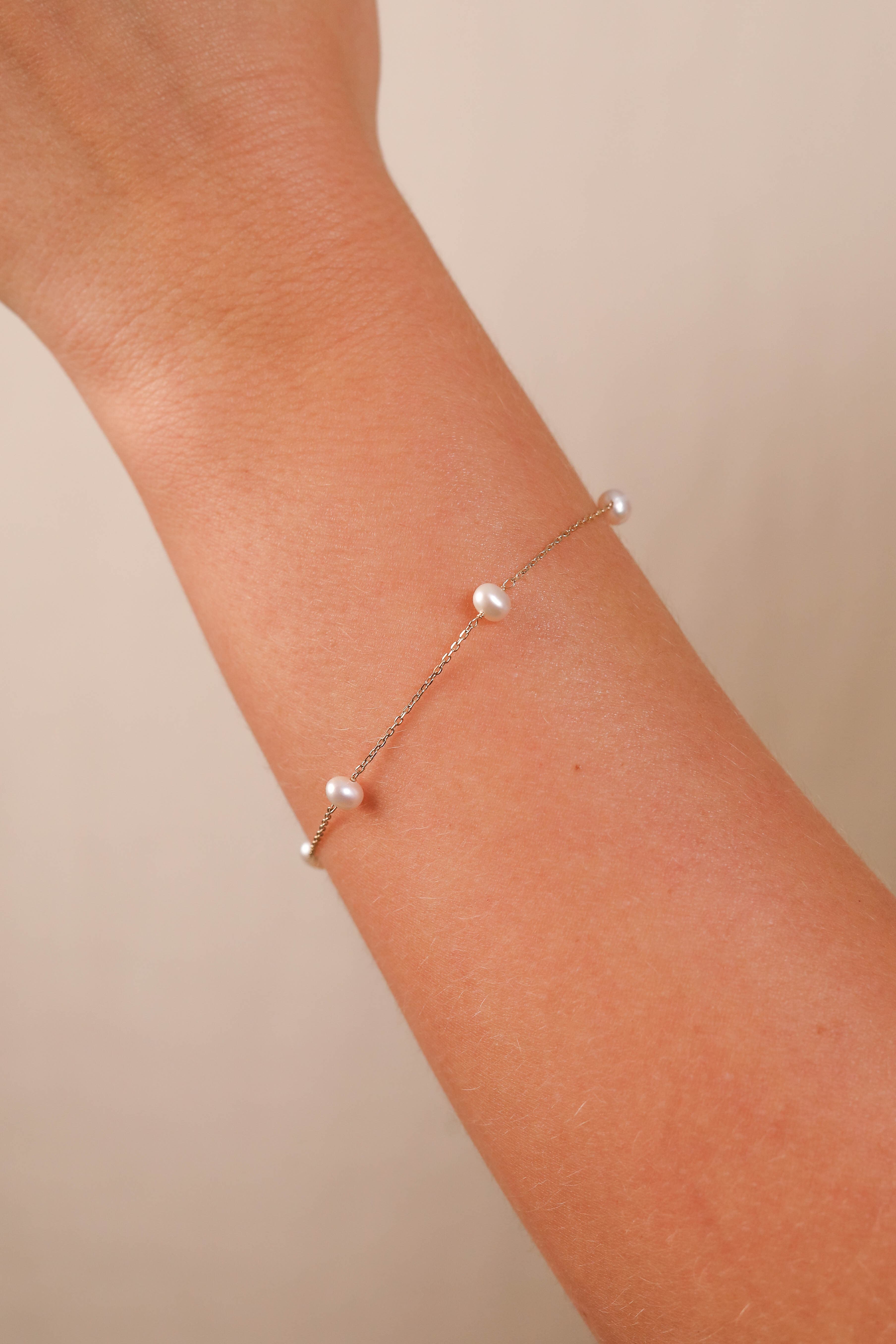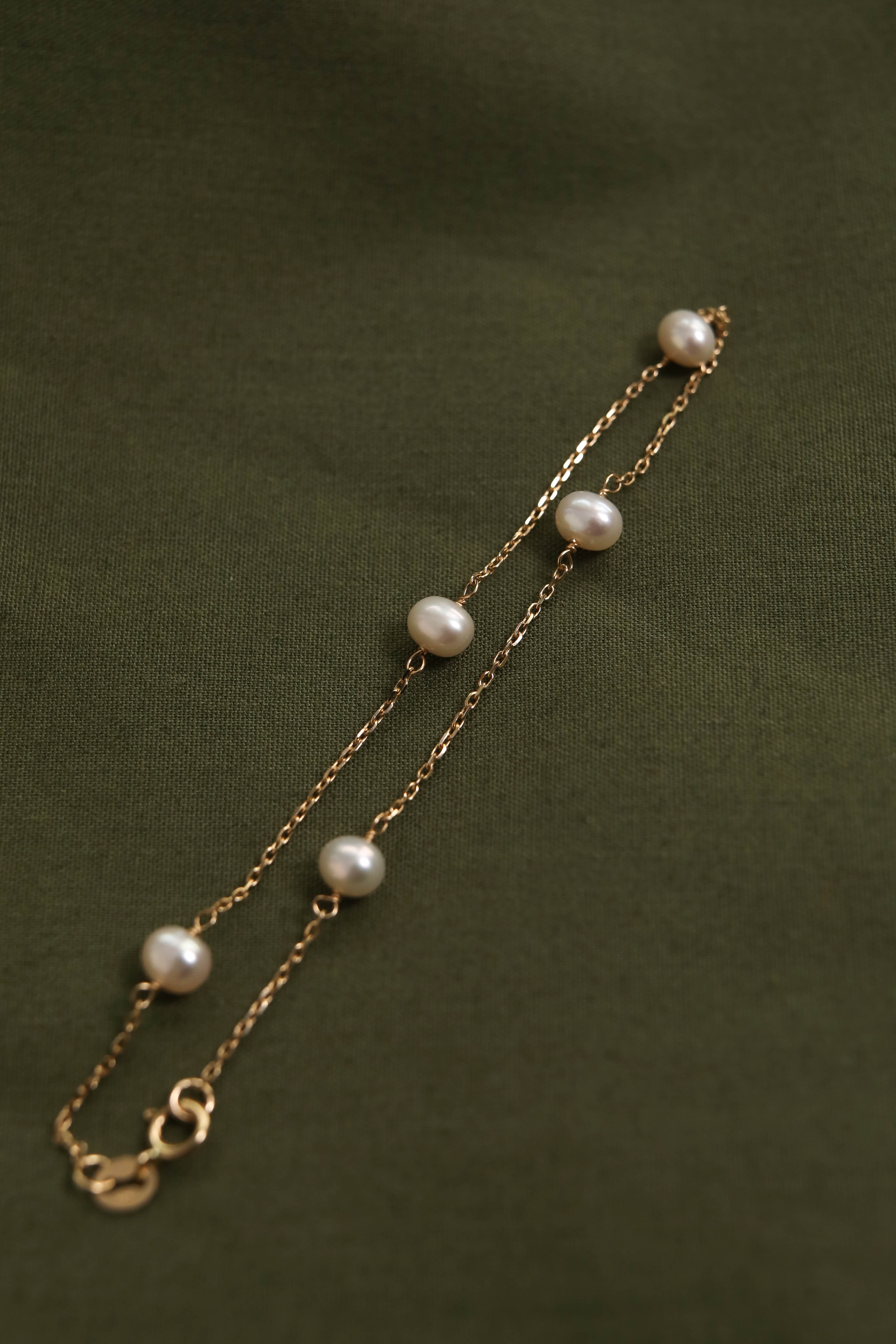 Pearl Station Bracelet is a simple 7-inch gold chain with round cultured freshwater pearls spaced along the chain complete with a spring ring clasp.
