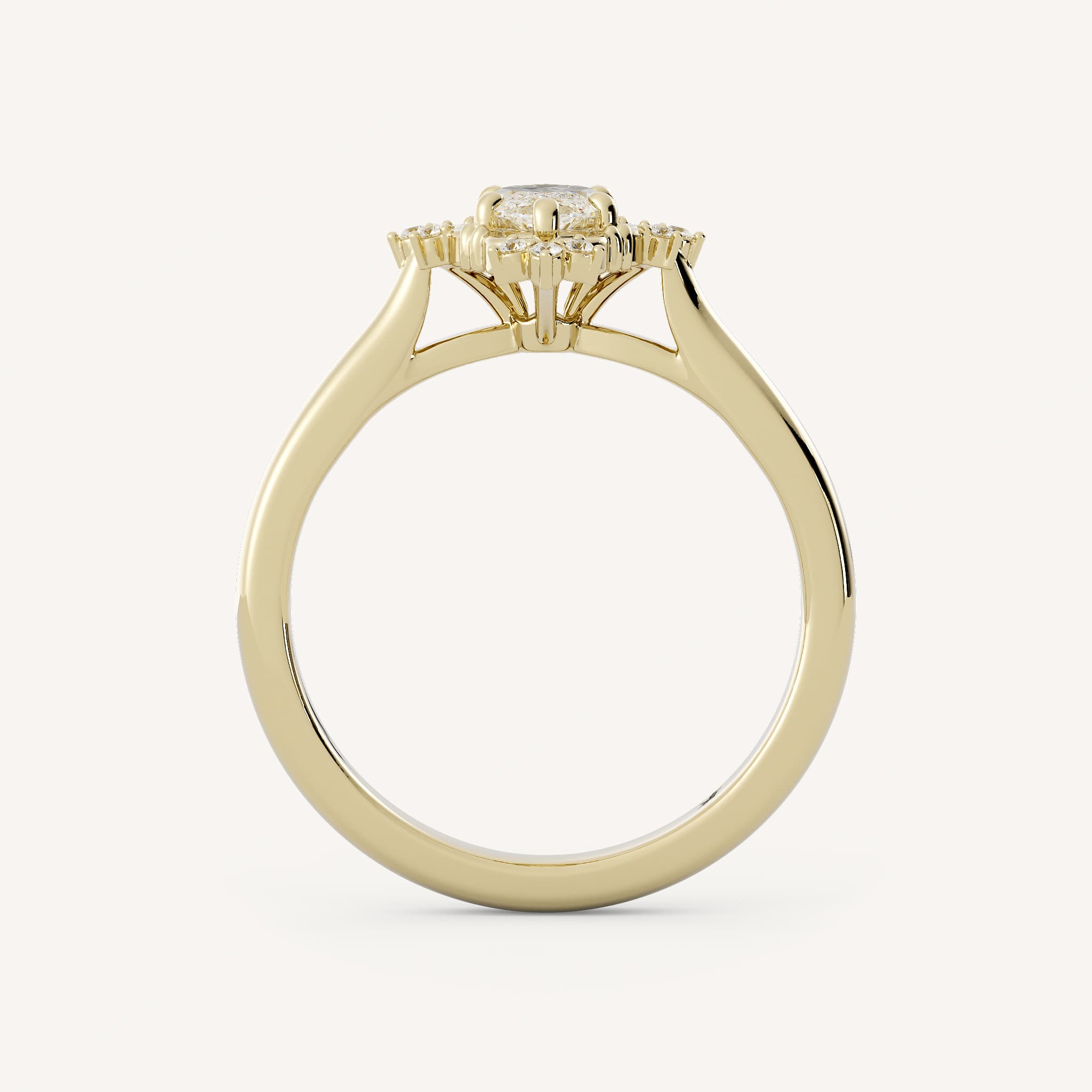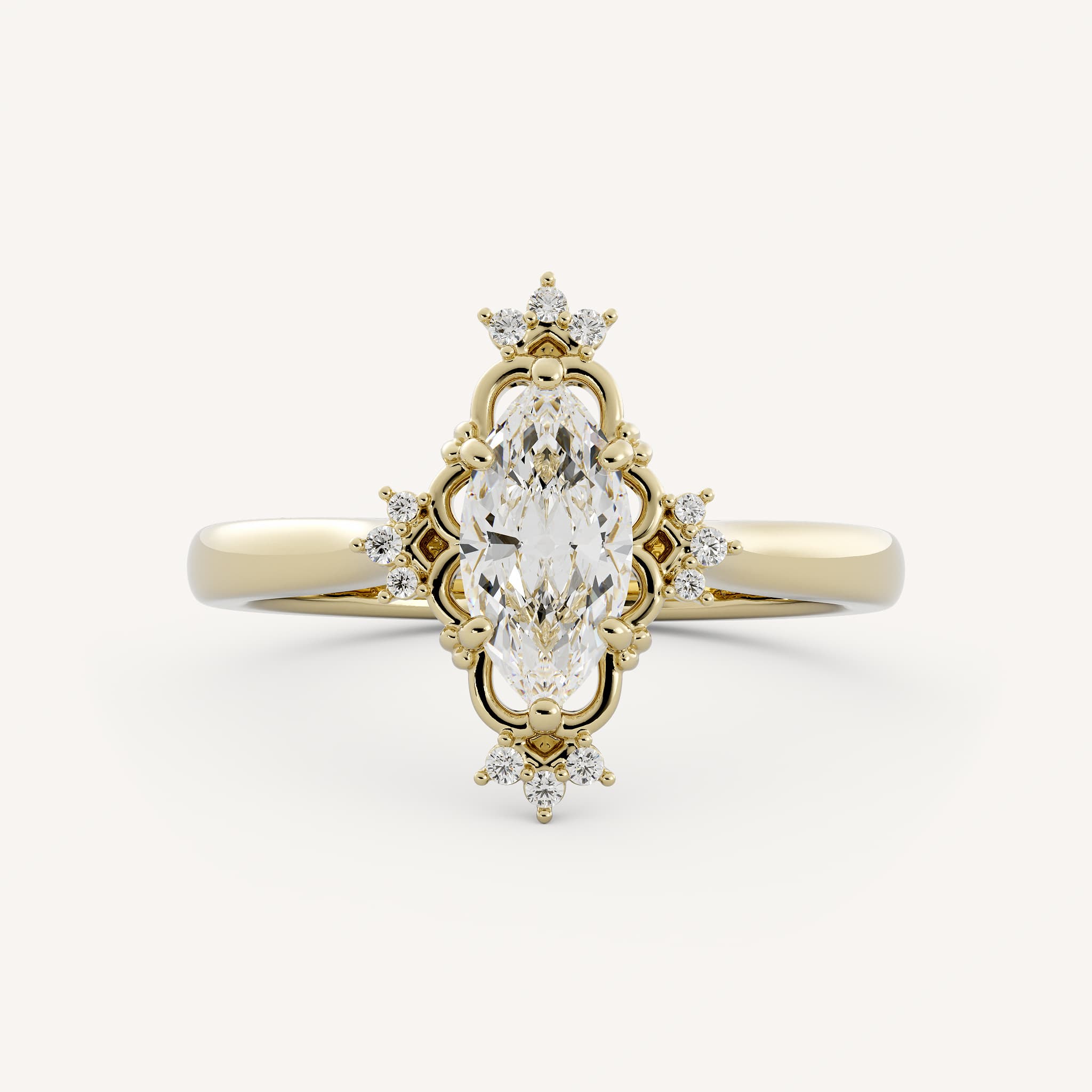 Piper features a marquise center stone sesurrounded by an ornate halo with clusters of round diamonds set in a cathedral setting on a half round flat edge shank.