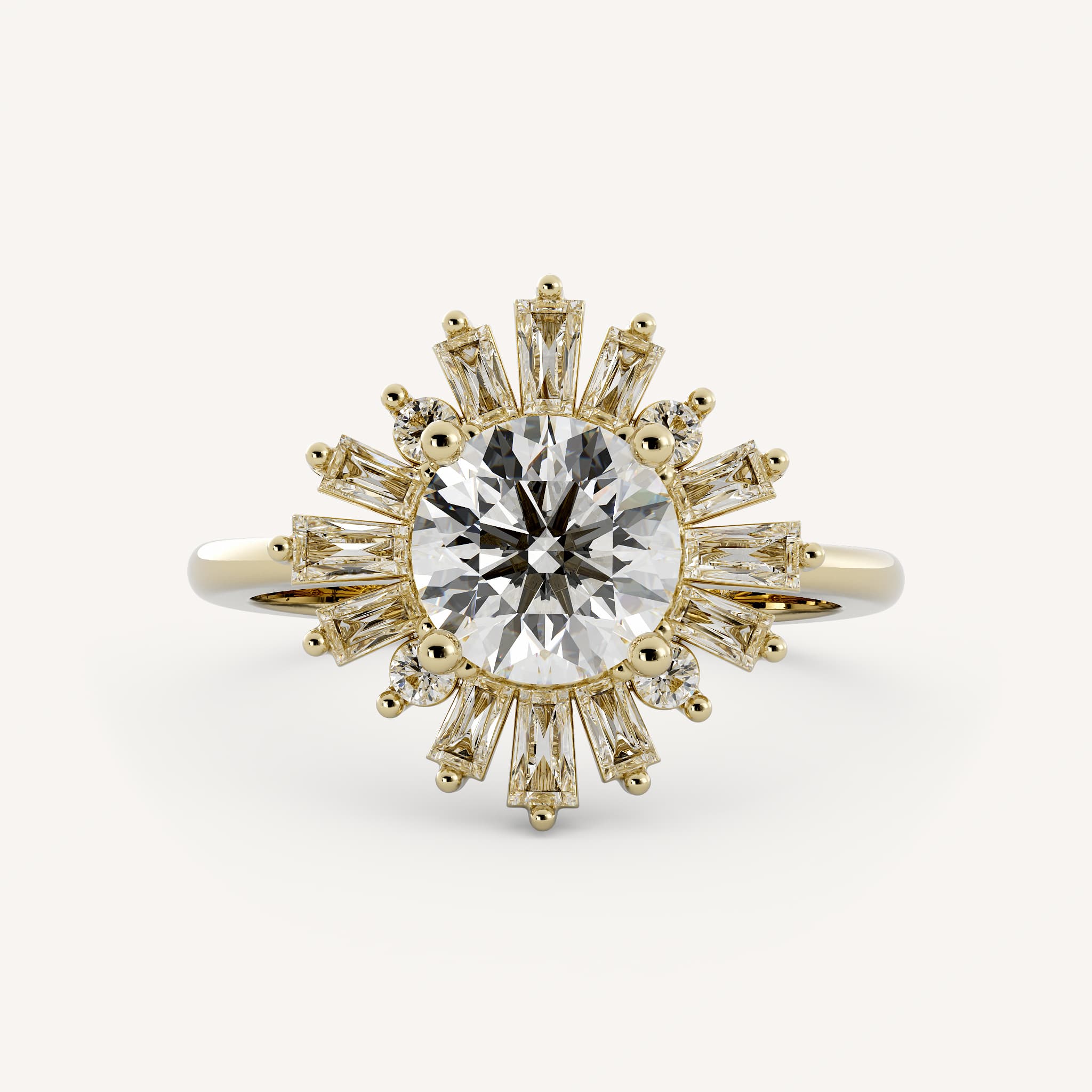 Pippa features a round center stone set in a whimsical halo made of baguette and round stones in a basket setting and half round shank.