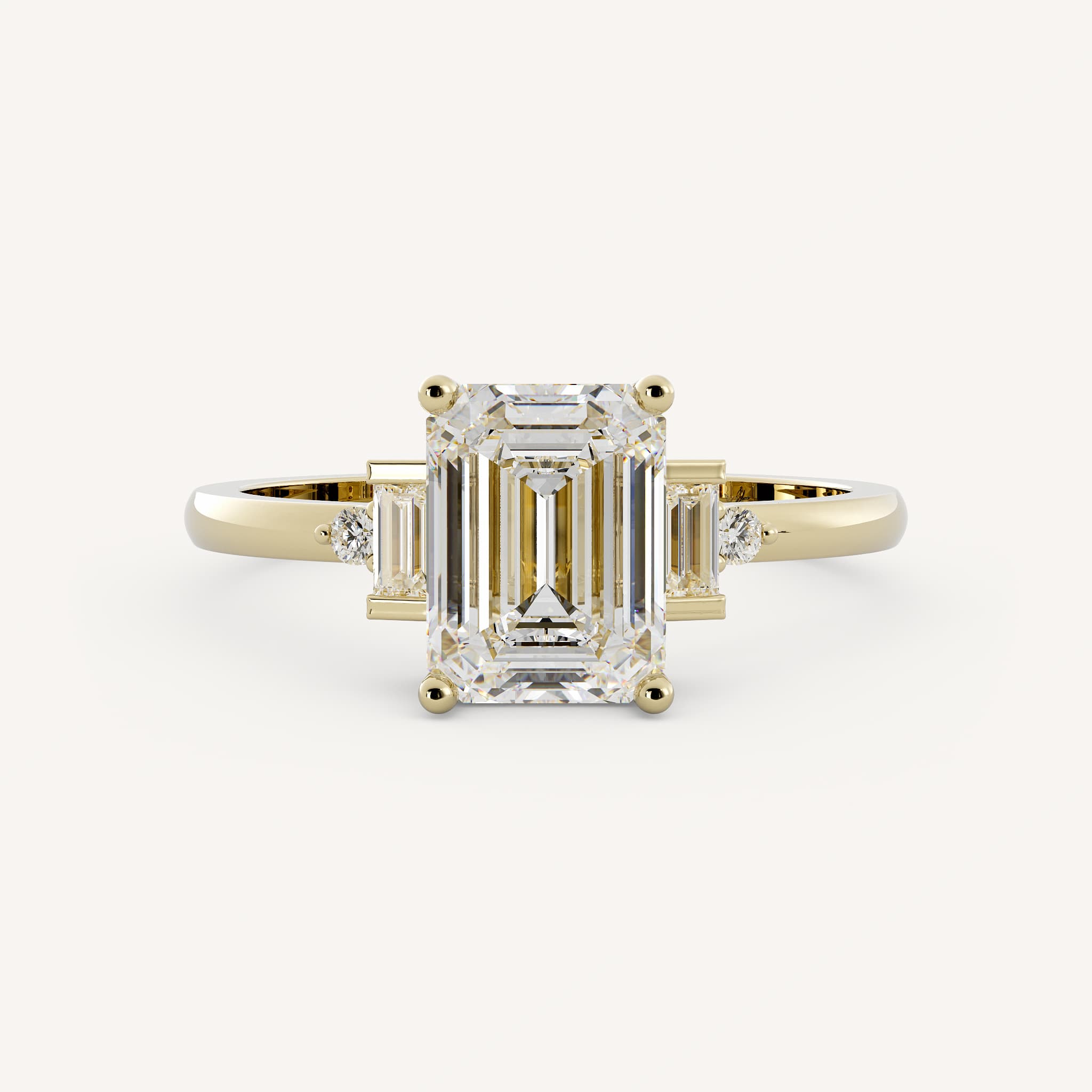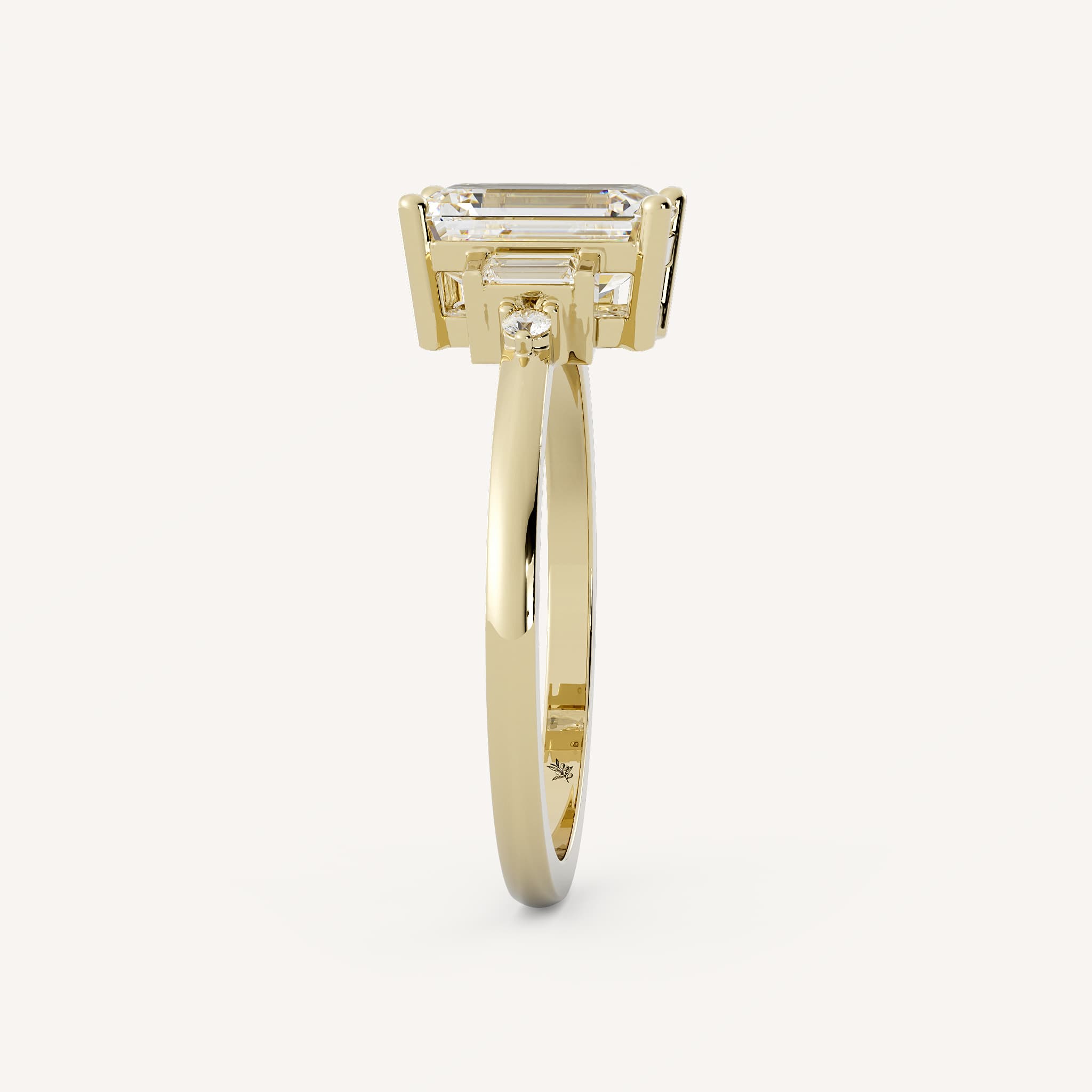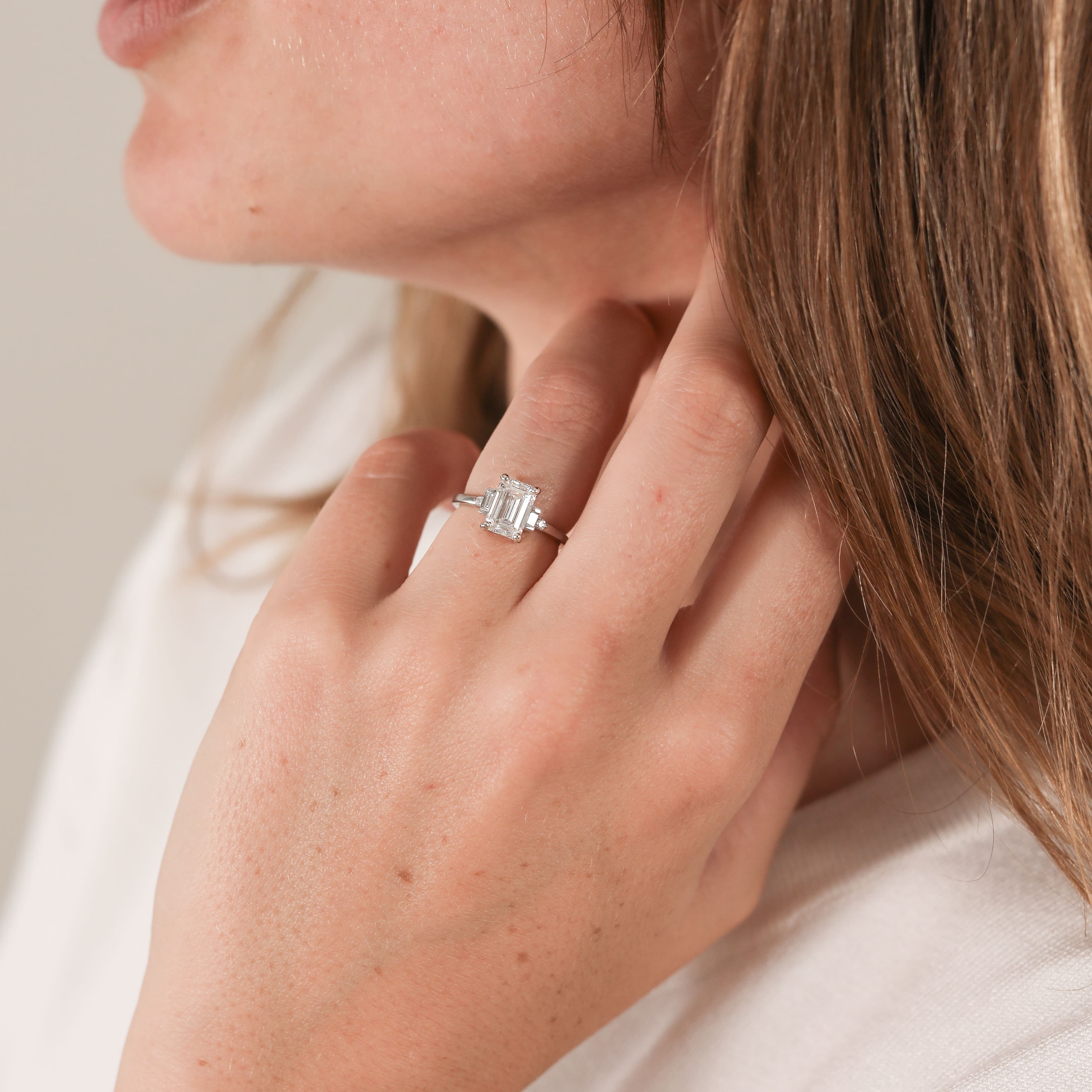 Quinn features an elegant emerald shaped center stone with round and baguette accent stones in a basket setting with a half round shank.