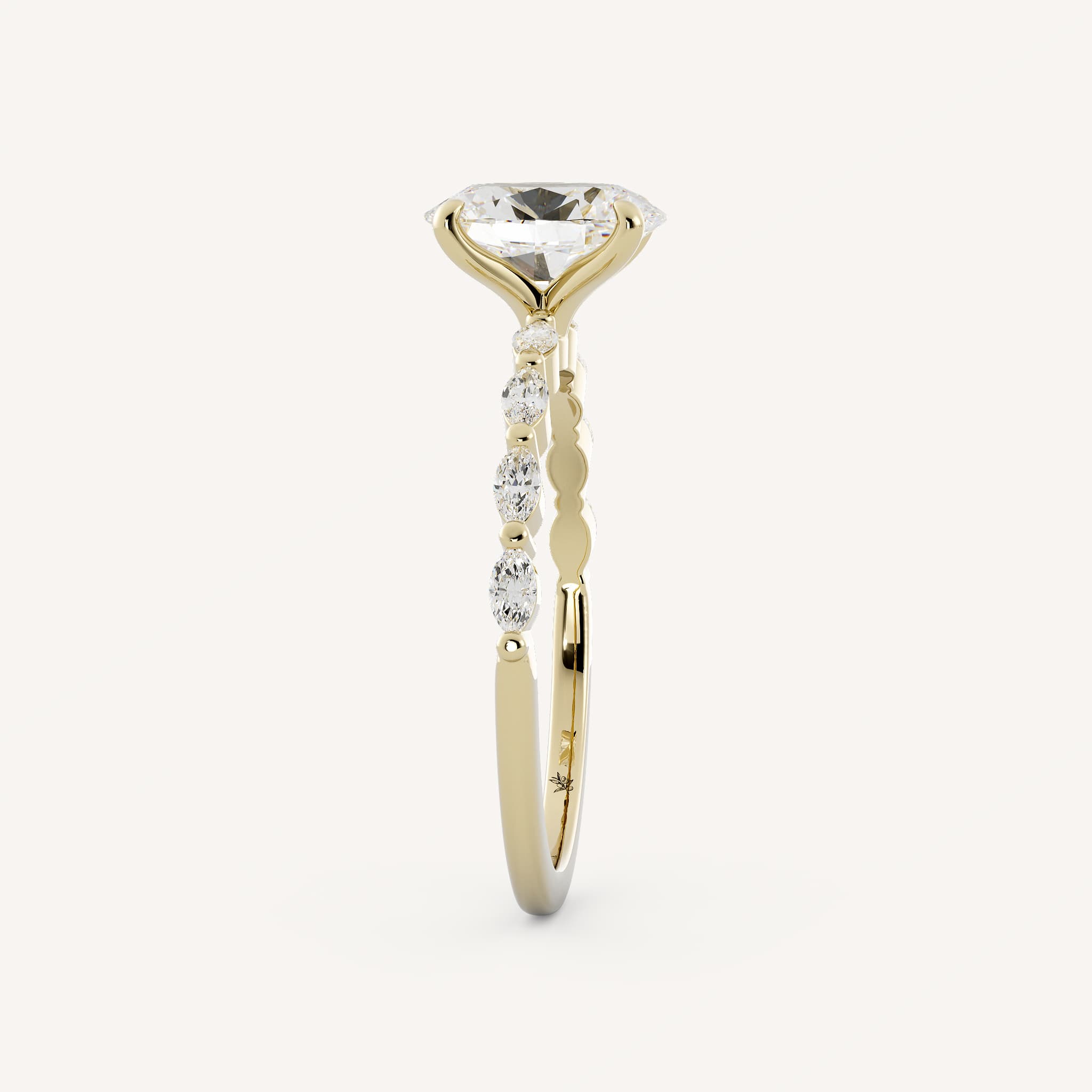 Sybil features a gorgeous oval center stone set in a traditional solitaire setting with a single shared prong marquise diamond shank.