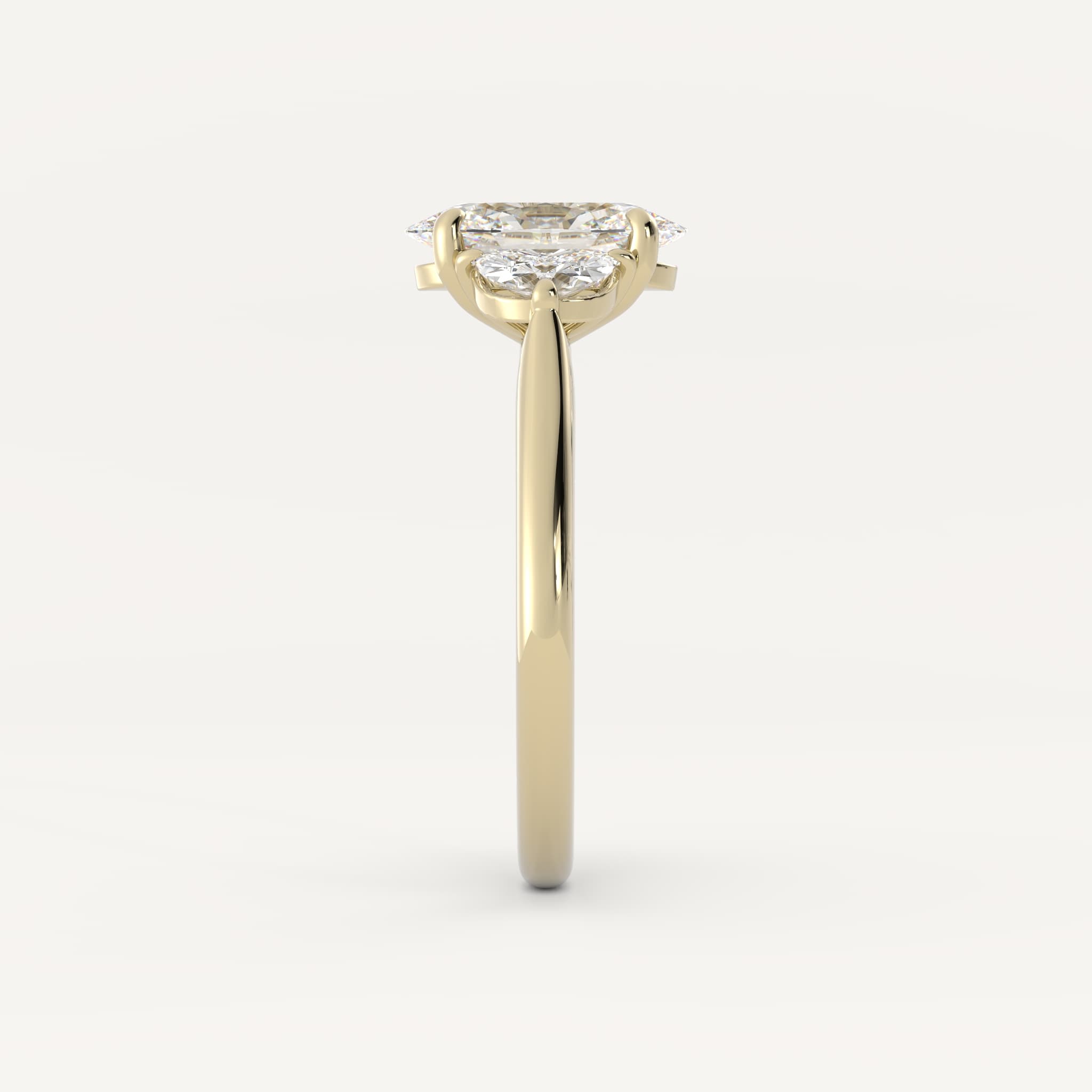 Teddy features a dramatic elongated oval center stone with moissanite half-moon accent stones set in a three-stone basket on a half-round shank.